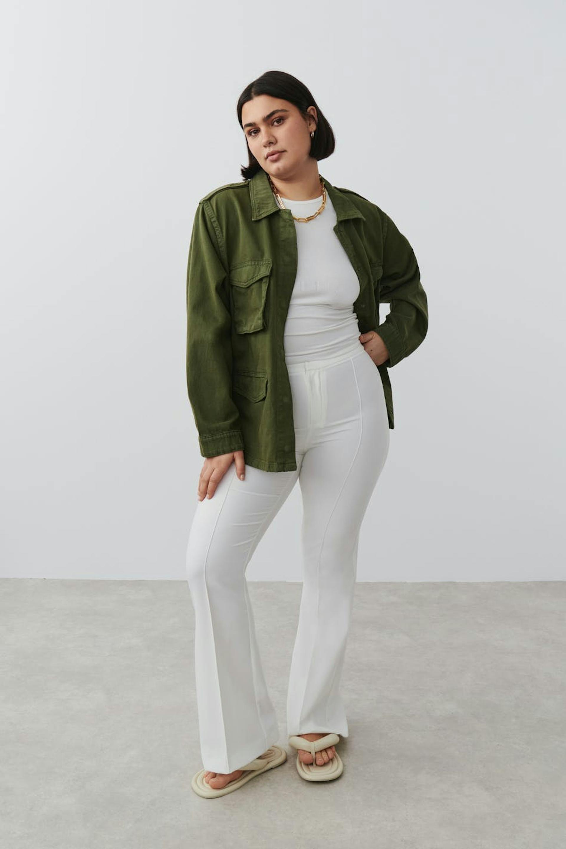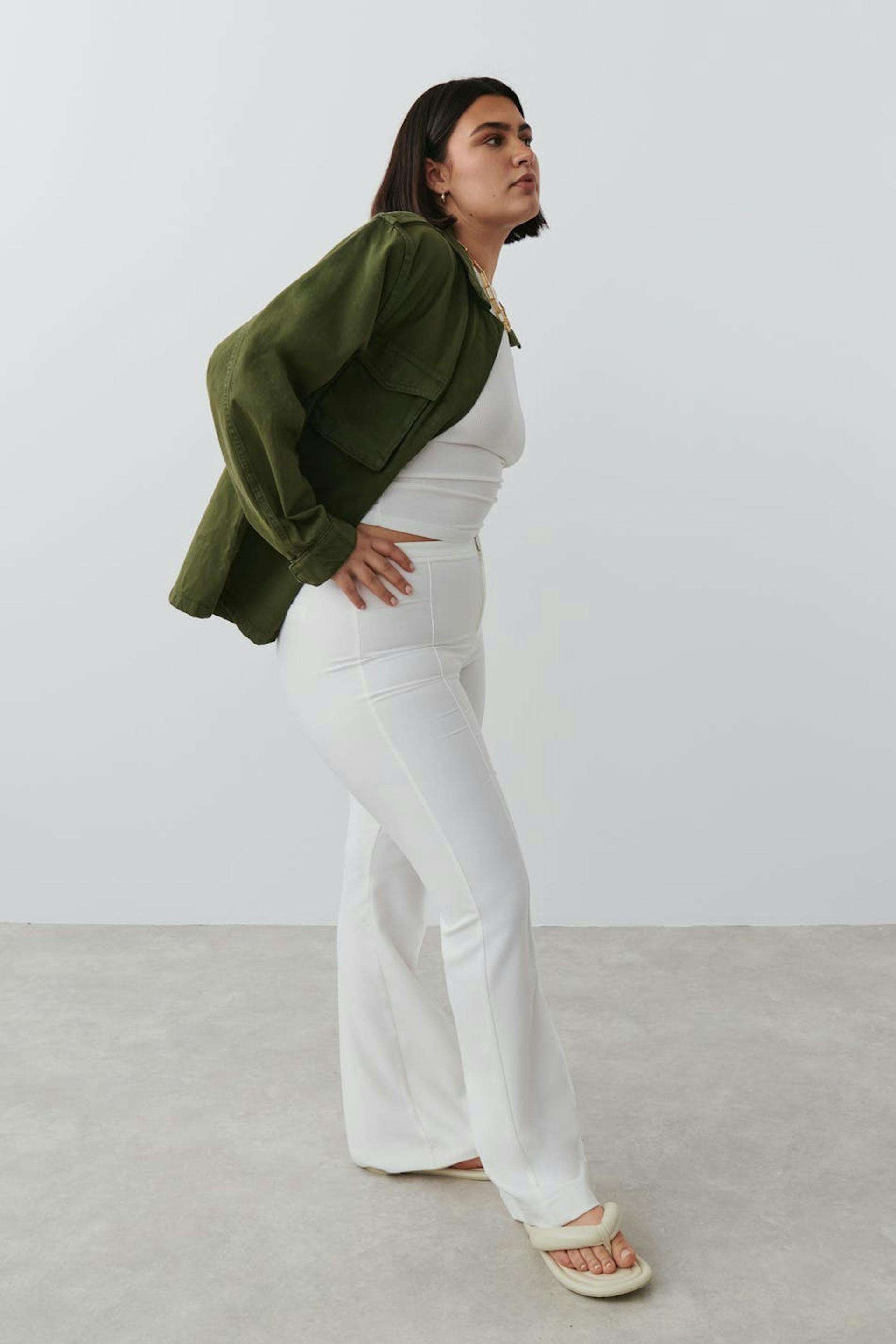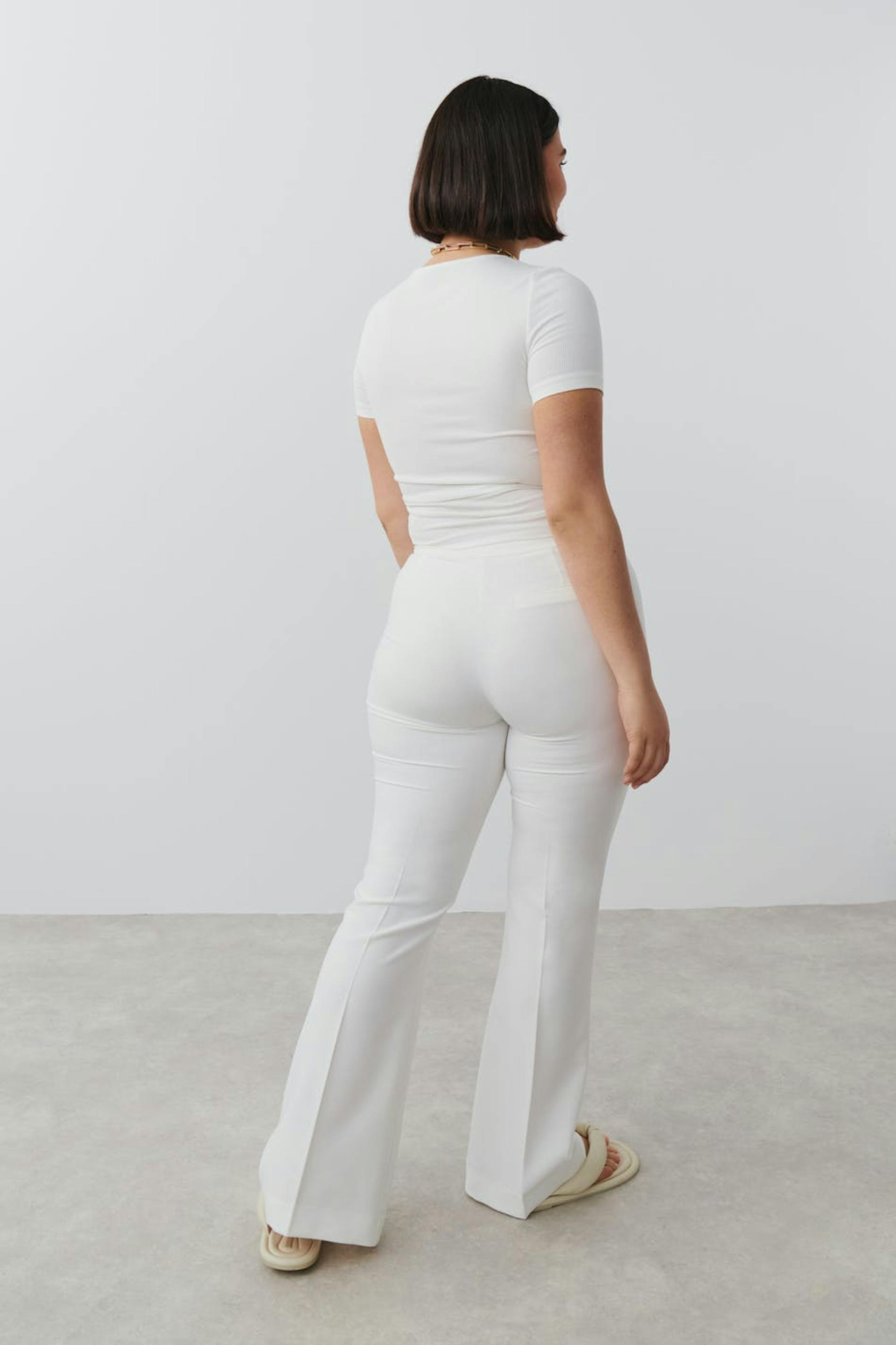 Trousers with a stretch and mid waist. The trousers are white and have slim fit. They have flared legs, side pockets, fake pockets at the back and zip fly.