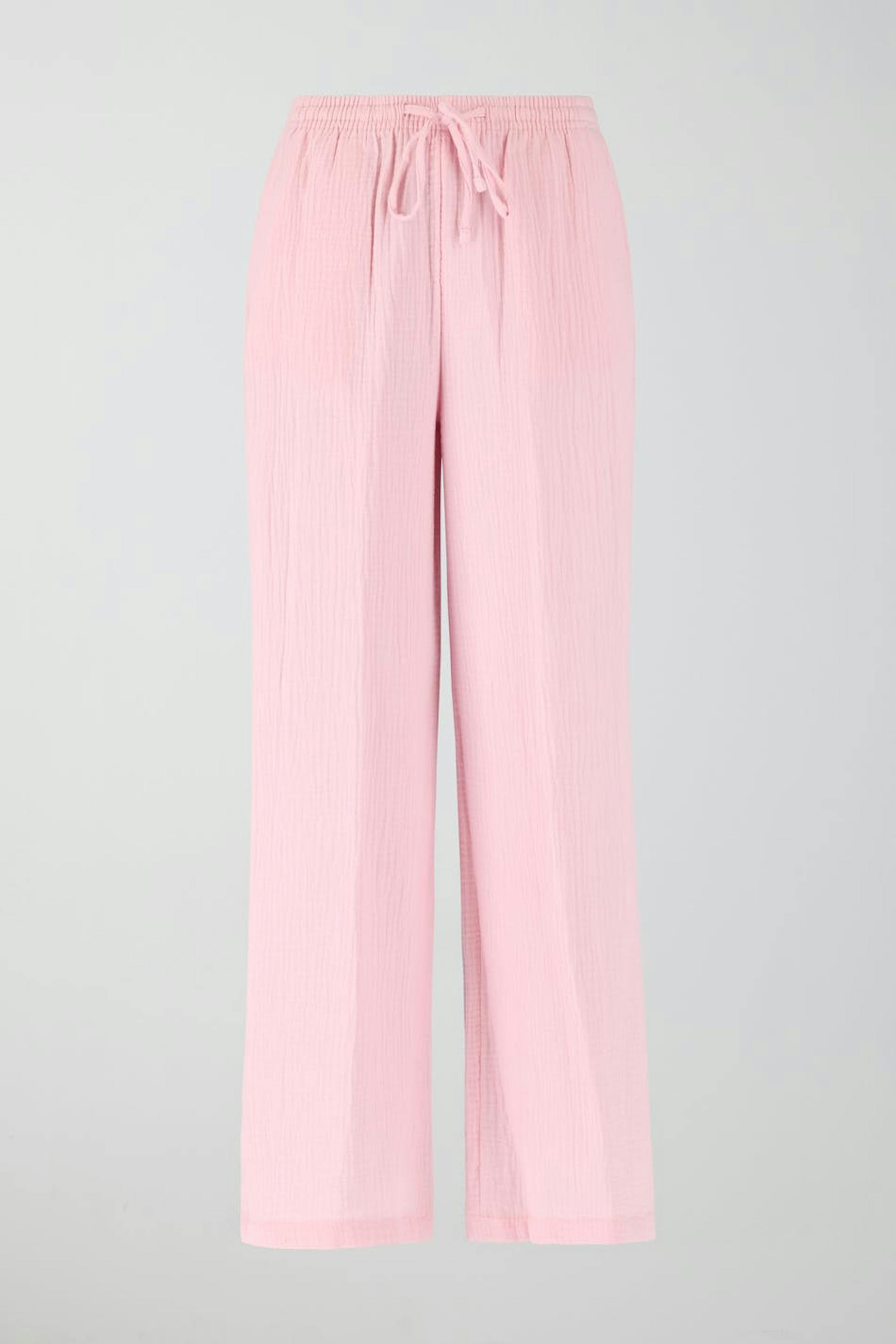 Woven trousers in soft cotton with high waist. The trousers are pink and have wide legs. They have elastic at the waist with self-tie at the front. Perfect for those who are 175 cm (5 ft 9 in.) or taller.