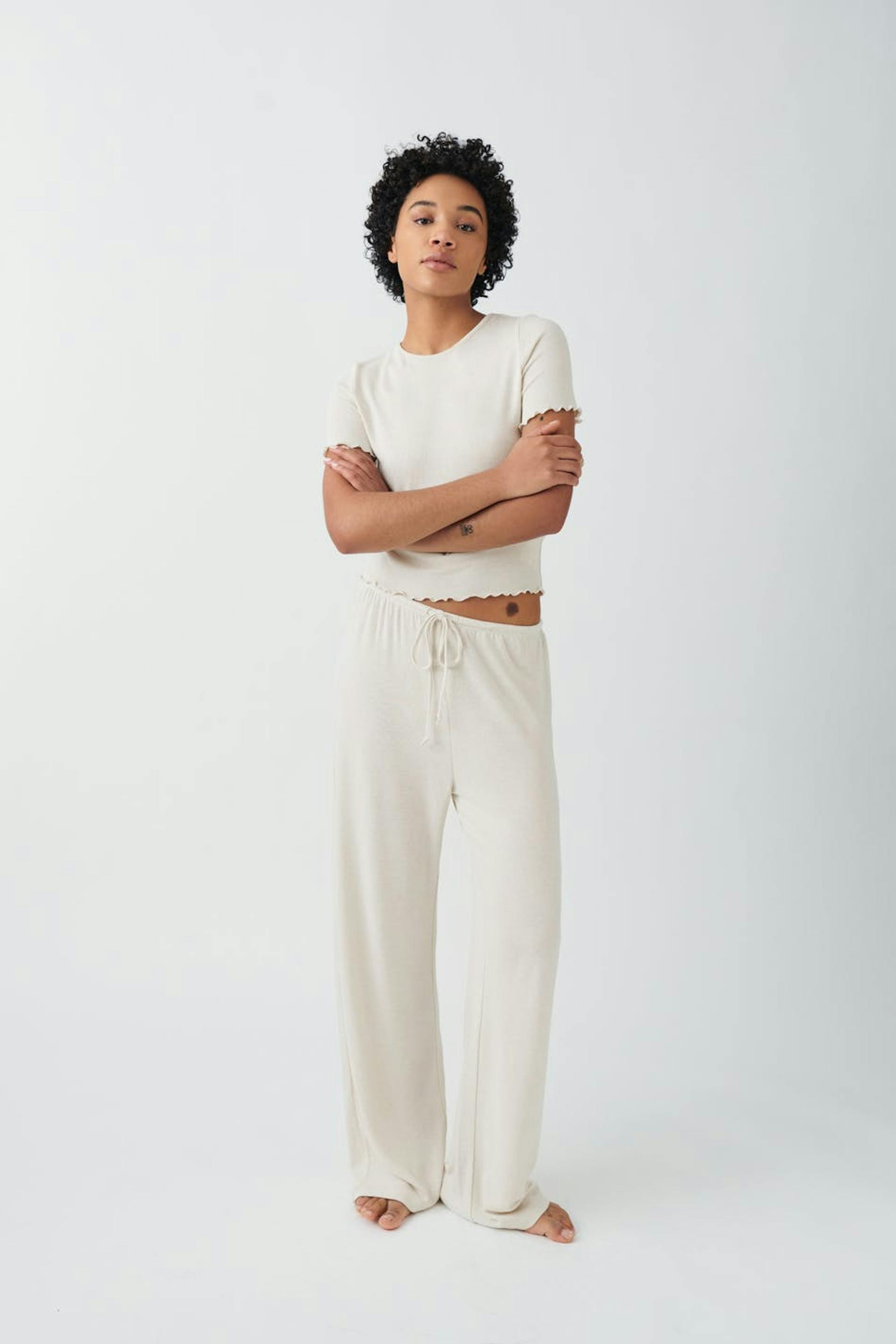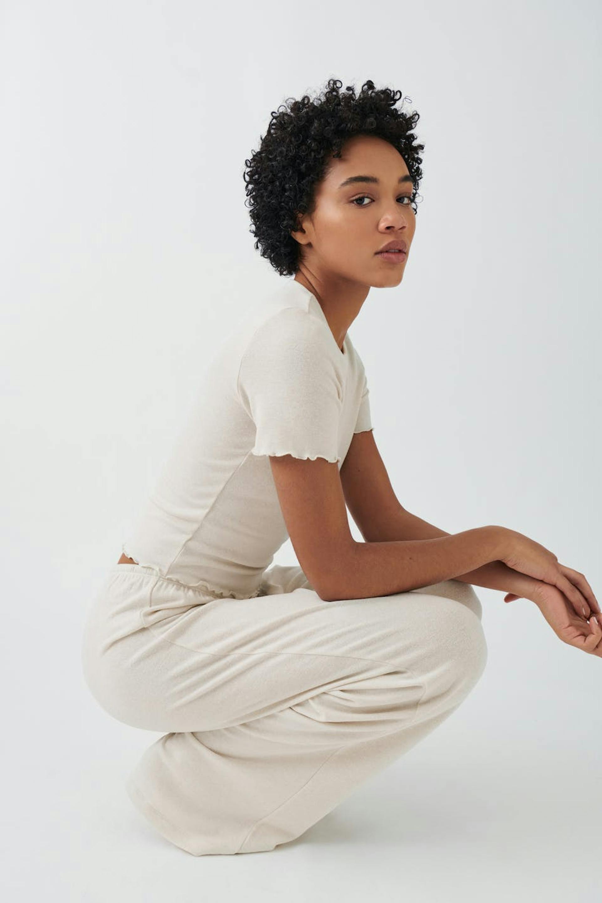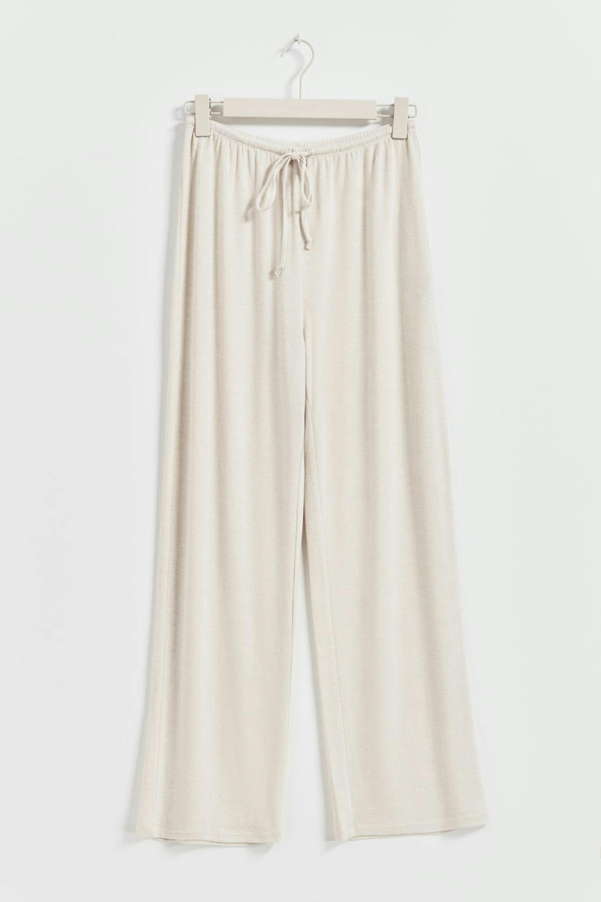 Wide trousers with self-tie drawstring at the waist. The trousers are beige.