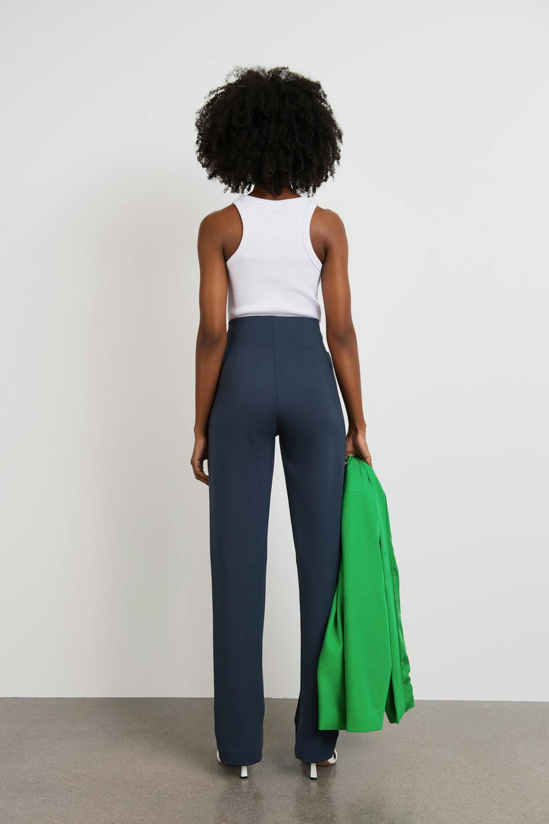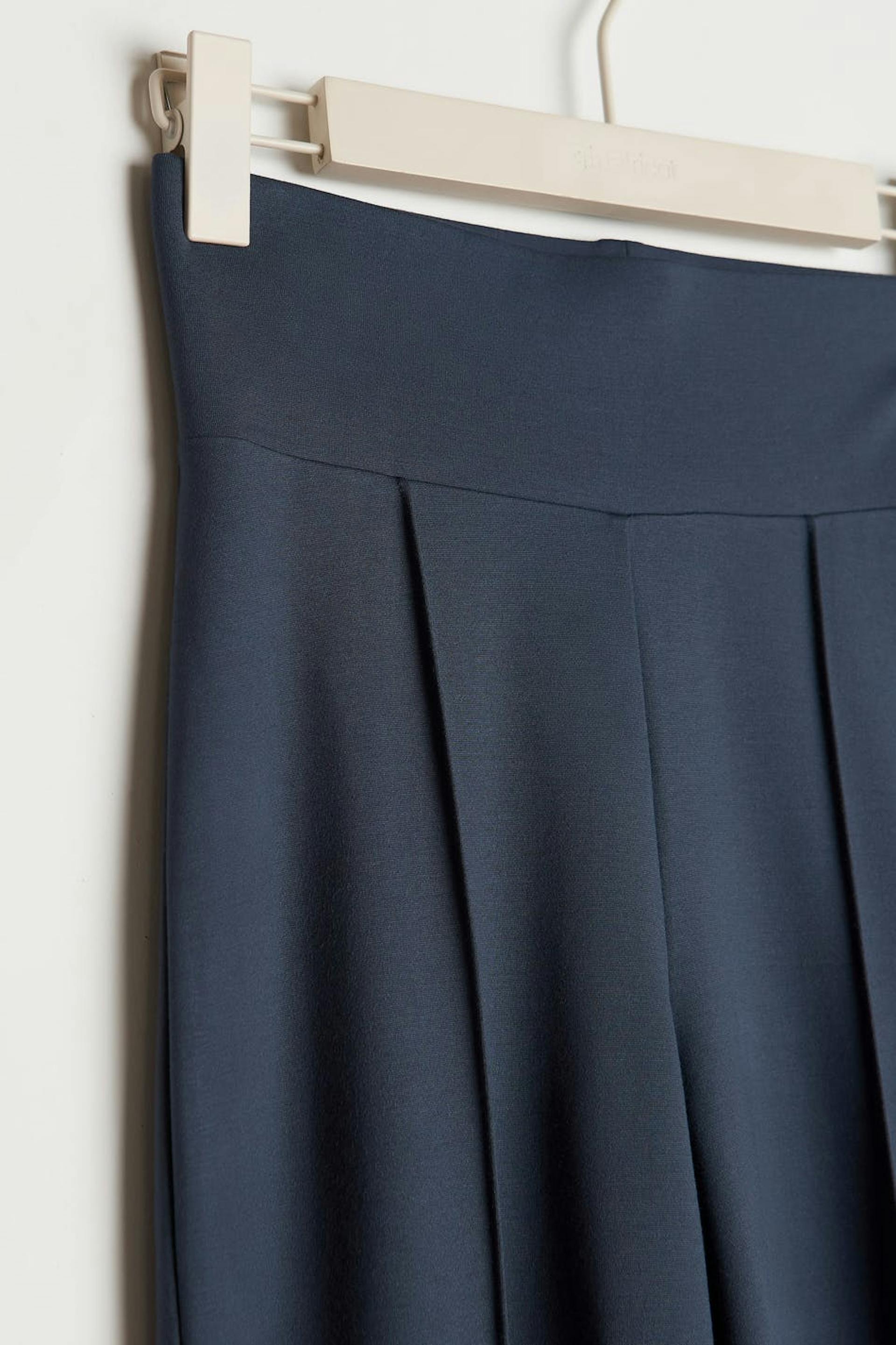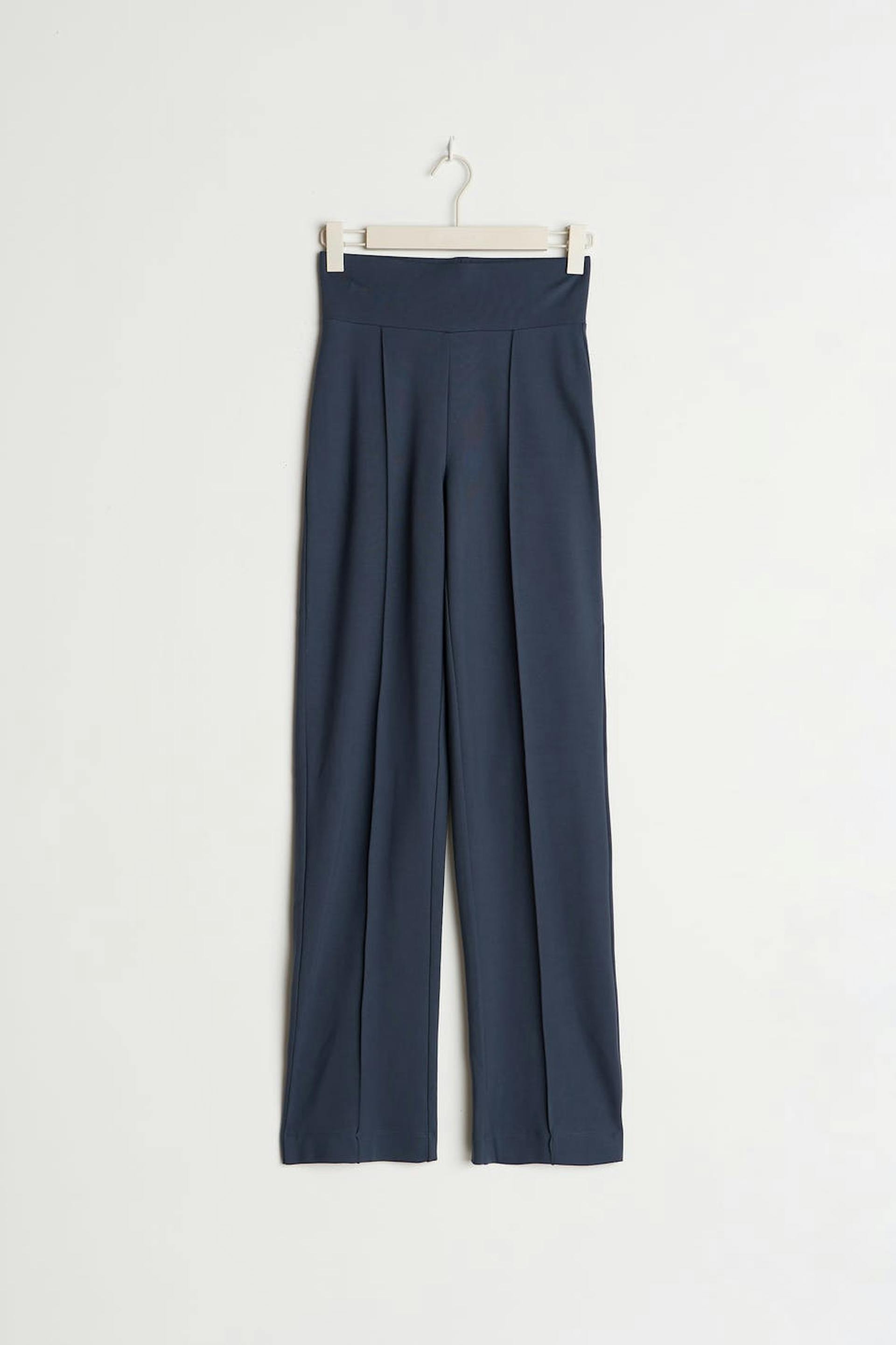 Suit trousers with a slim fit. The trousers are blue and have creases along each leg. They have a high waist, a hidden zip in the side seam and wide trouser legs with a full length.