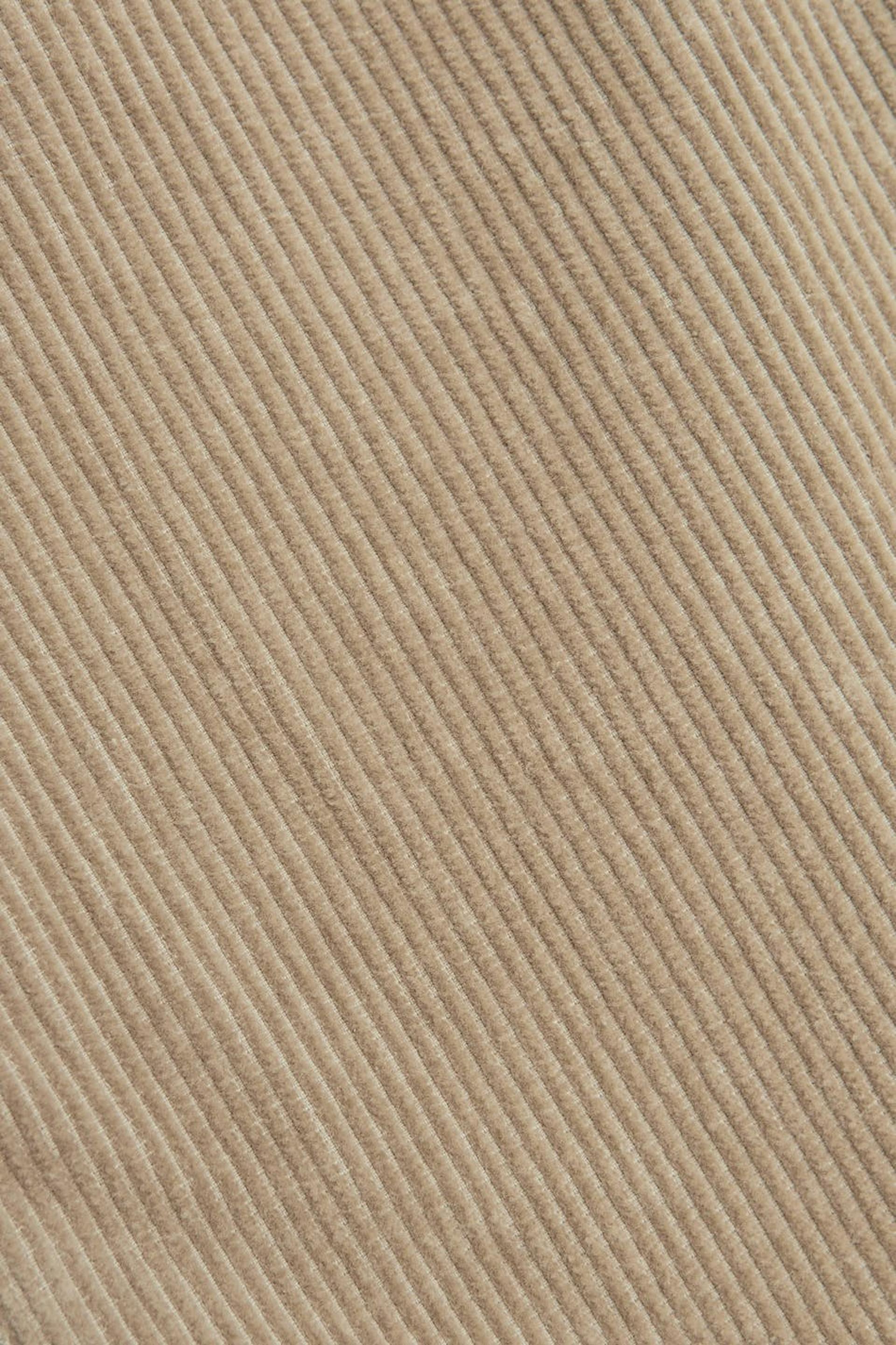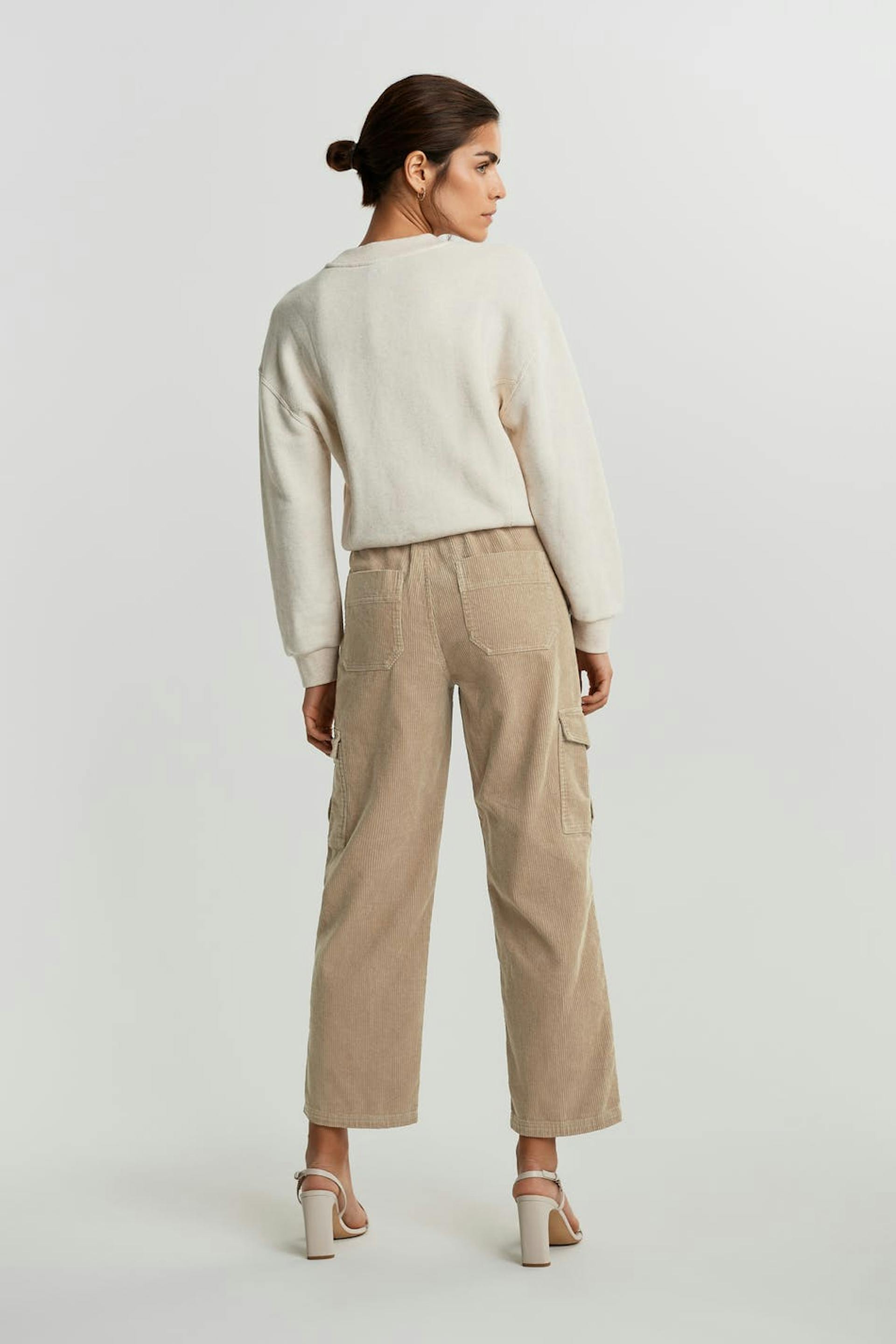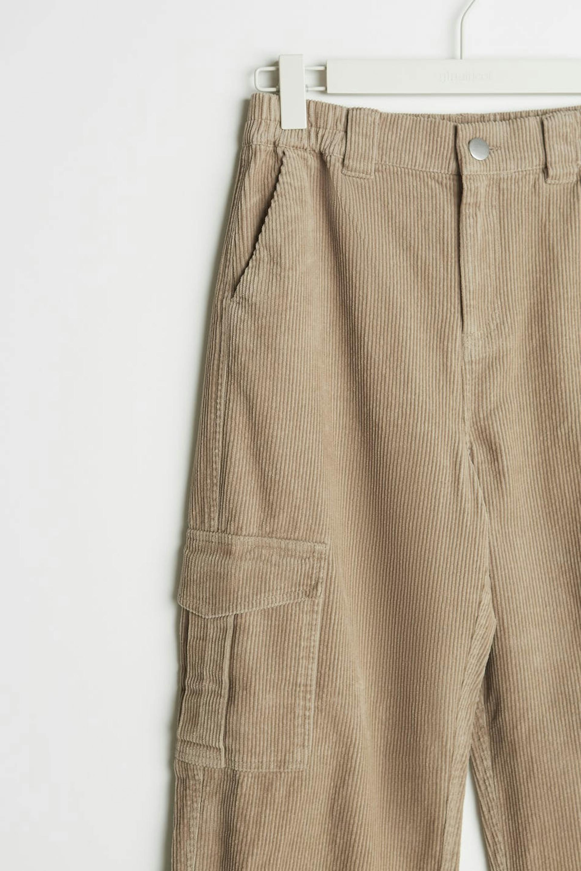 Trousers with wide leg trousers. The trousers are beige and have a straight fit. They are made of corduroy and have pockets.