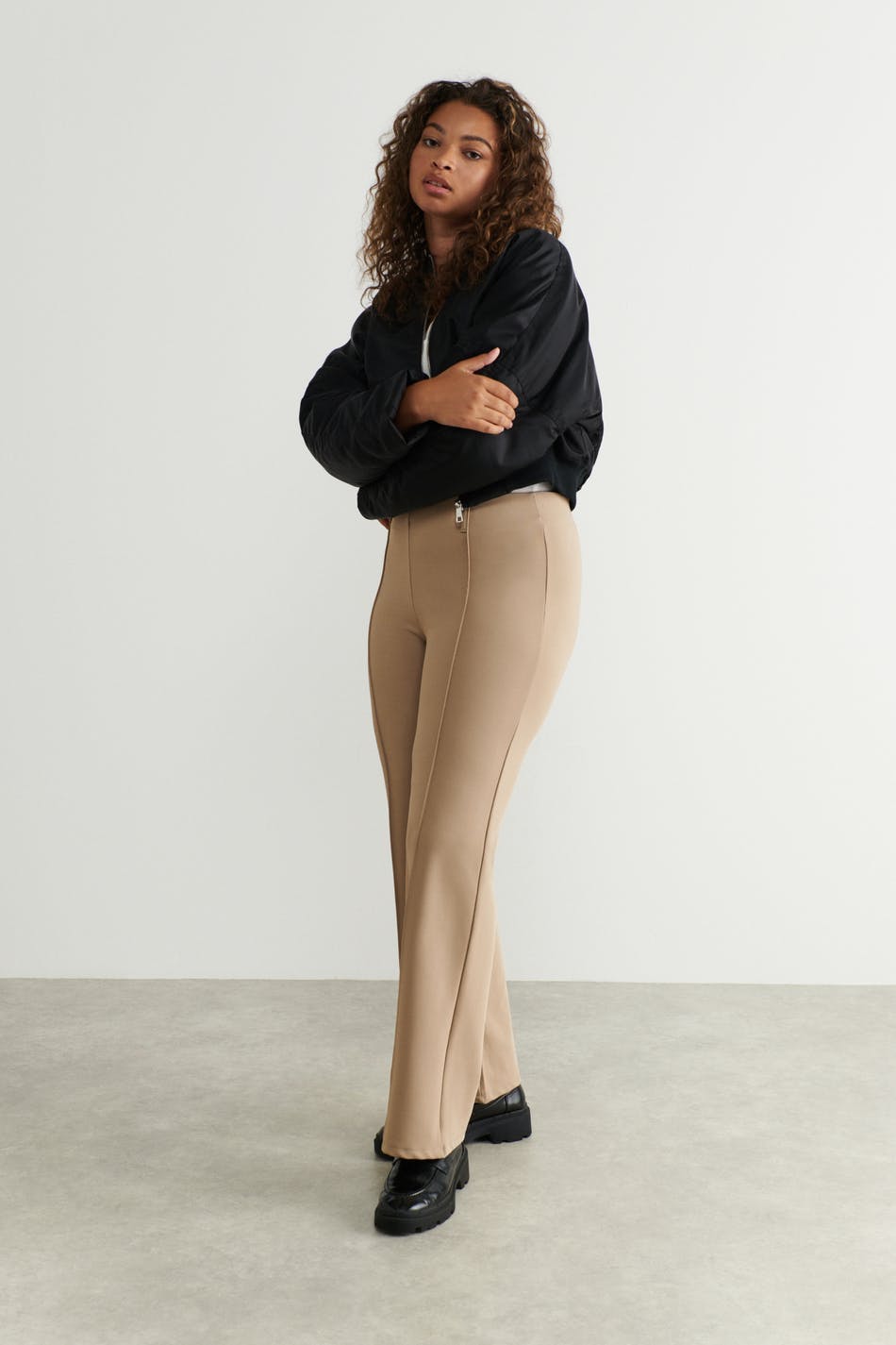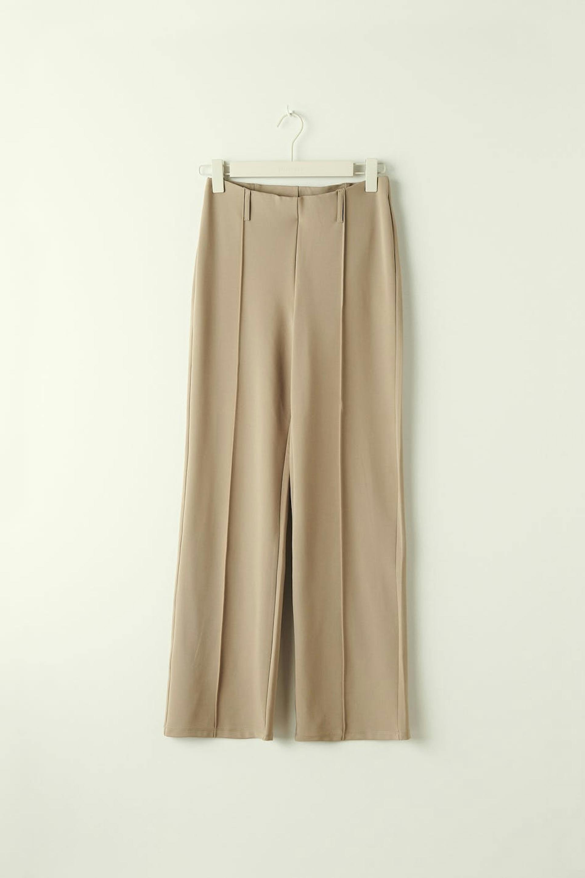 Flared trousers in jersey with elastic at the waist. The trousers are beige and have slit pockets at the back.