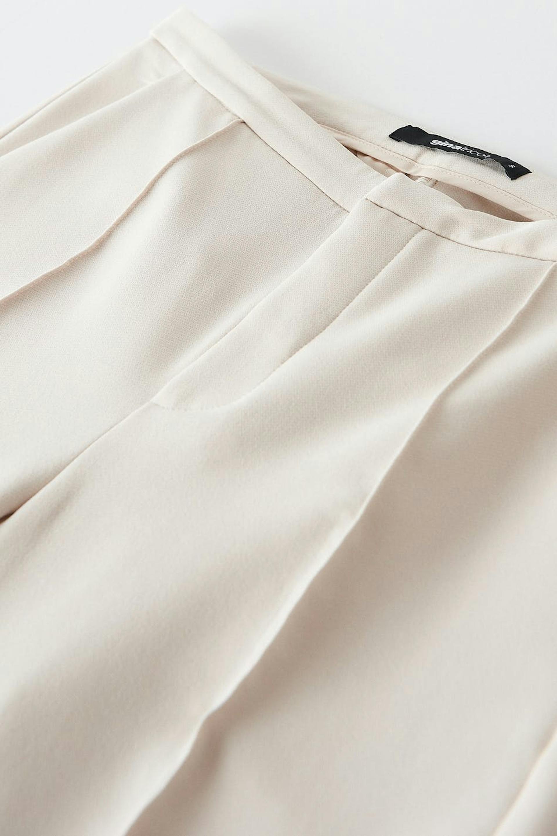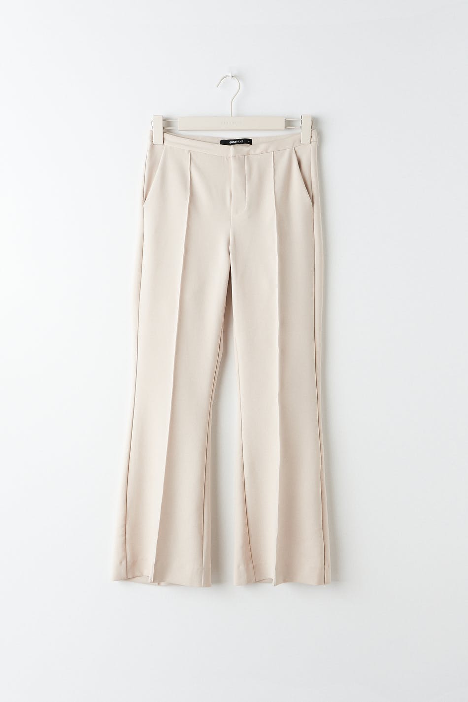 Petite trousers with slim fit. The trousers are beige and have high waist. They have cropped, wide legs, fake pockets at the back, zip at the front and slit at hem. Perfect for those who are 160 cm (5 ft 3 in.) or shorter.
