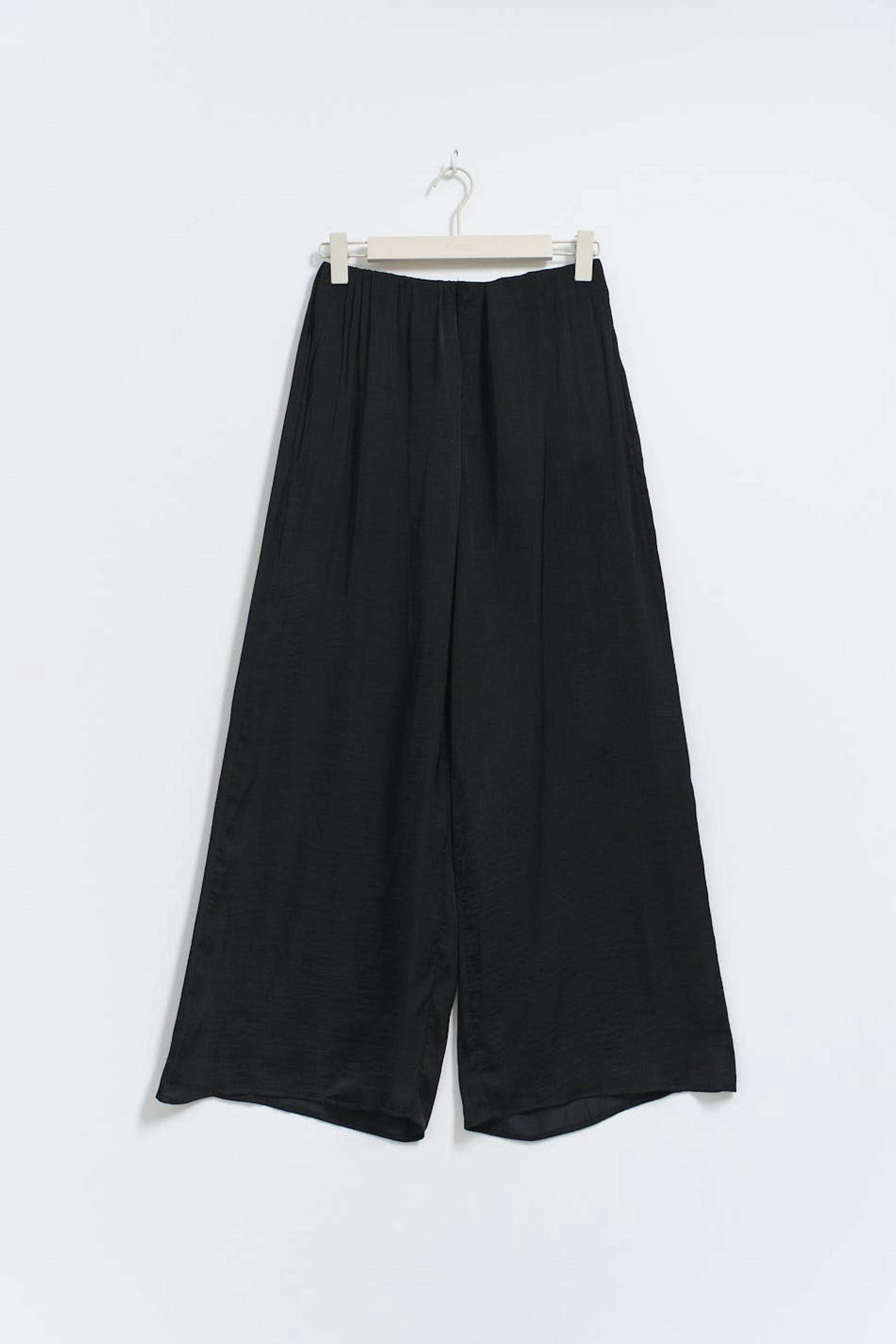 Wide trousers in satin with loose-fitting style. The trousers are black and have pleat details at the top. They have side pockets, elastic at the waist and shorter leg length. Perfect for those who are 160 cm (5 ft 3 in.) or shorter.