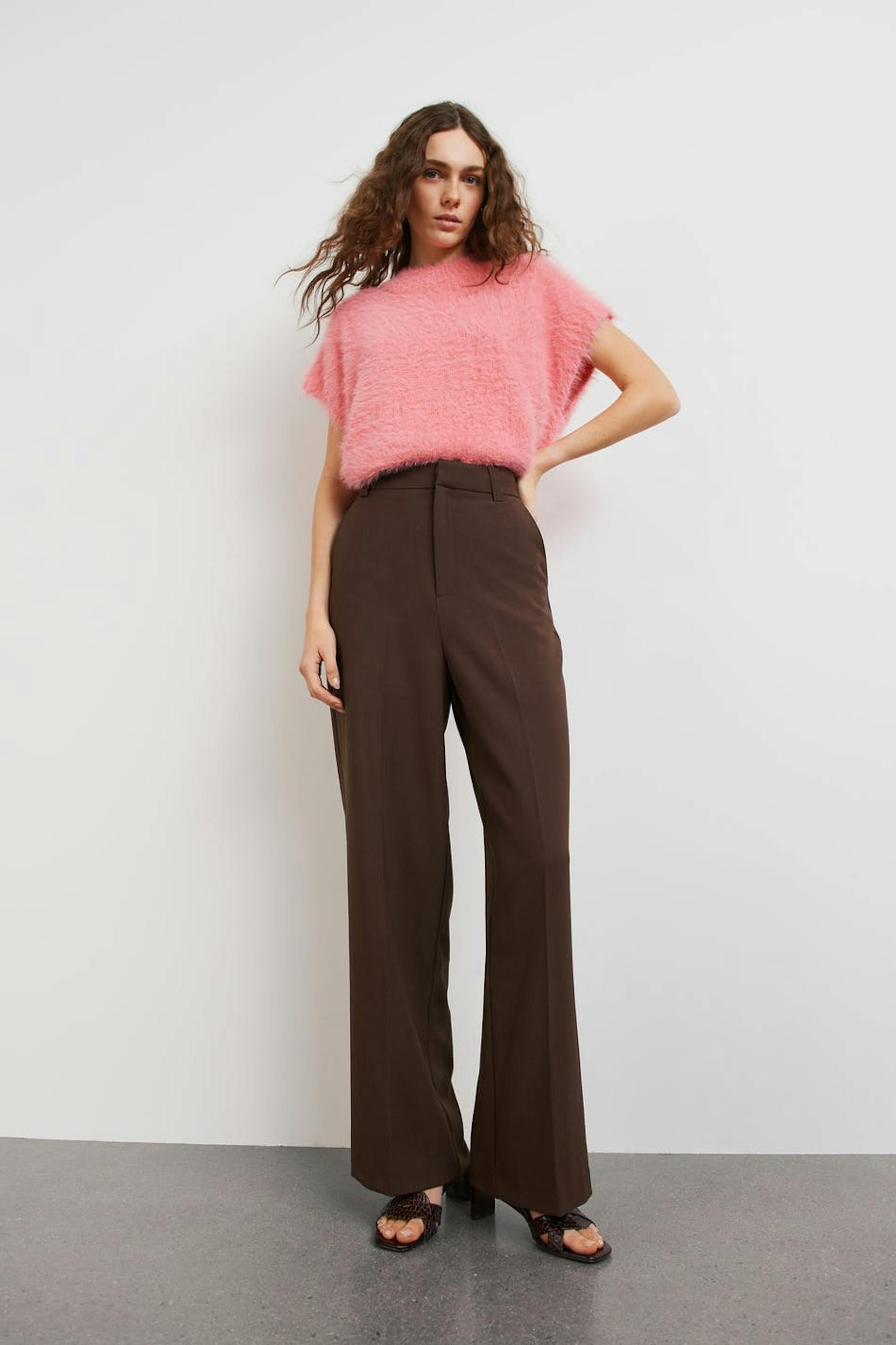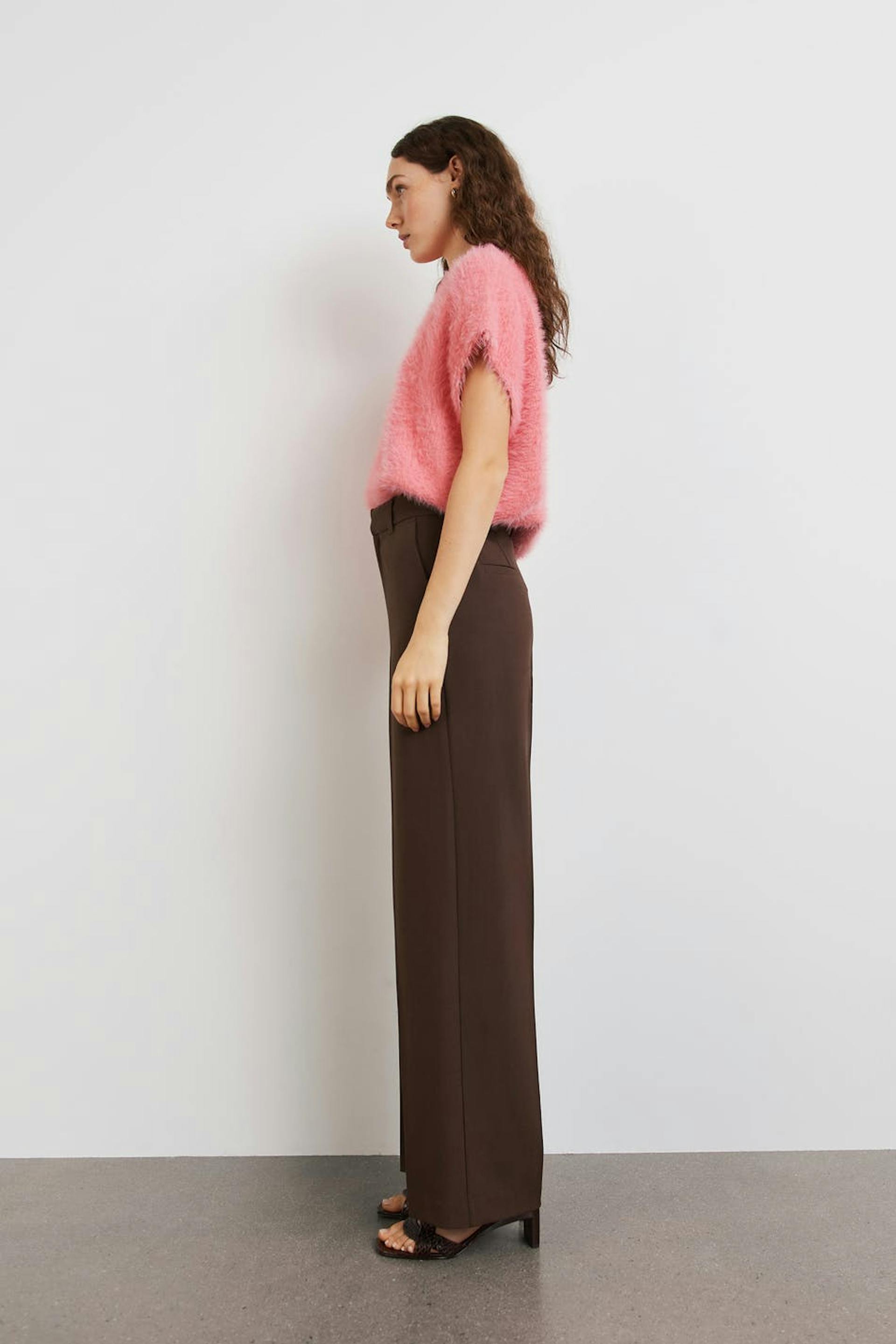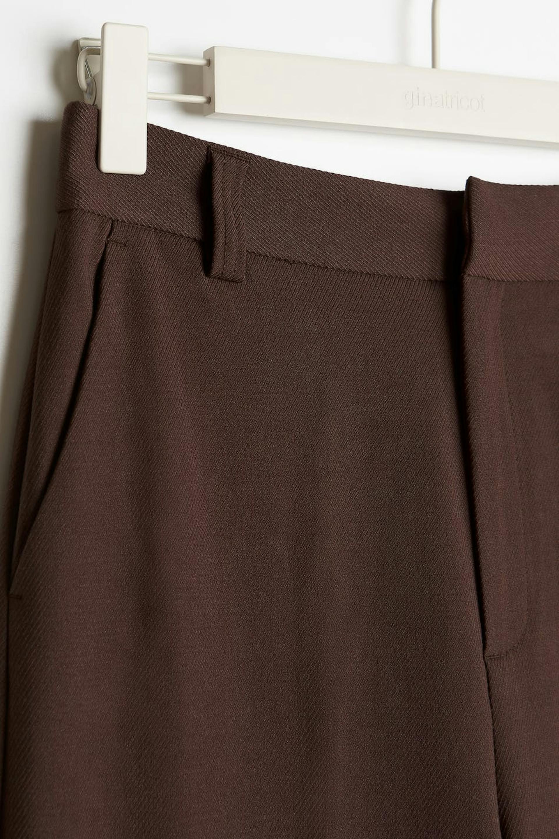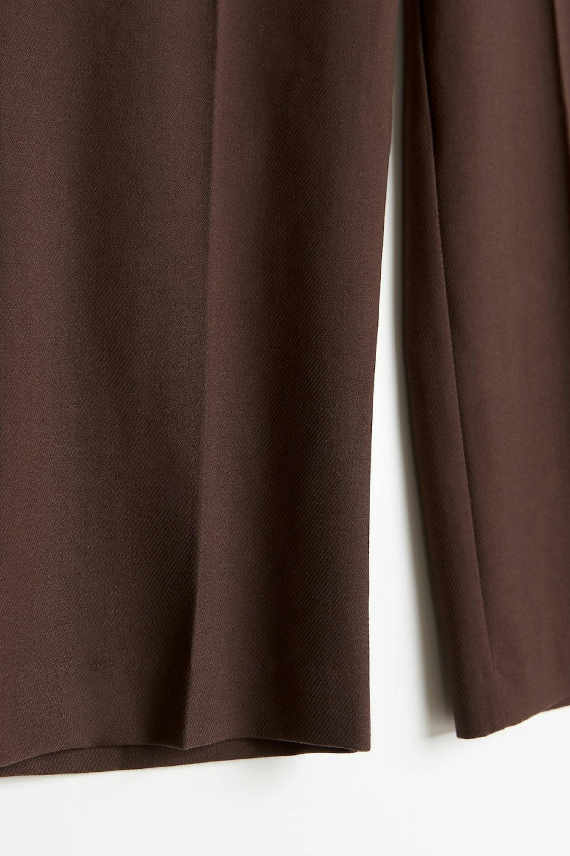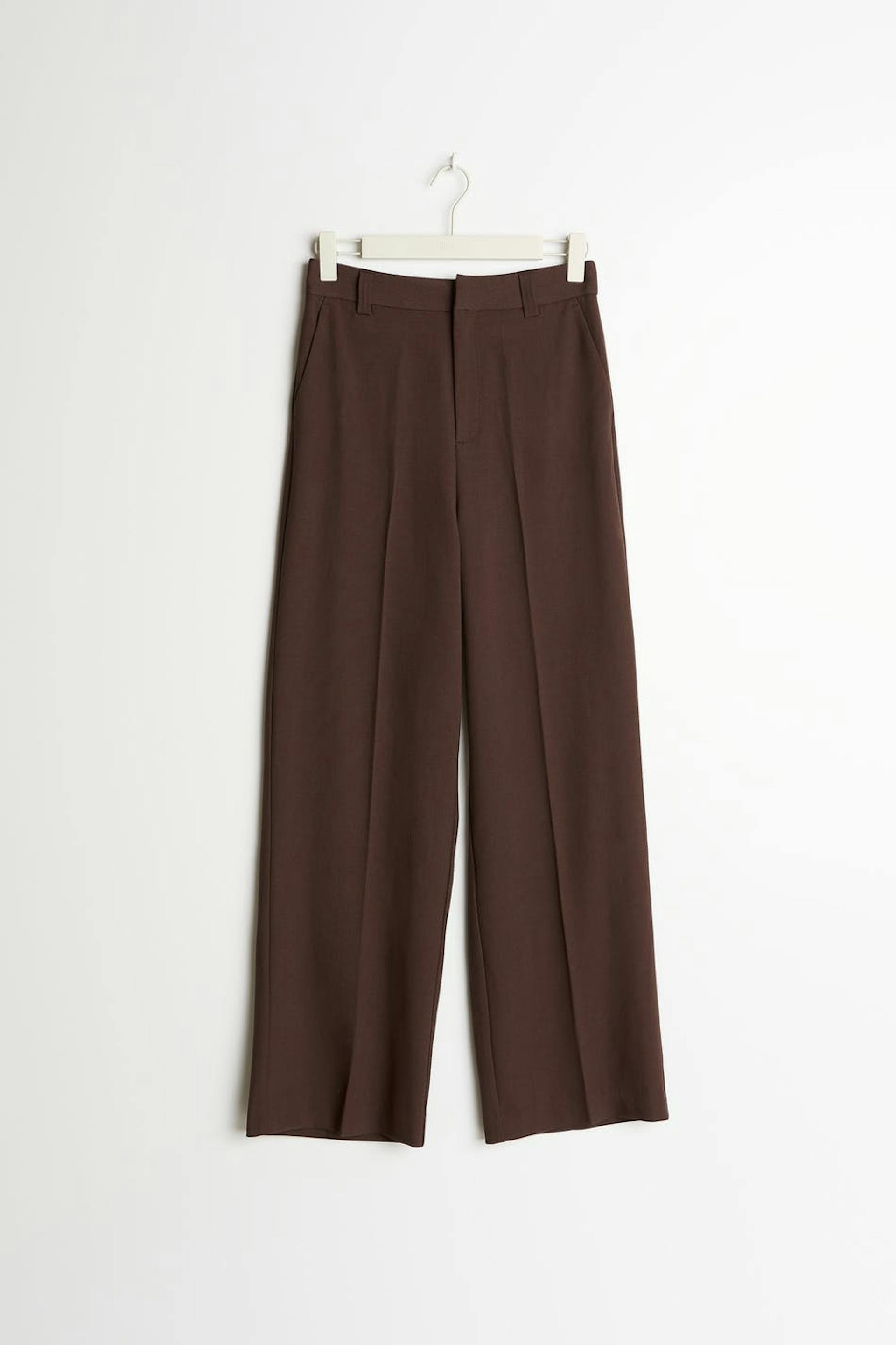 Wide suit trousers with crease. The trousers are brown and have a woven quality. They have side pockets, waistband with belt loops, fly with zipper and slit pockets at the back.