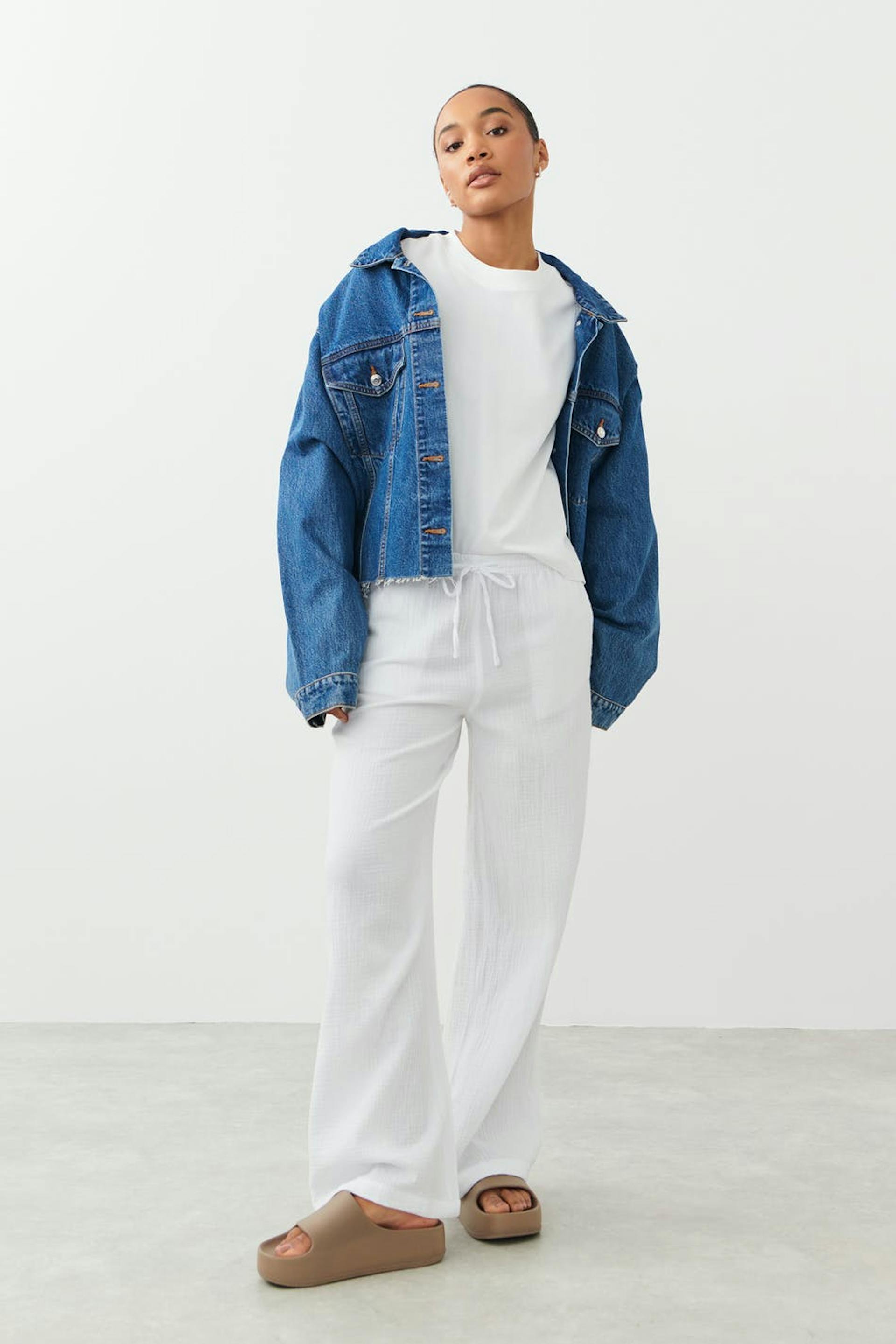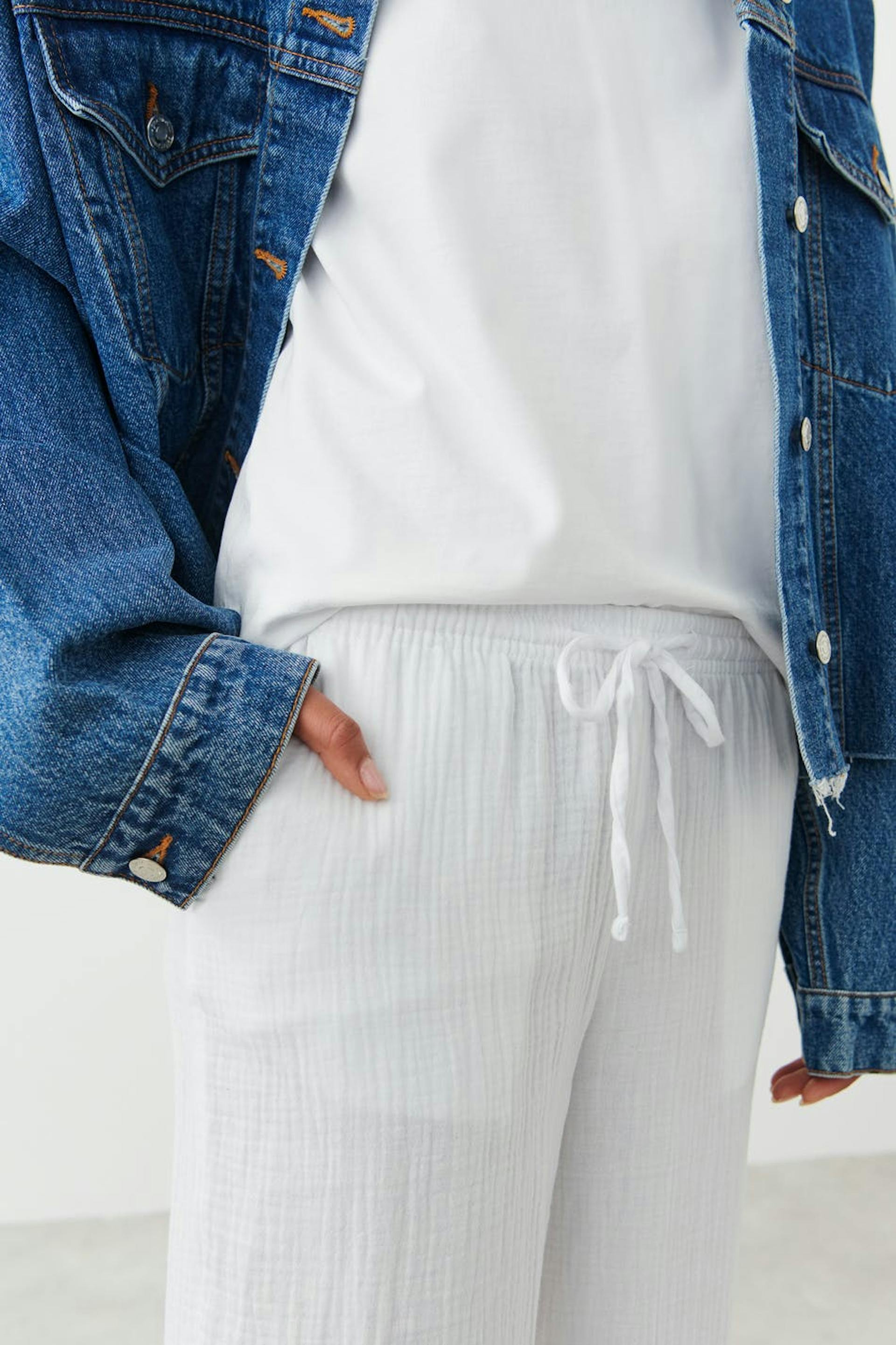 Woven trousers in soft cotton with high waist. The trousers are white and have wide legs. They have side pockets and elastic at the waist with self-tie at the front.
