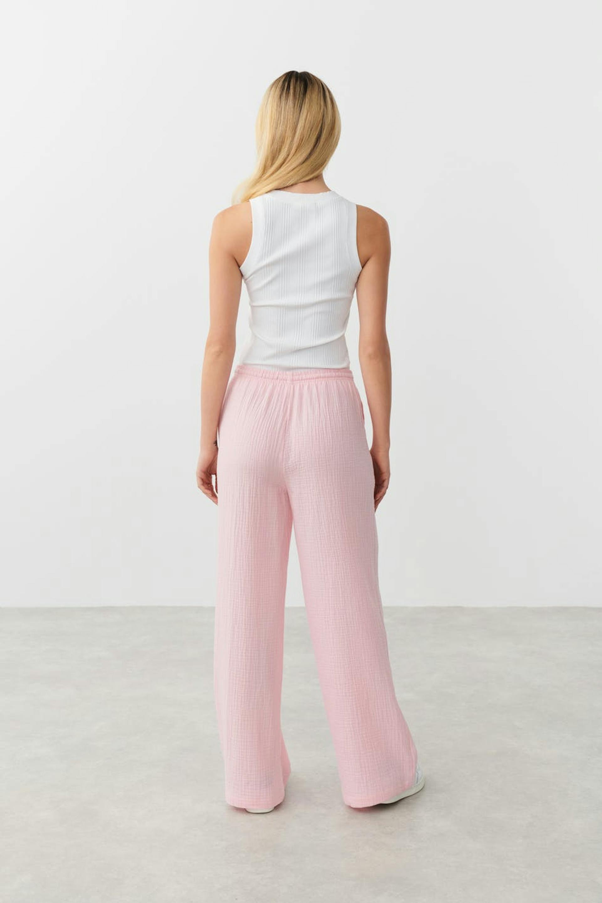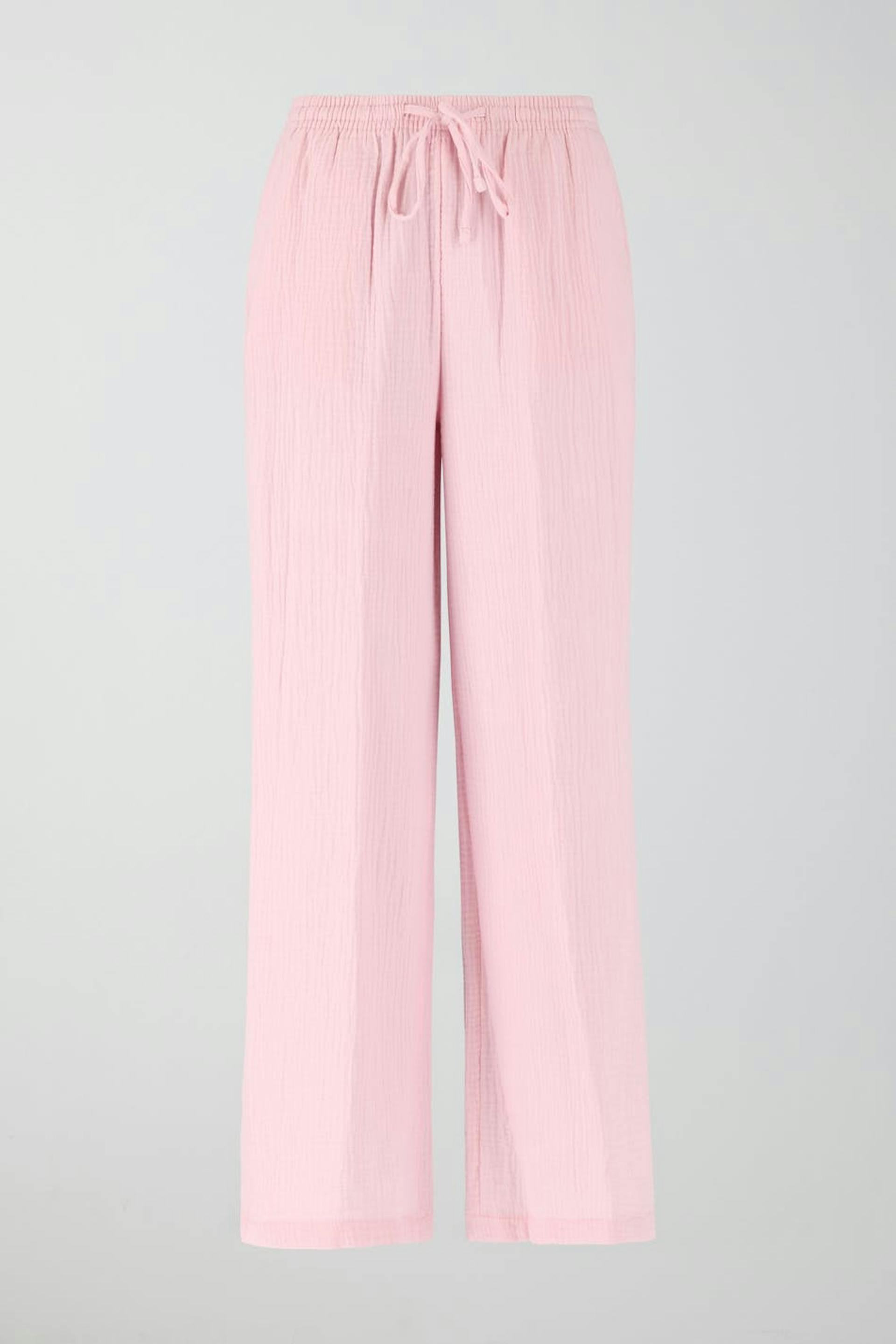 Woven trousers in soft cotton with high waist. The trousers are pink and have wide legs. They have side pockets and elastic at the waist with self-tie at the front.