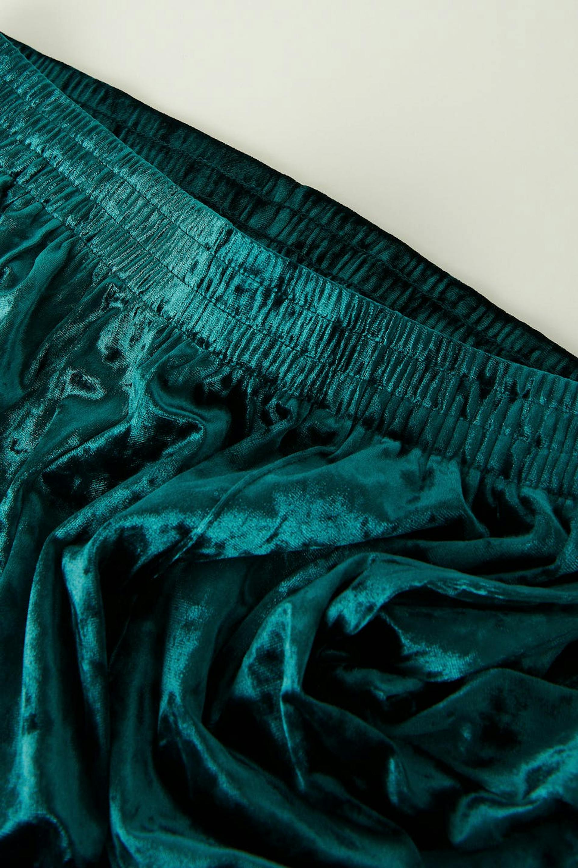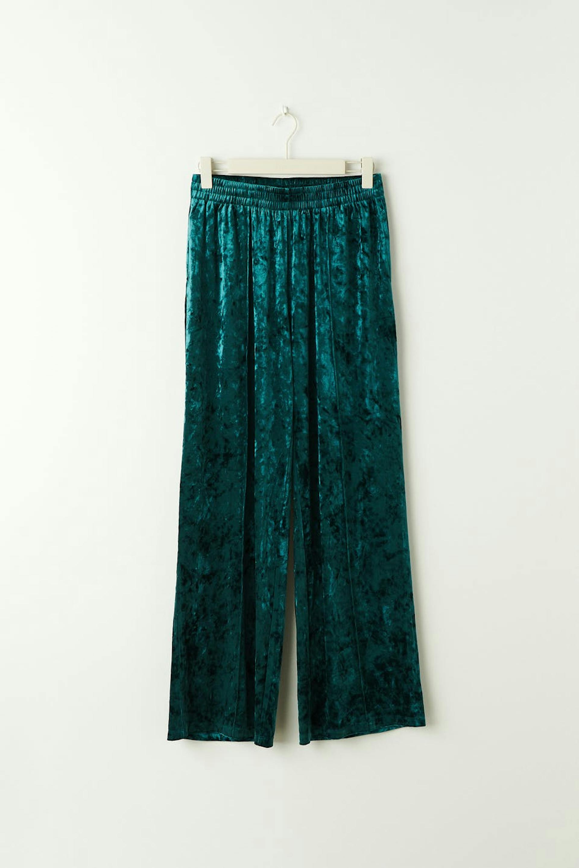 Velvet trousers with side pockets. The velvet trousers are green and have wide legs with full length. They have elastic at the waist and pintucks at the front.