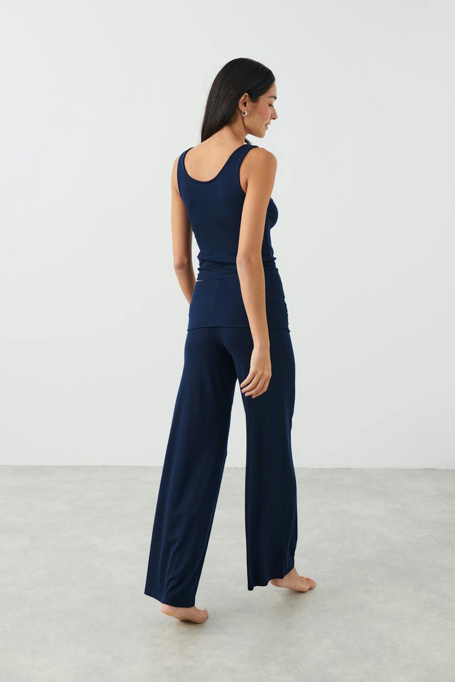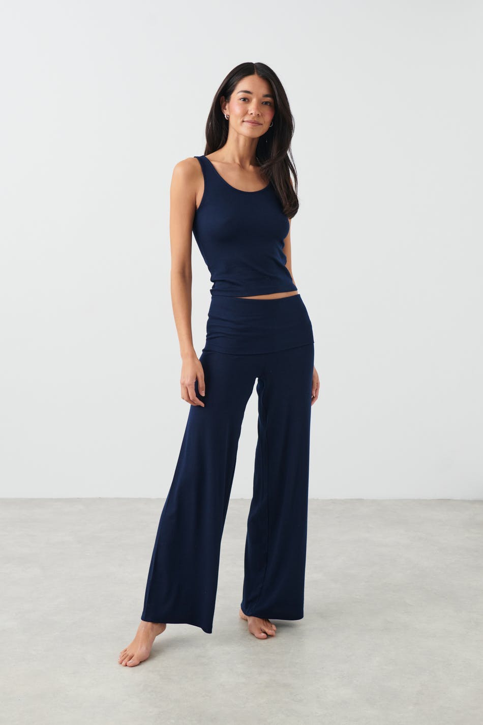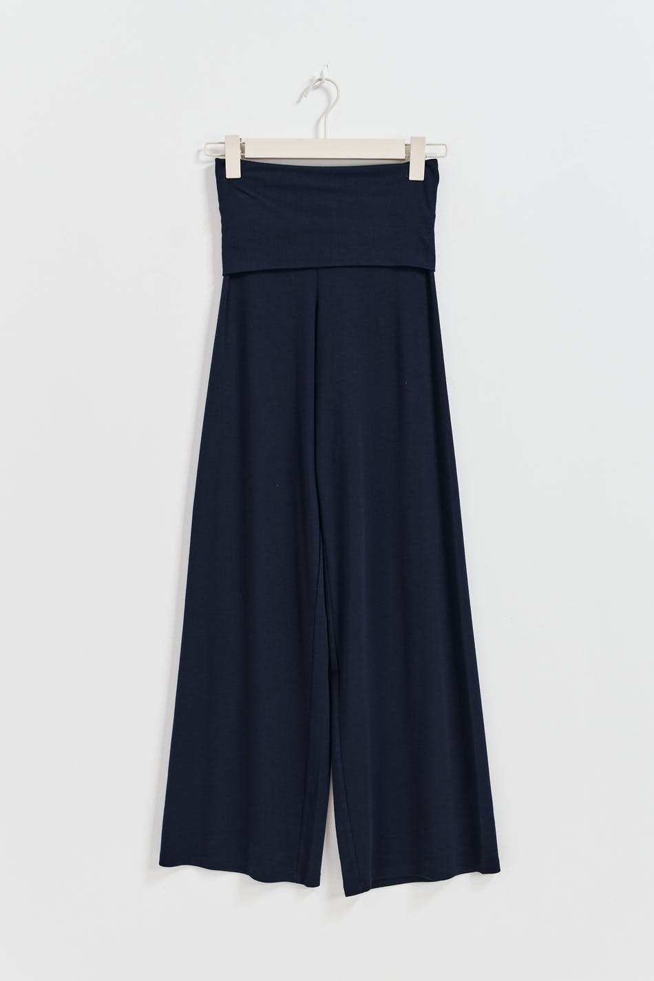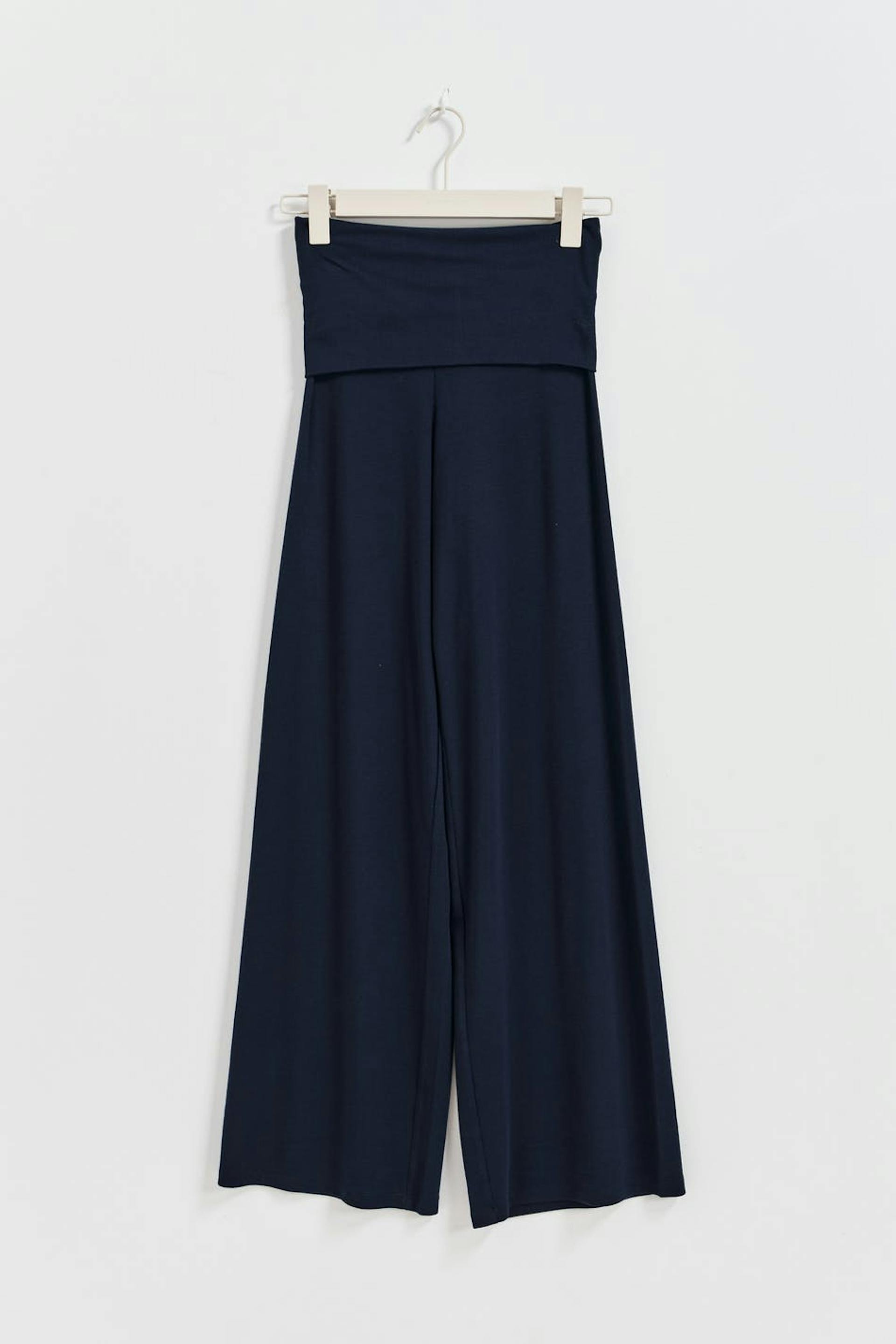 Yoga pants with turn-down waistband. The trousers are blue and have ribbed quality.