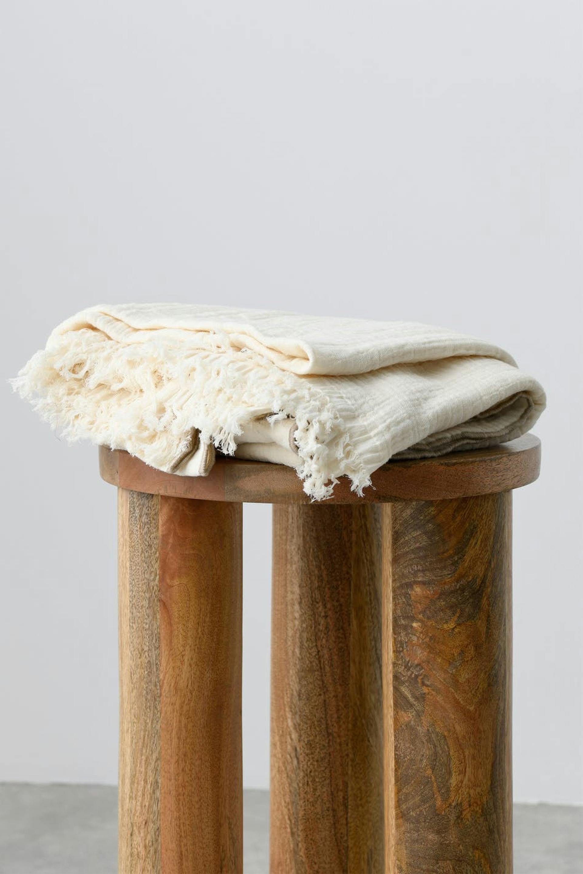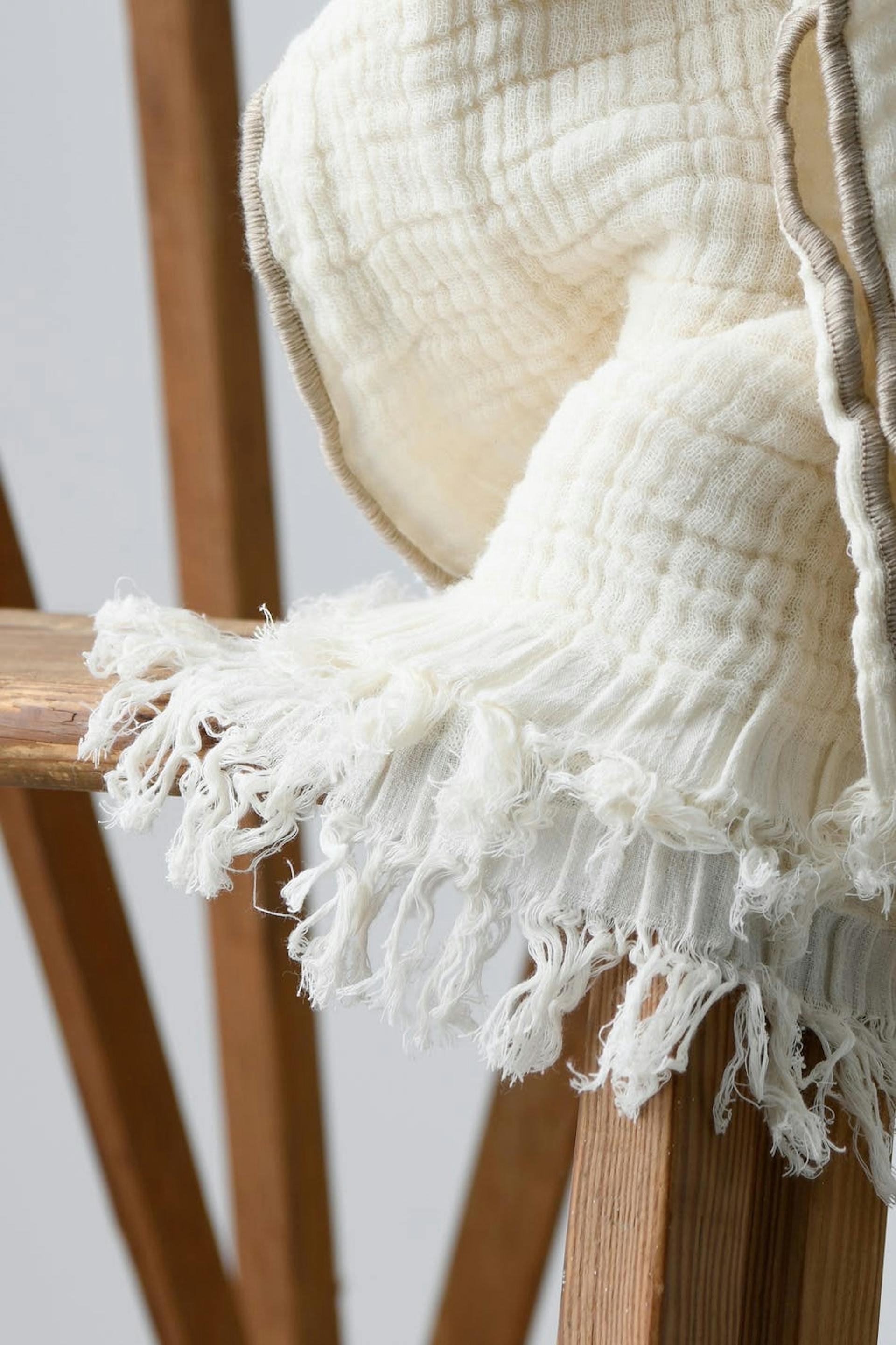 Crinkled blanket in cotton with fringes along the short sides. The blanket is white and has contrast stitches.