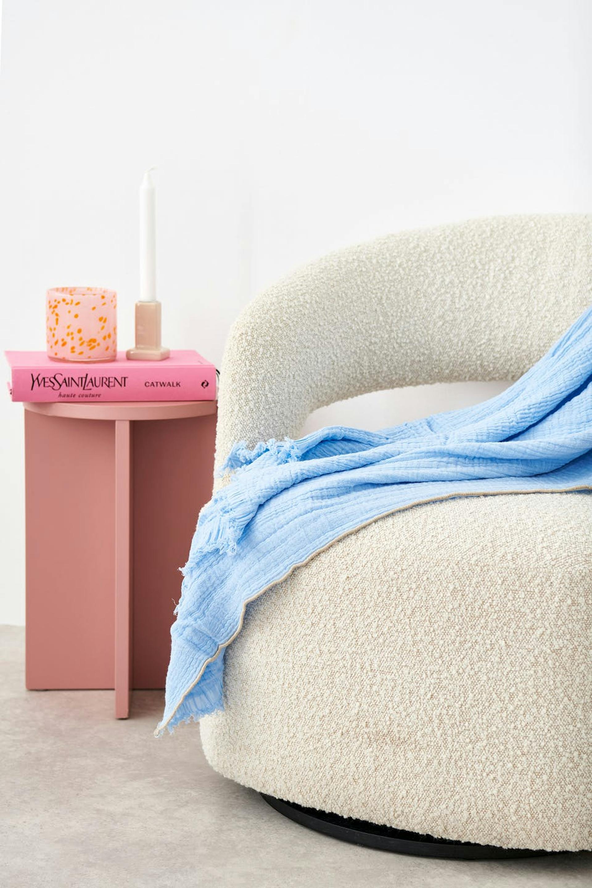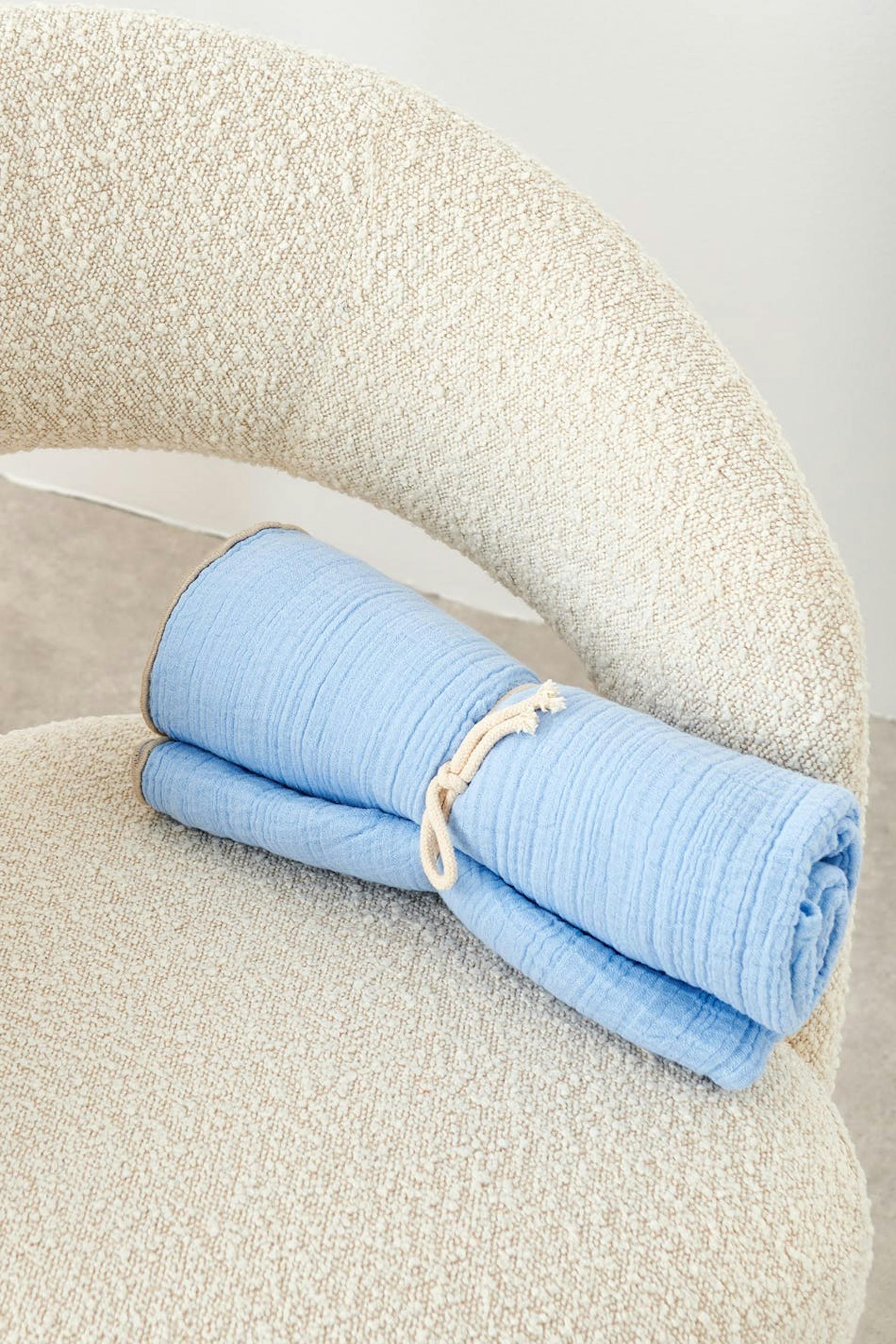 Crinkled blanket in cotton with fringes along the short sides. The blanket is light-blue and blue and has contrast stitches.