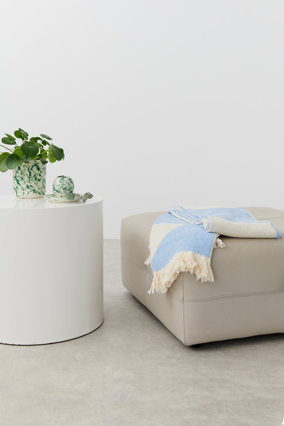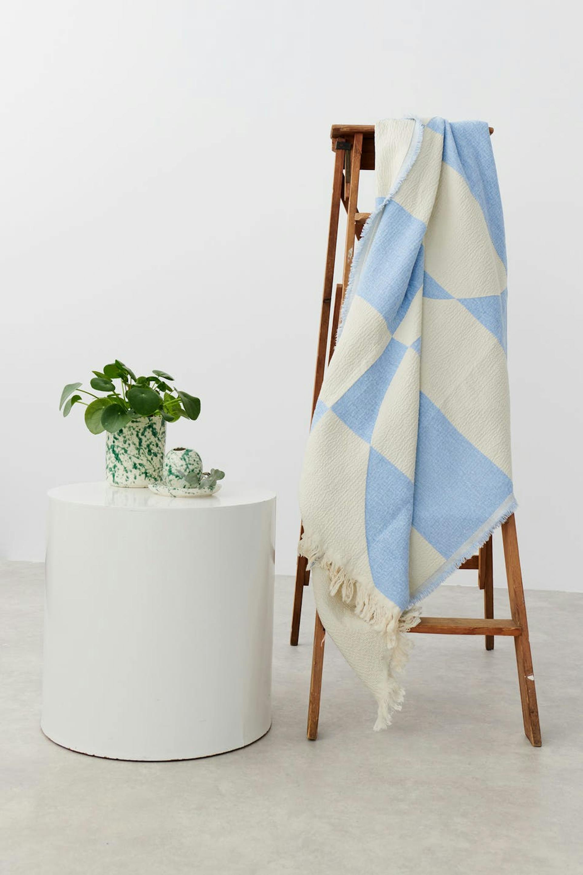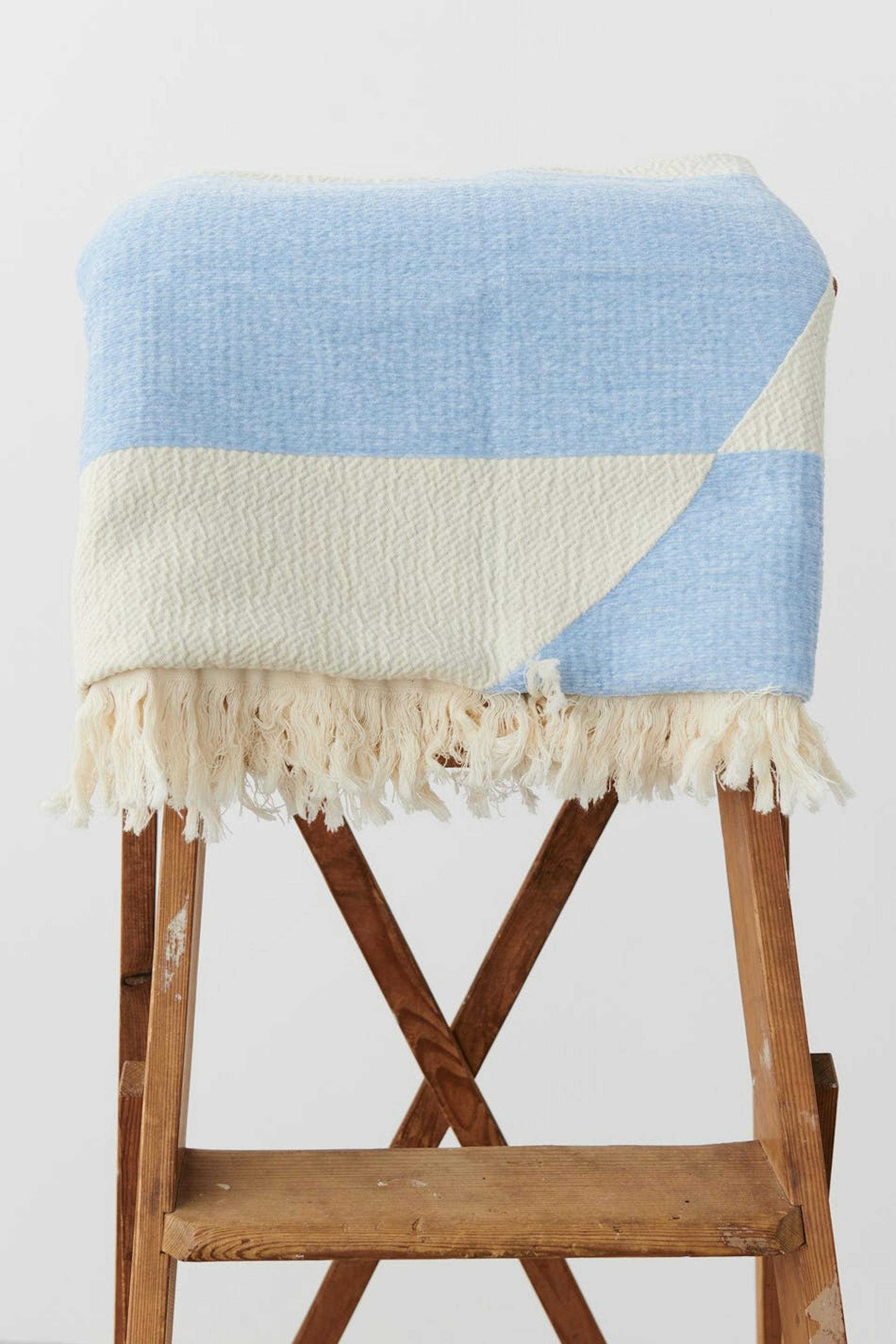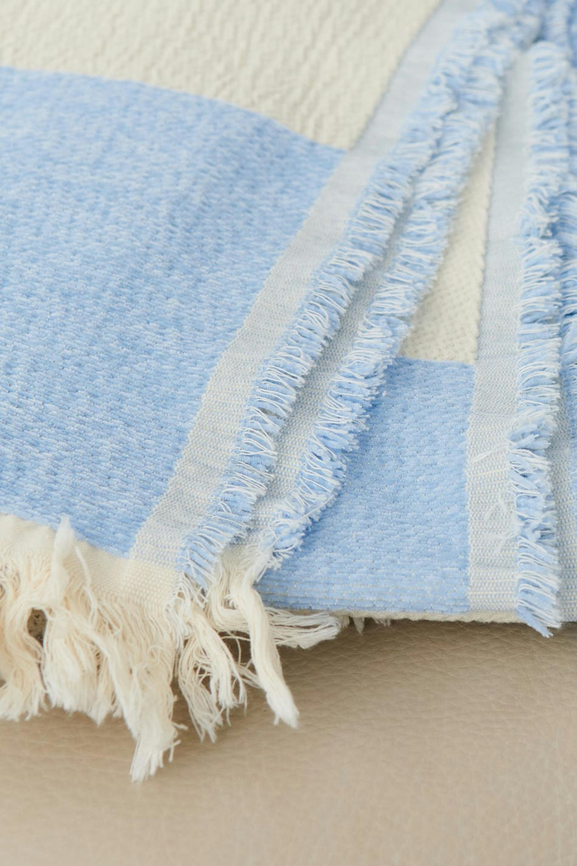 Patterned blanket by Gina Home with jacquard print. The blanket is blue and has fringes at the edges.