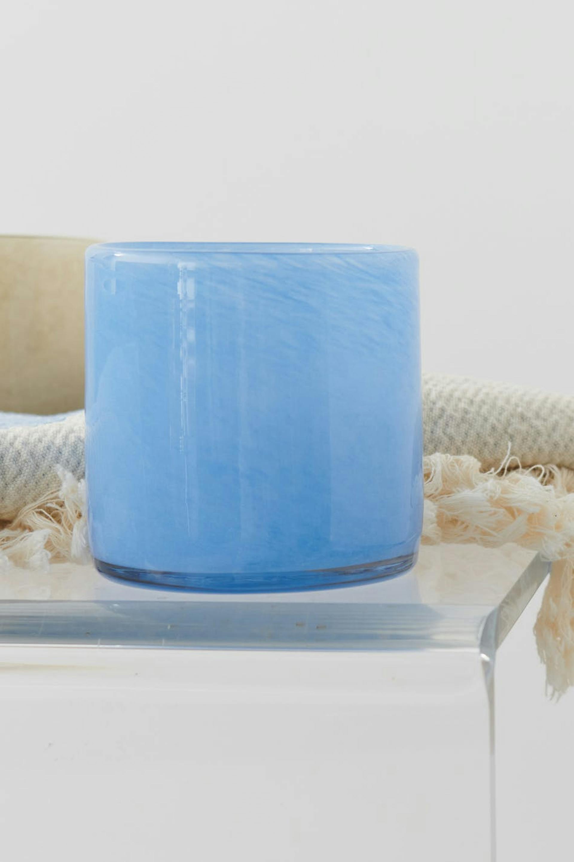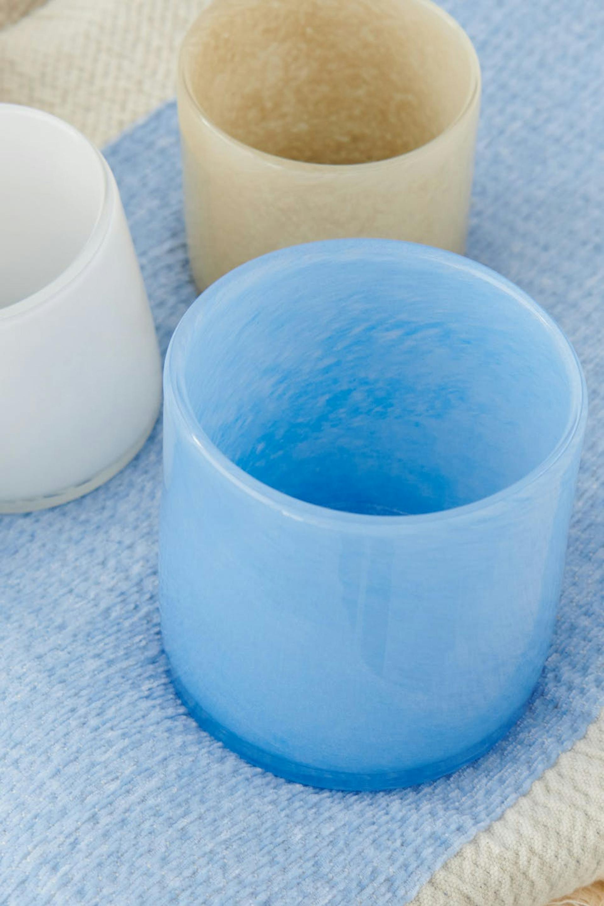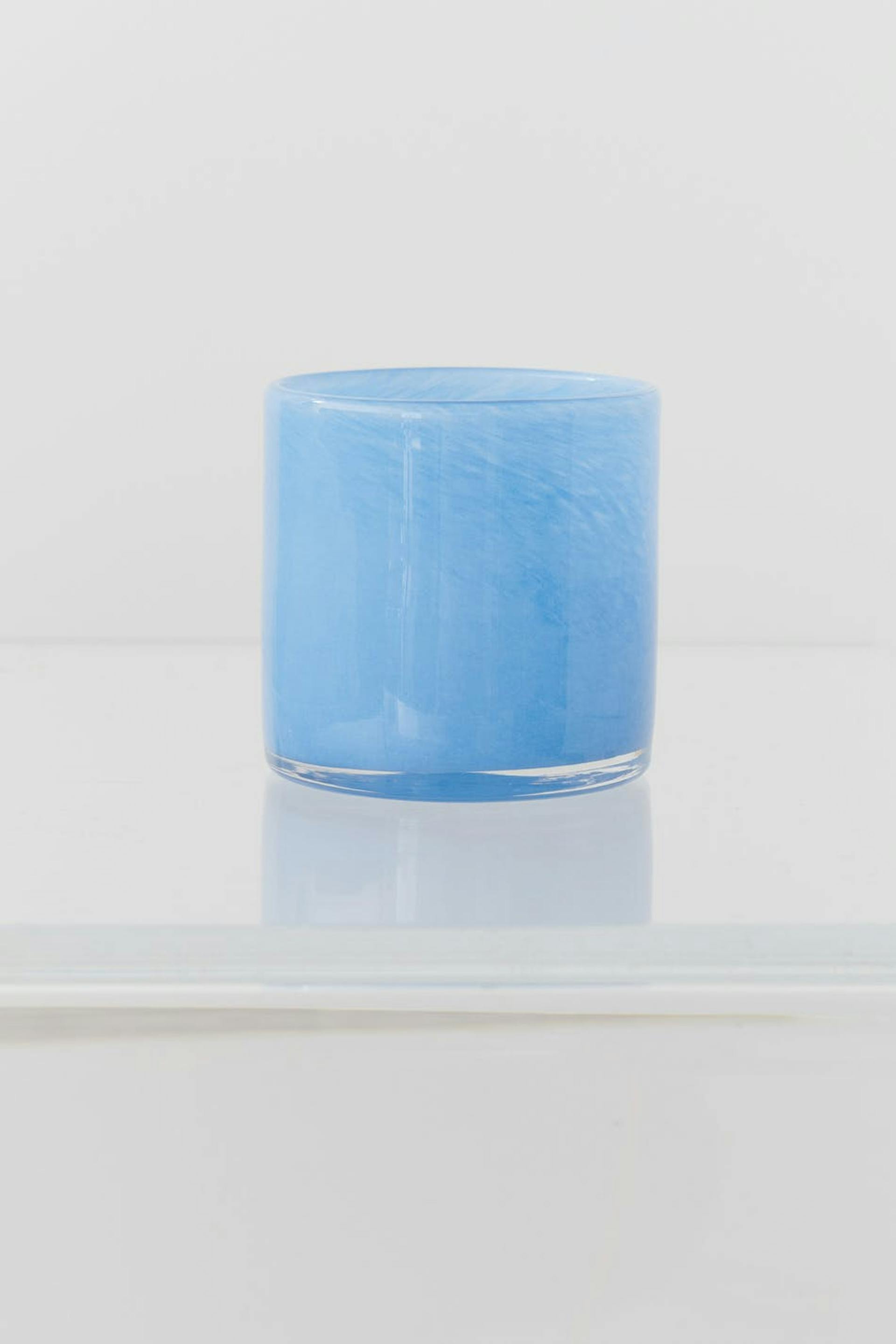 Candle holder by Gina Home with coloured glasses. The candle holder is blue.