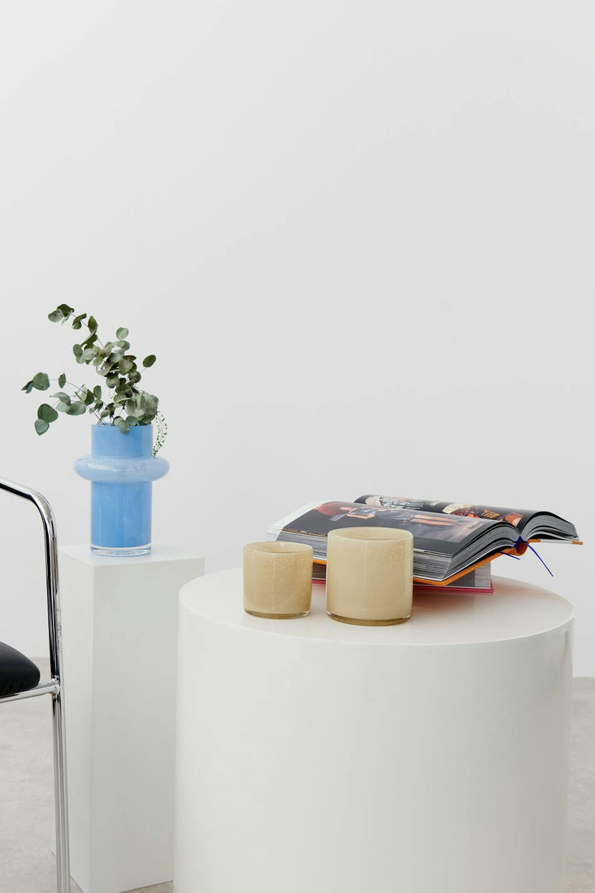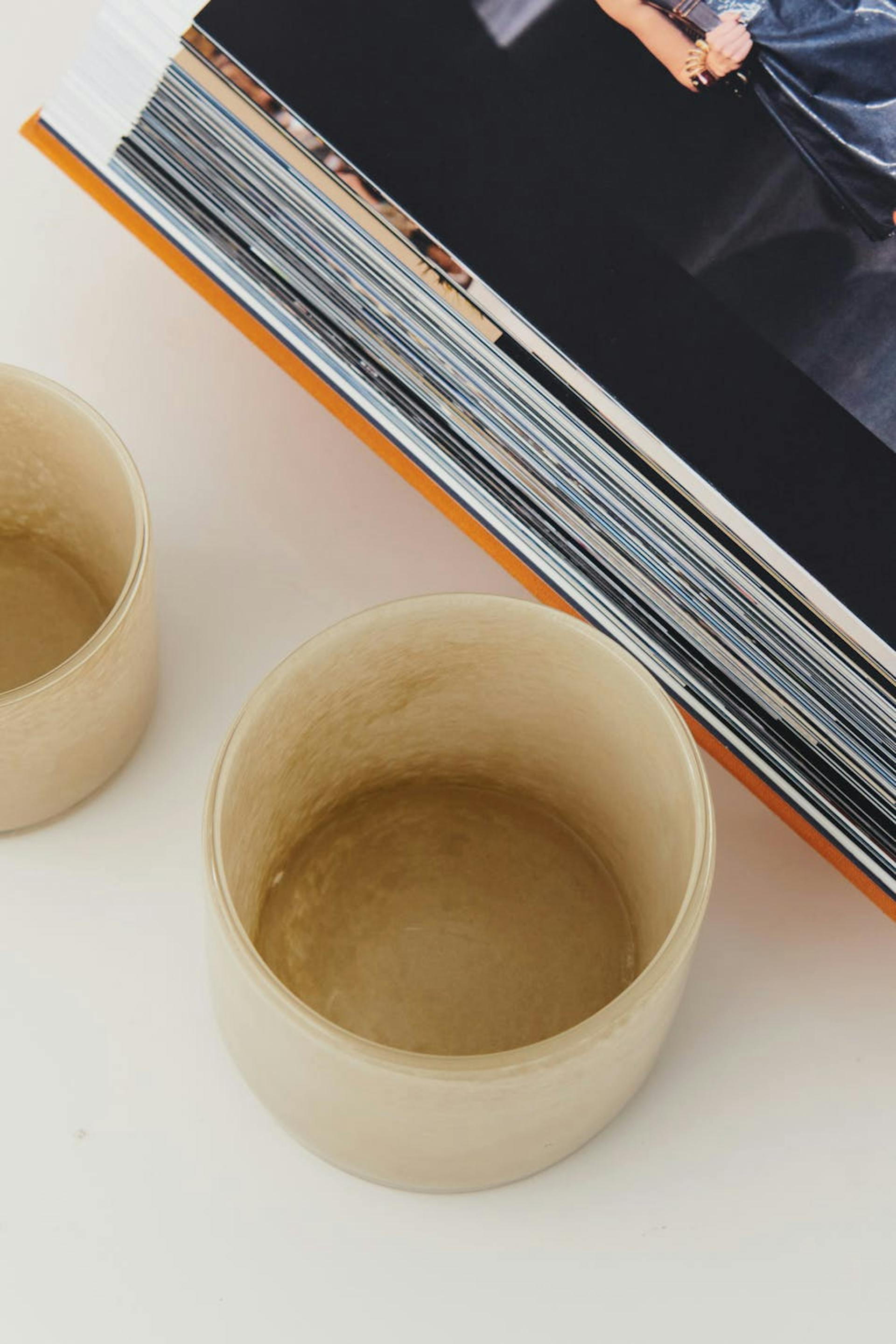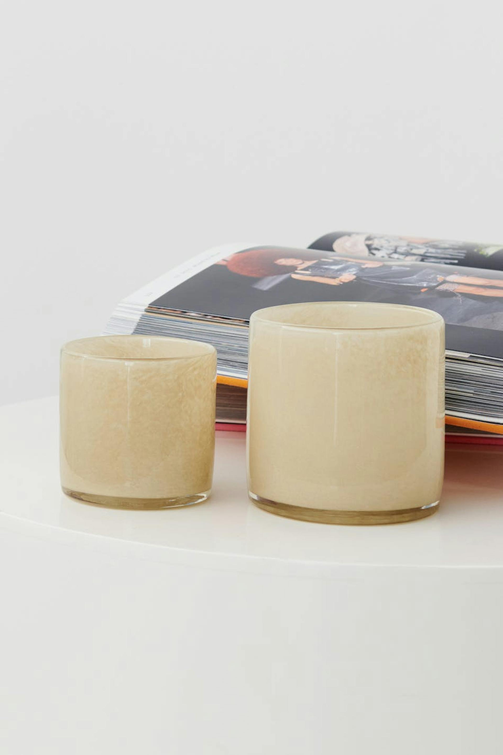 Candle holder by Gina Home with coloured glasses. The candle holder is beige.