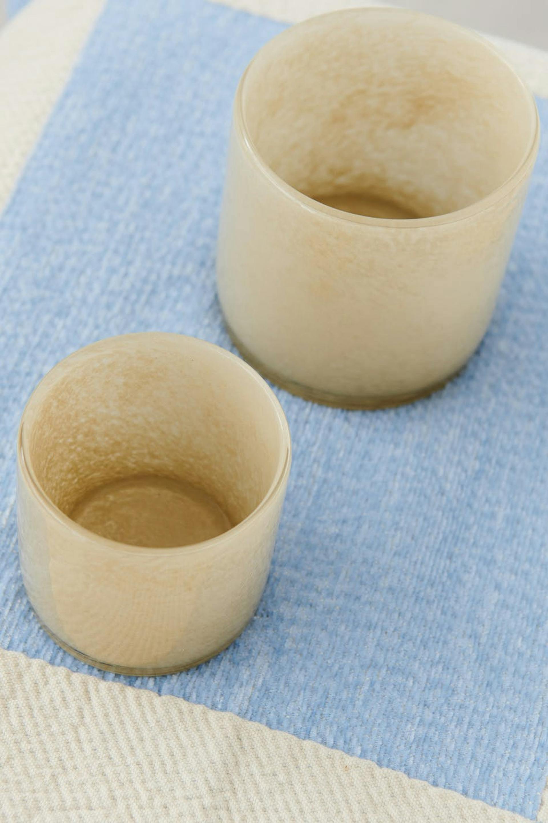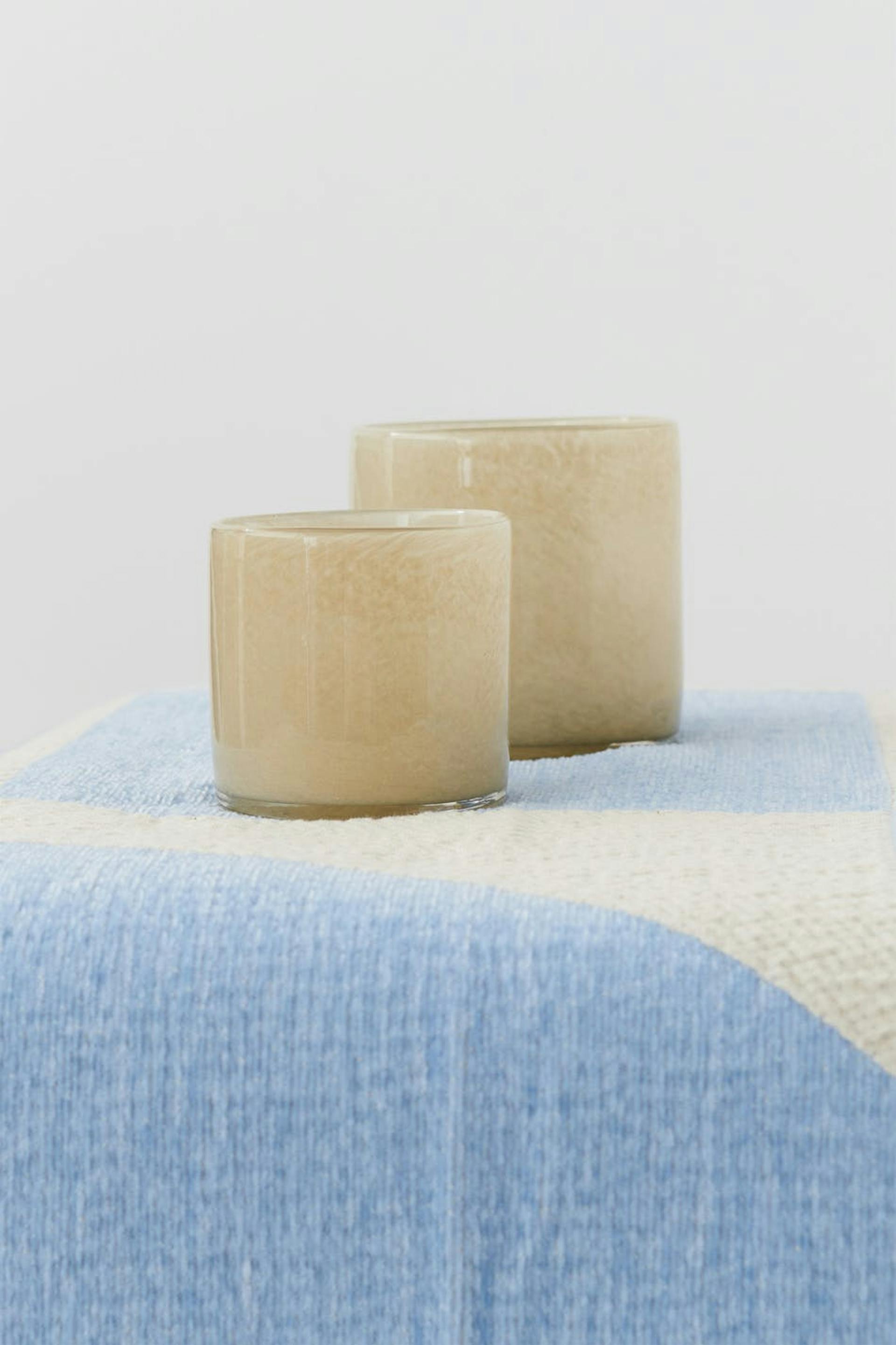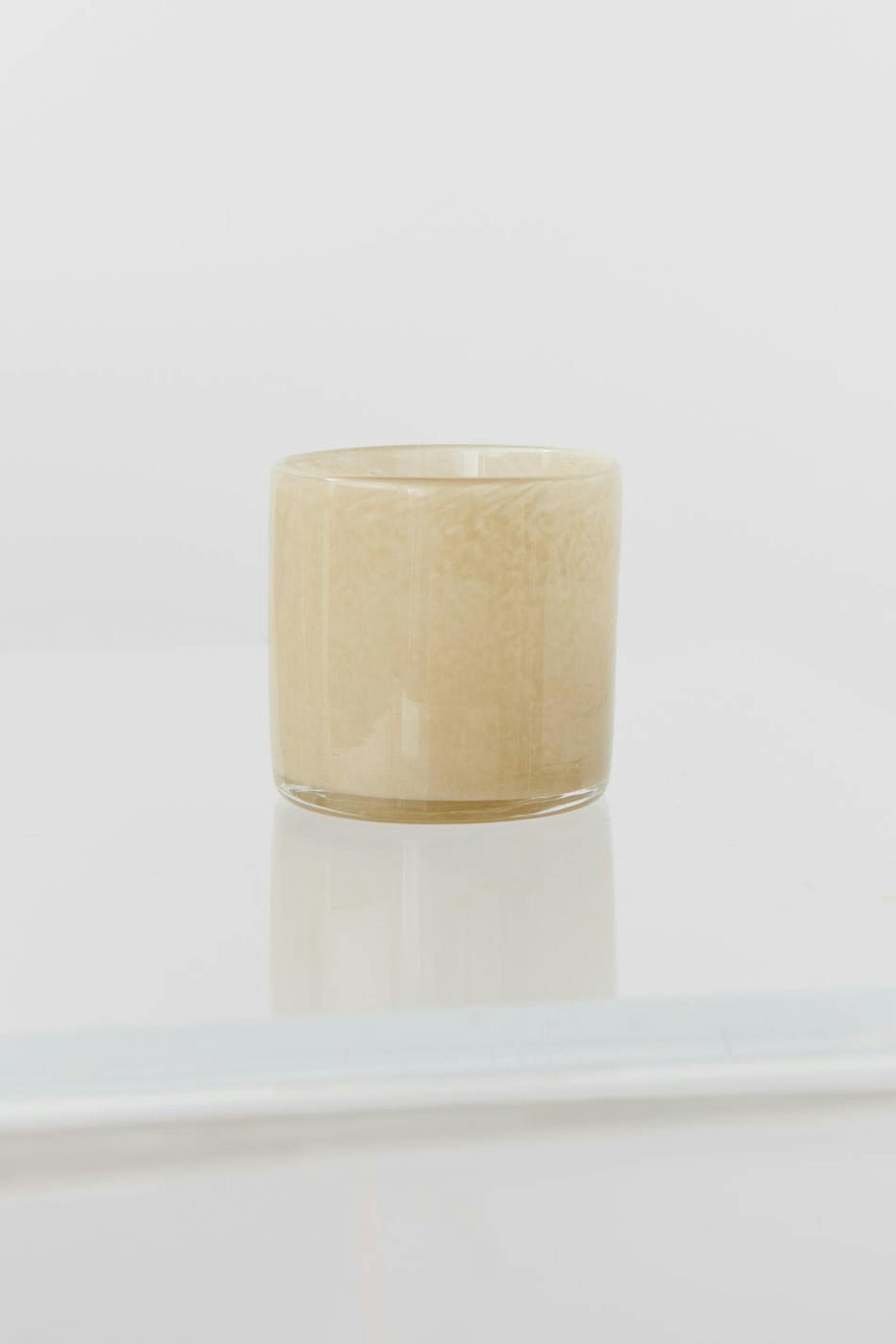 Small candle holder with coloured glasses. The candle holder is beige.