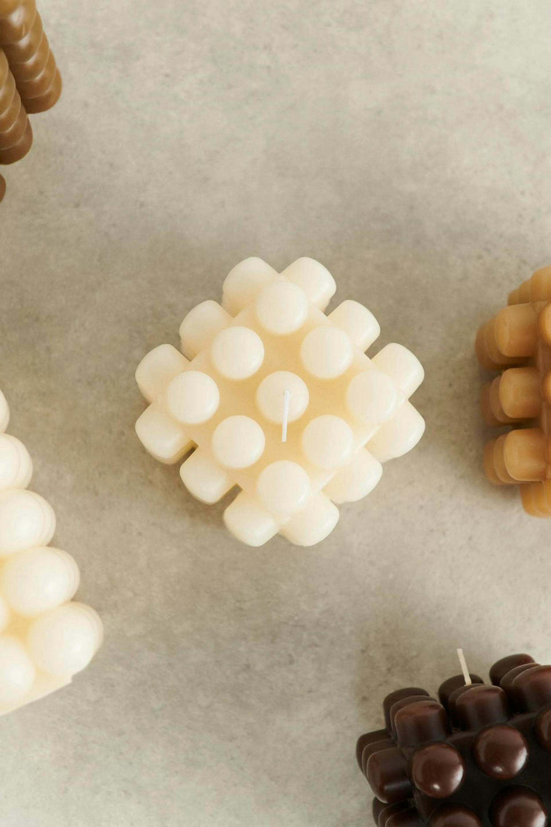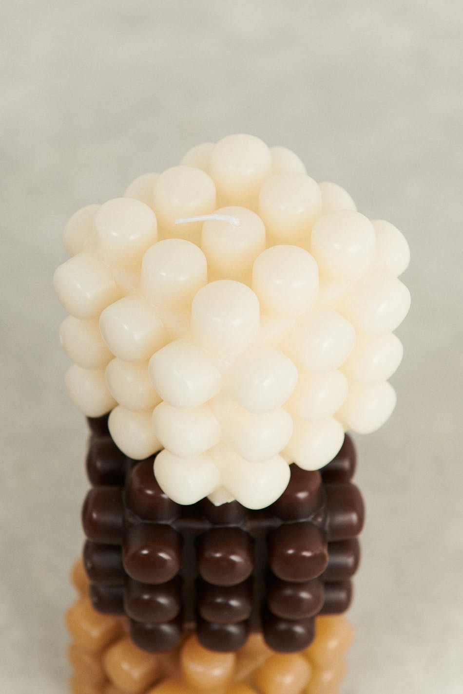 Beautiful bubble candle by Gina Home with a squared shape. The bubble candle is white and has a wick.