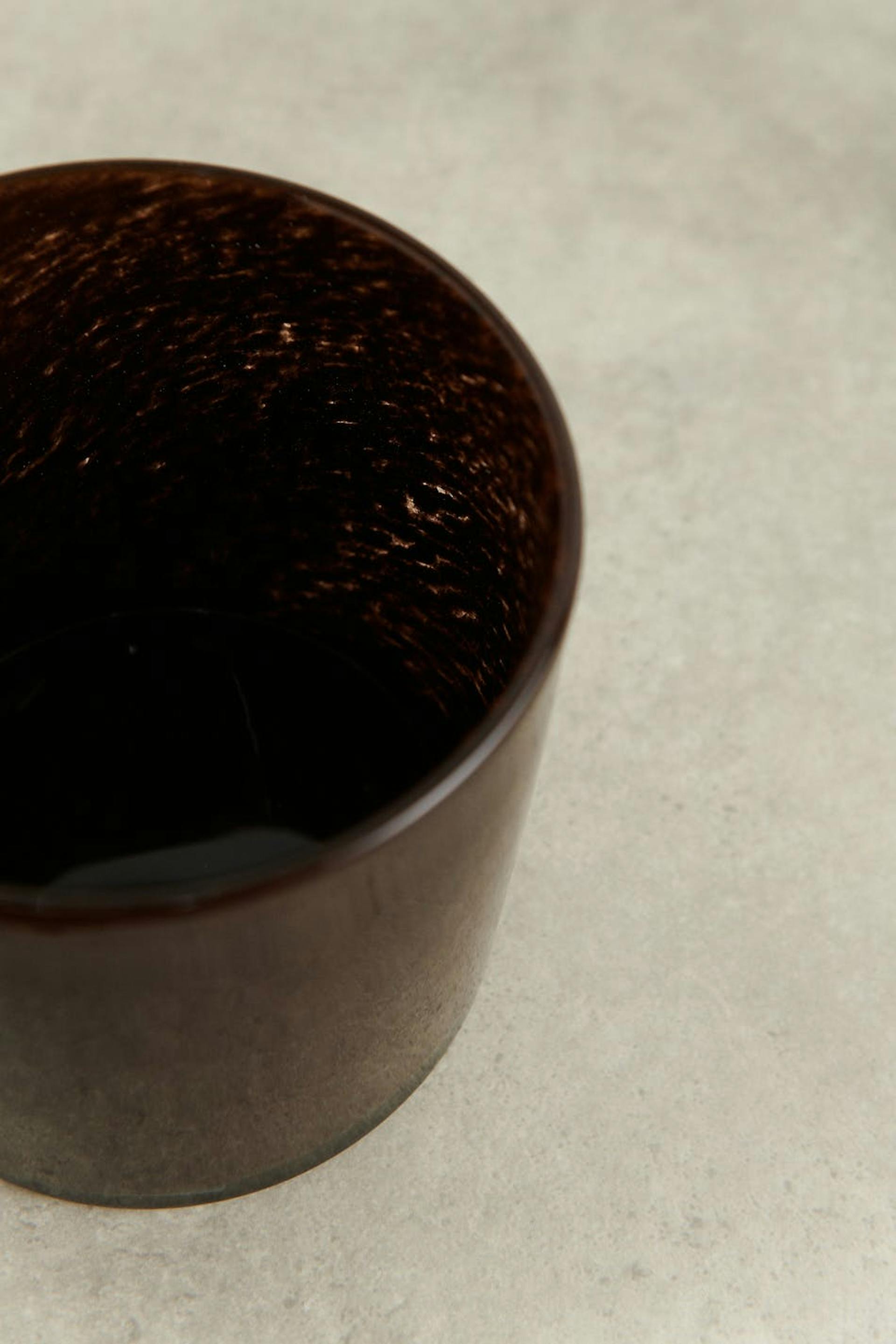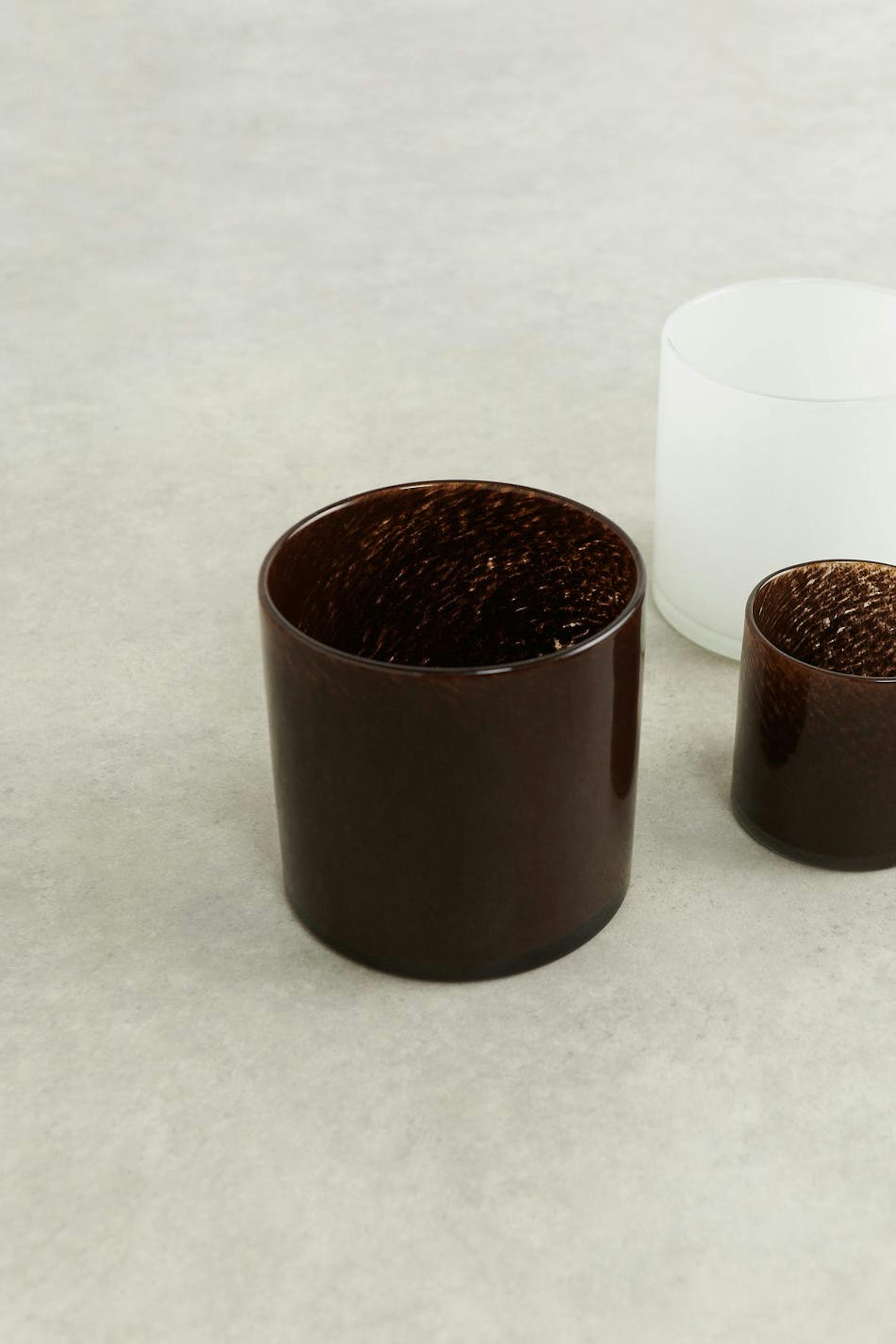 Candle holder by Gina Home with coloured glass. The candle holder is brown.