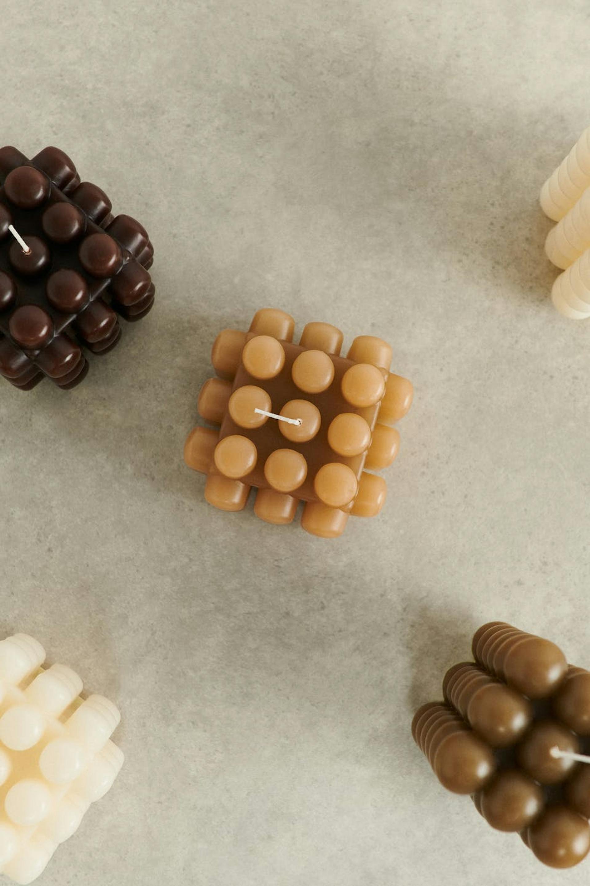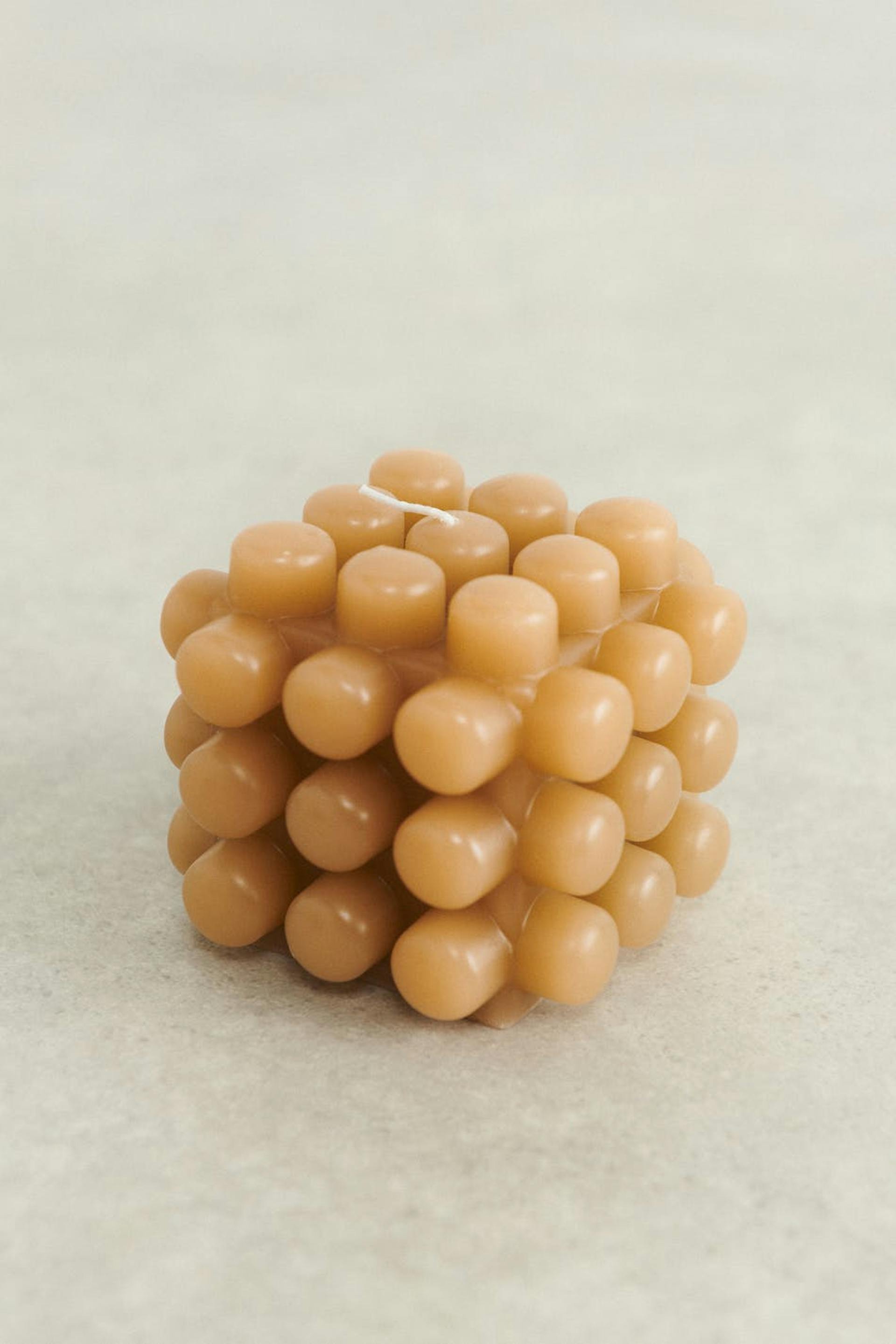 Beautiful bubble candle by Gina Home with a squared shape. The bubble candle is beige and has a wick.