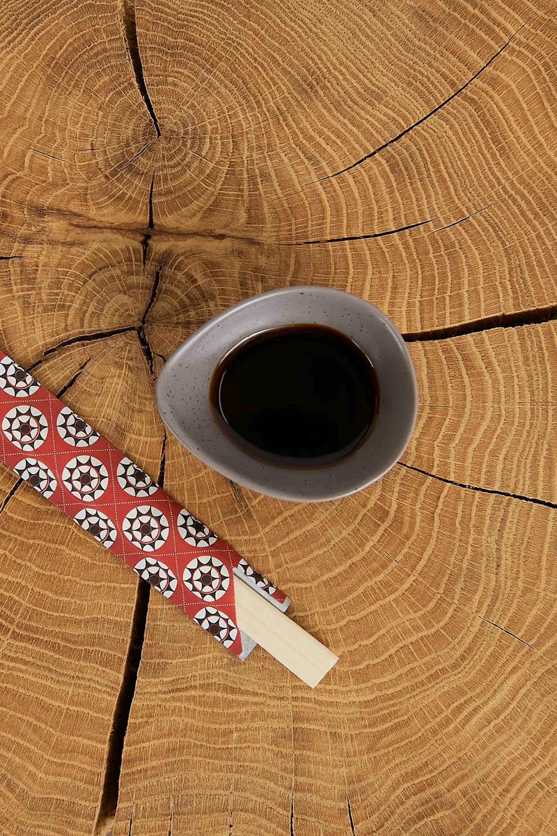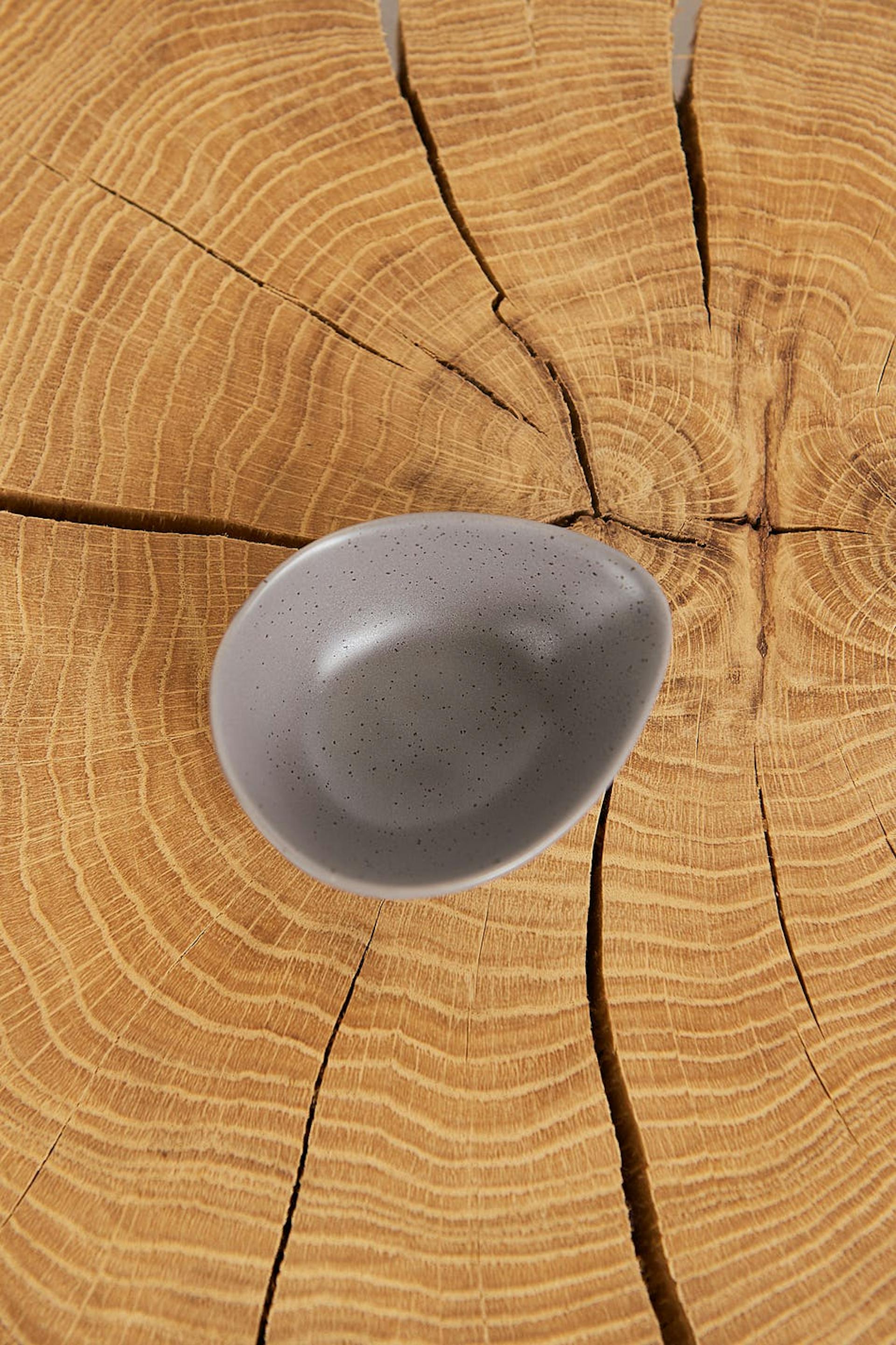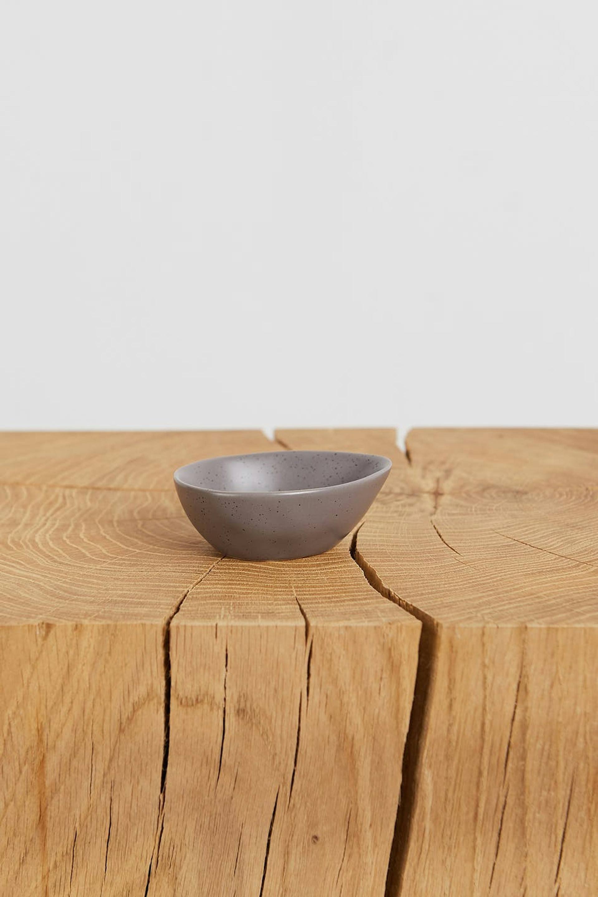 Small bowl by Gina Home with asymmetrical design. The bowl is grey and has small, black dots.