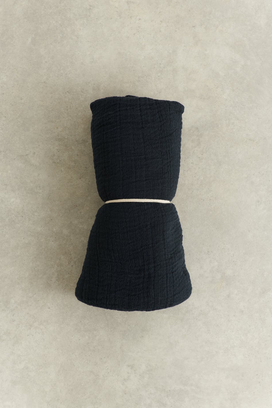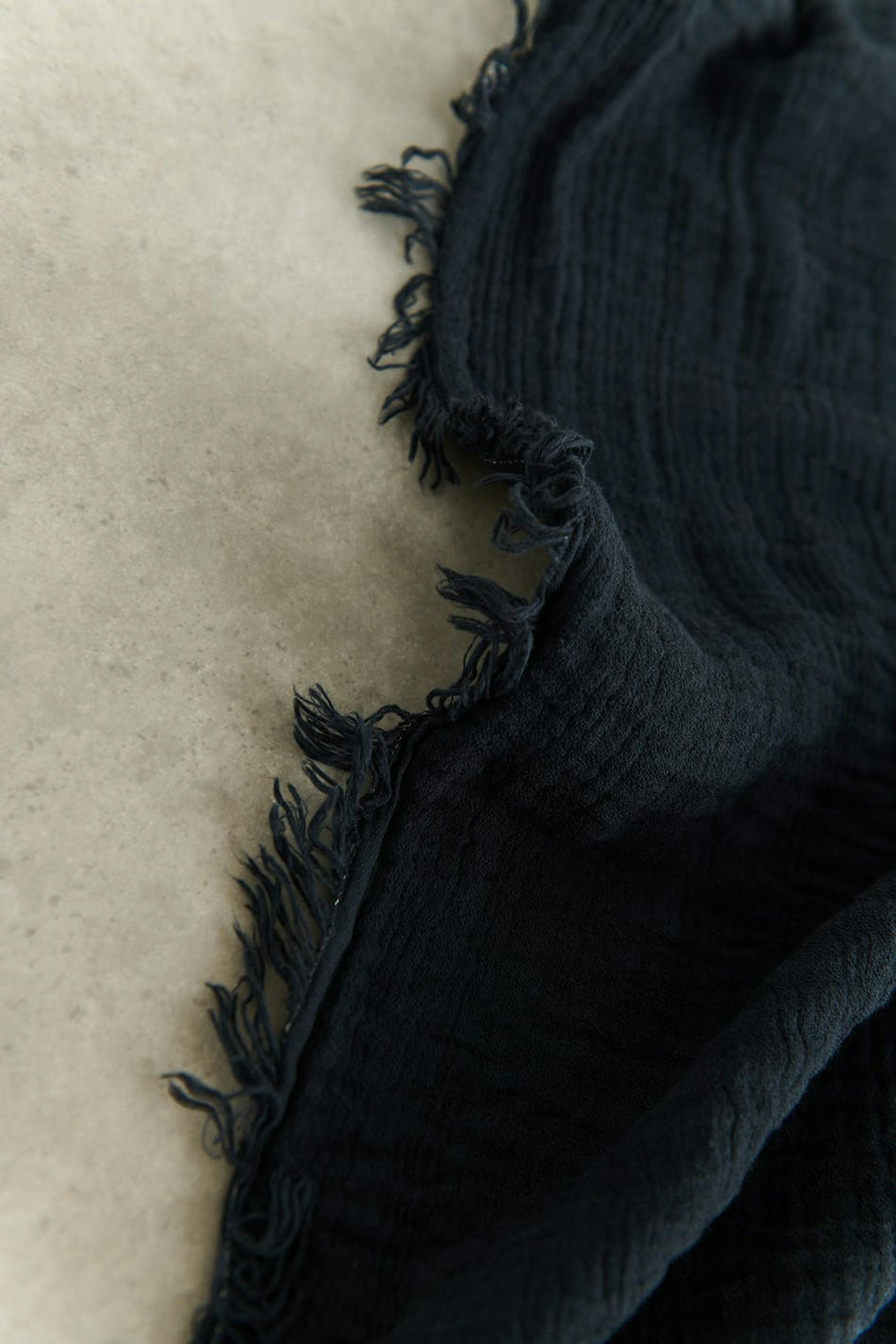 Crinkled blanket by Gina Home with fringes at the edges. The blanket is black-grey and has a soft material in cotton.