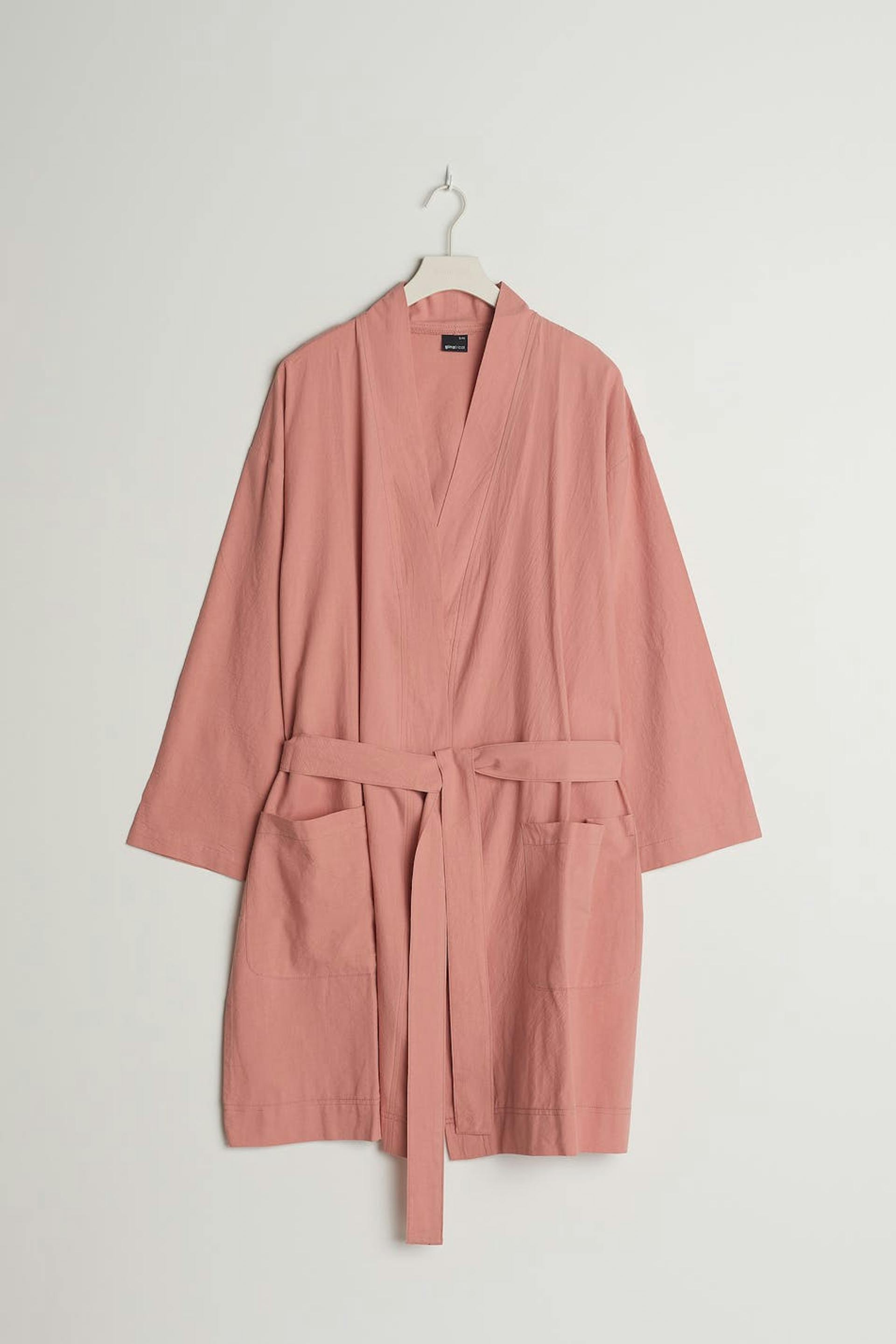 Cosy robe with an oversize fit. The robe is pink and has two pockets at the front. It has a tie strap at the waist.