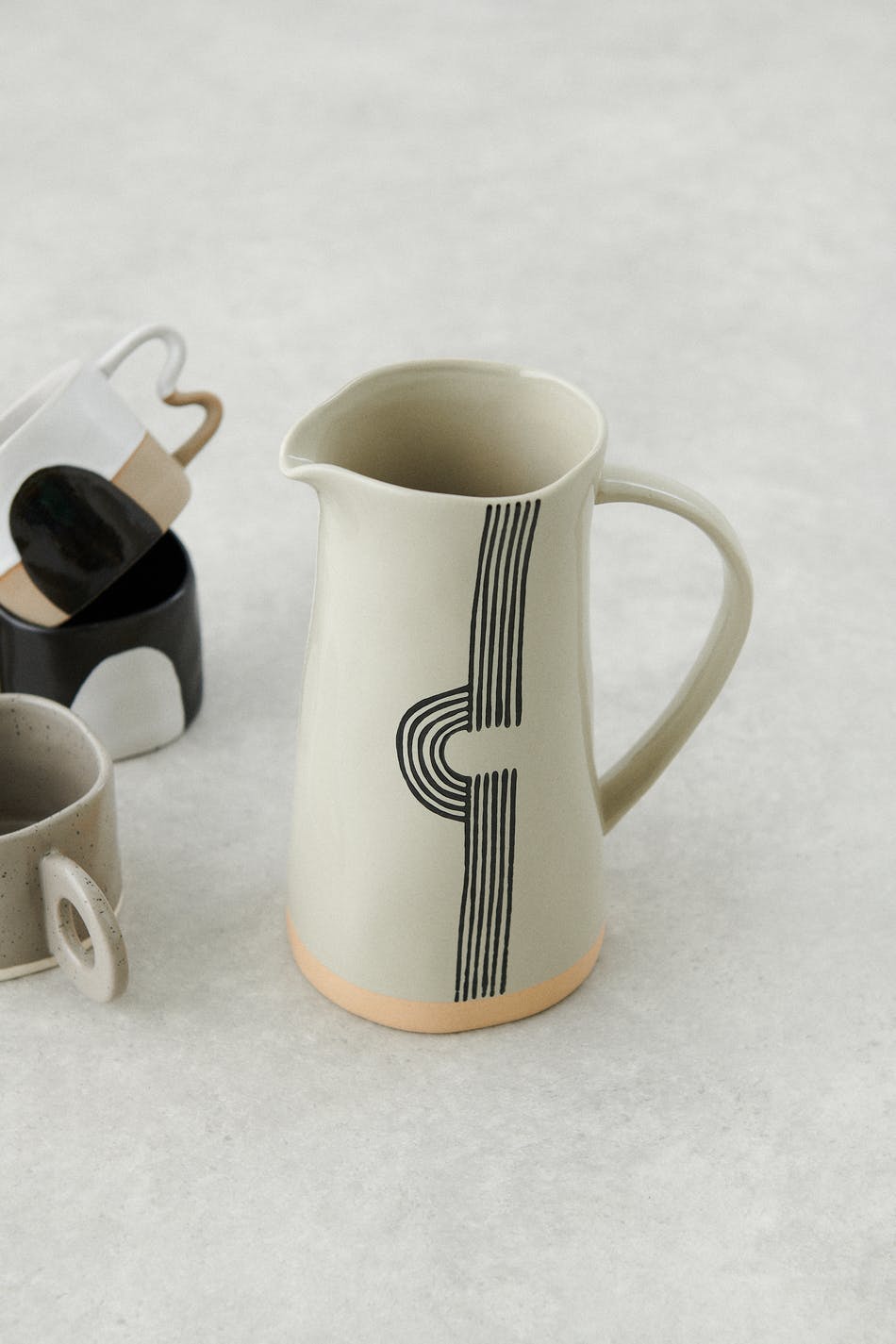 Beautiful carafe by Gina Home in ceramics with handle. The carafe is grey and has a painted pattern.
