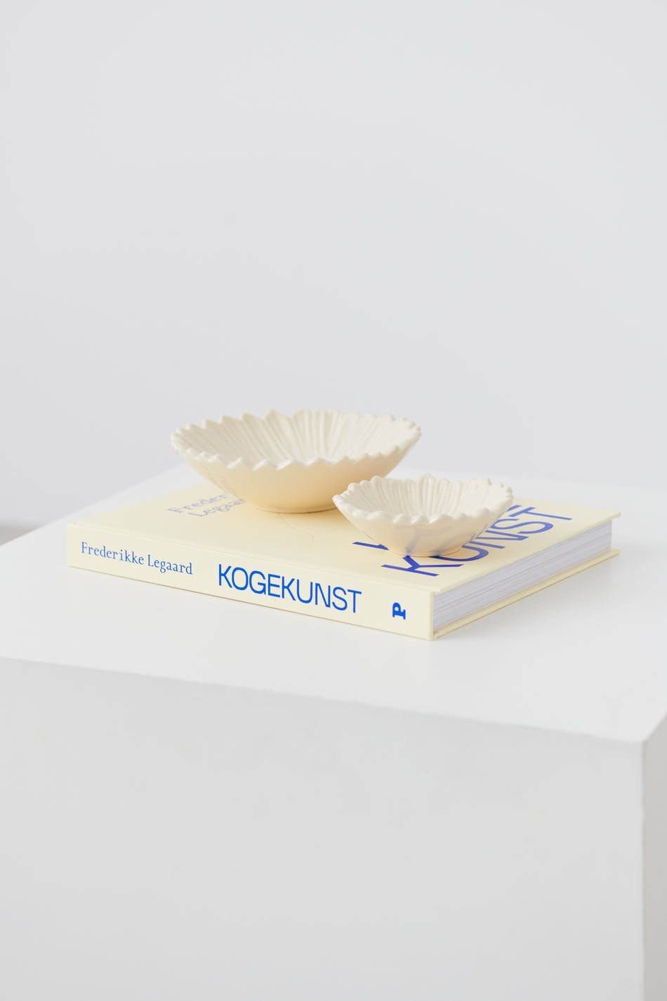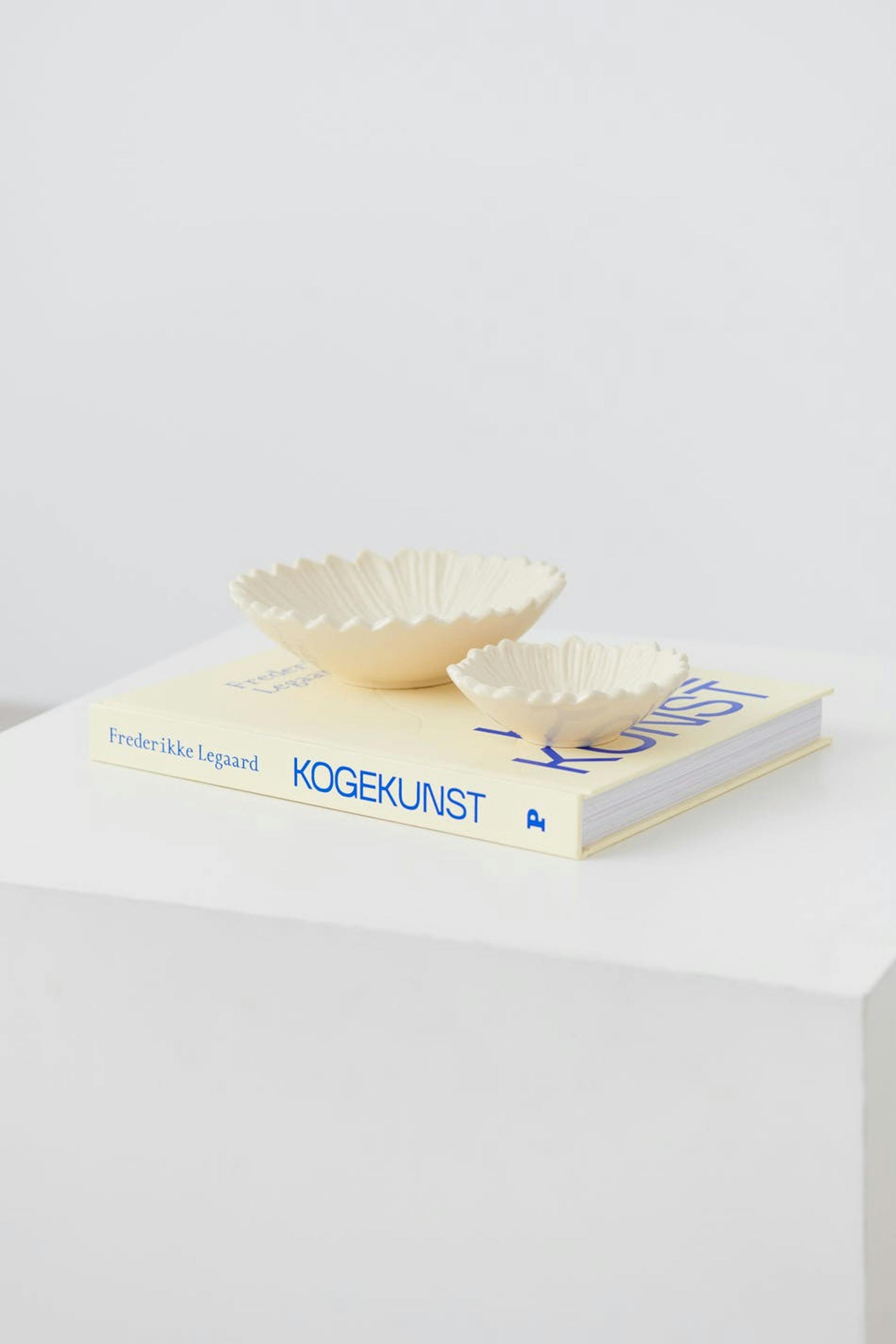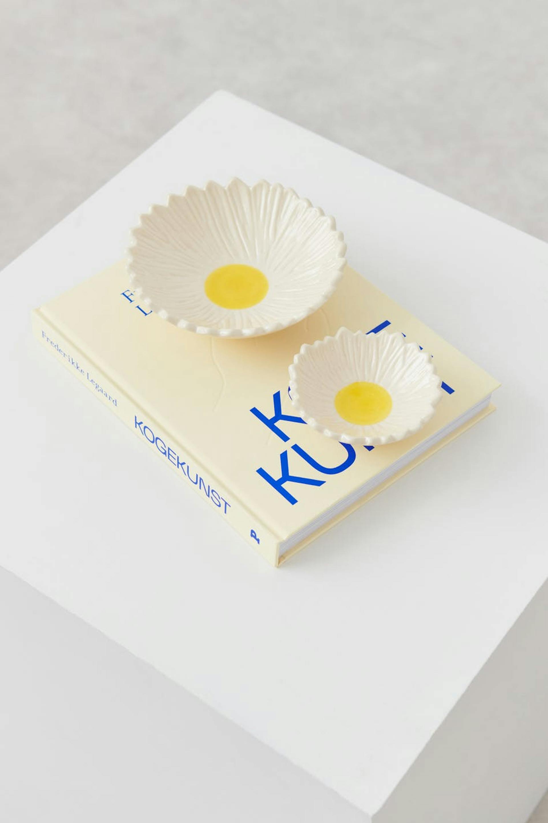 Small plate in ceramics with shape of a flower. The plate is white and yellow.