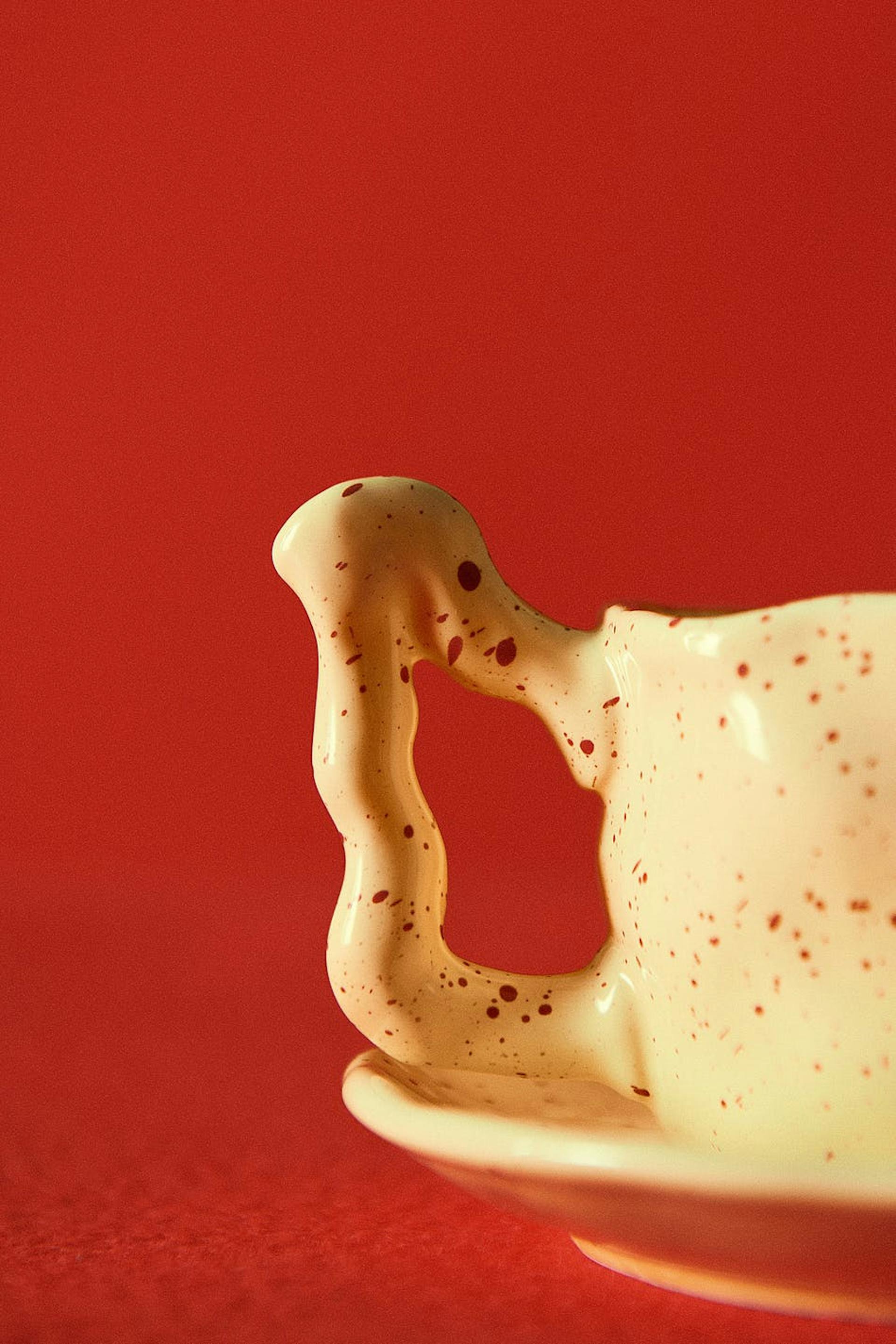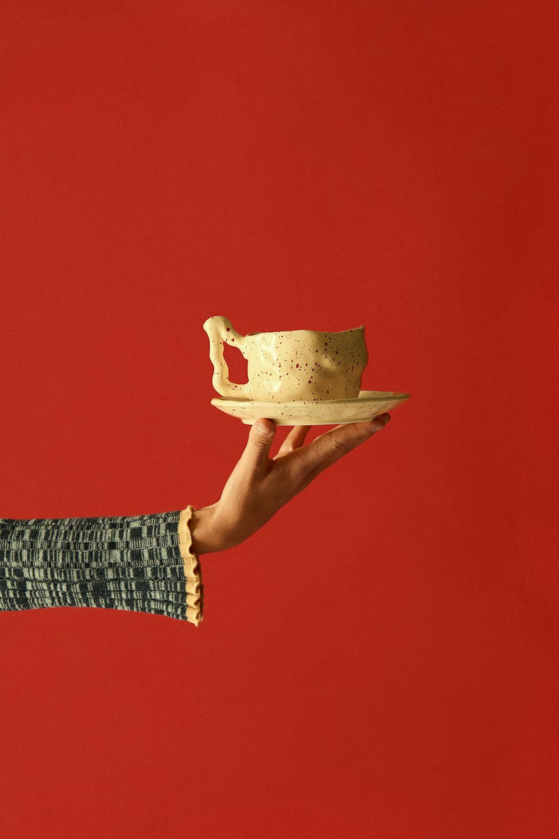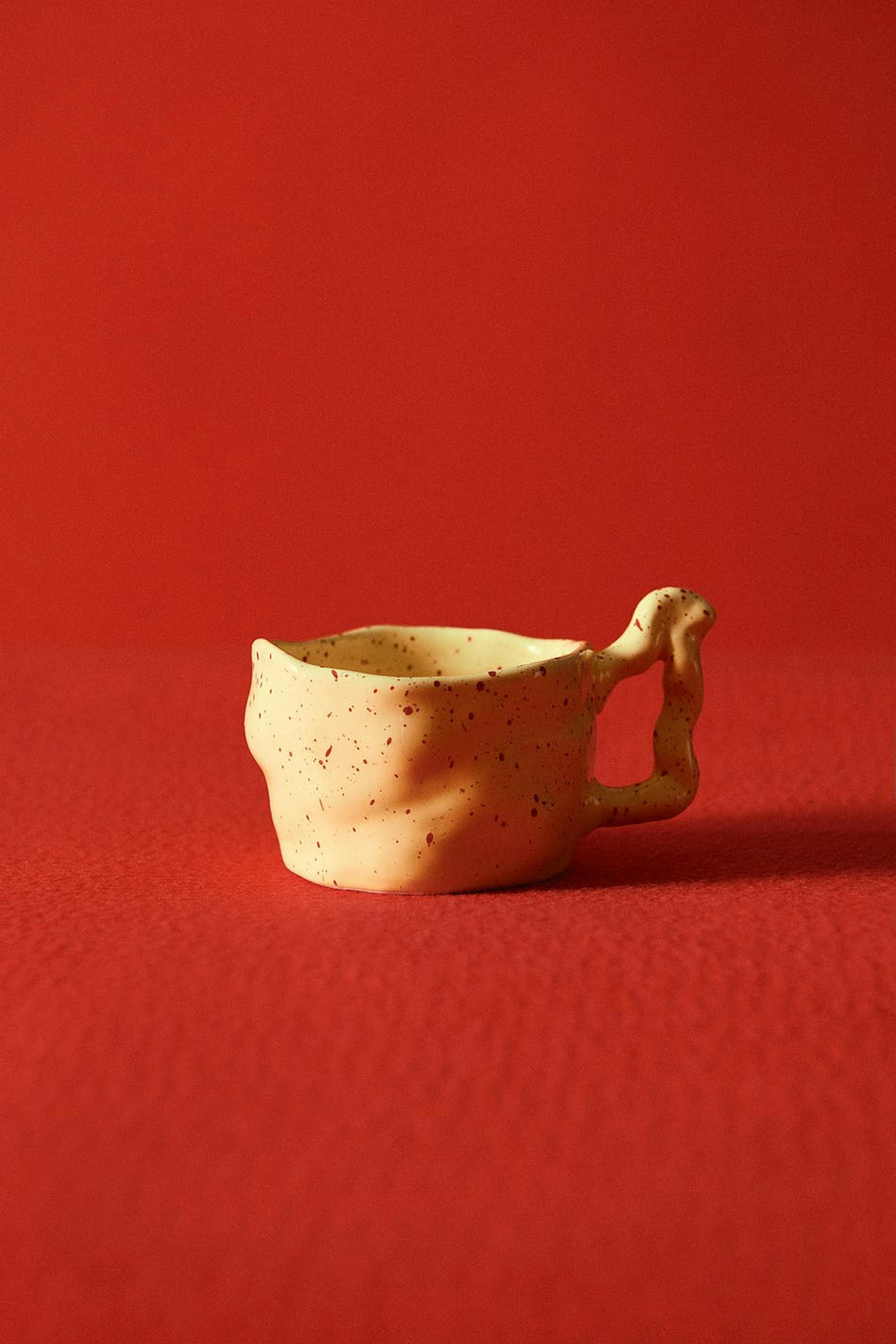 Hobnob X Gina Tricot. Cup in ceramic with unique design. The cup is yellow and has red dots.