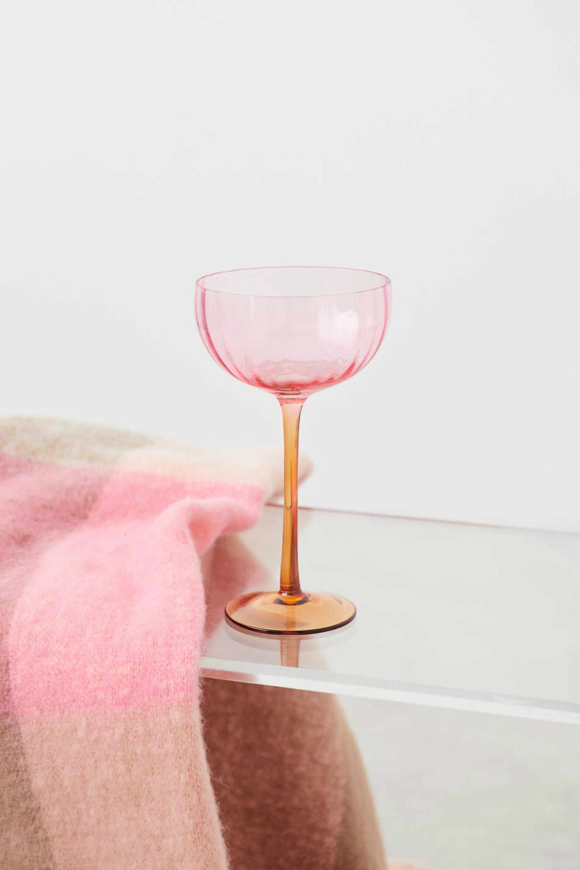 Cocktail glass by Gina Home with fluted surface. The cocktail glass is pink.