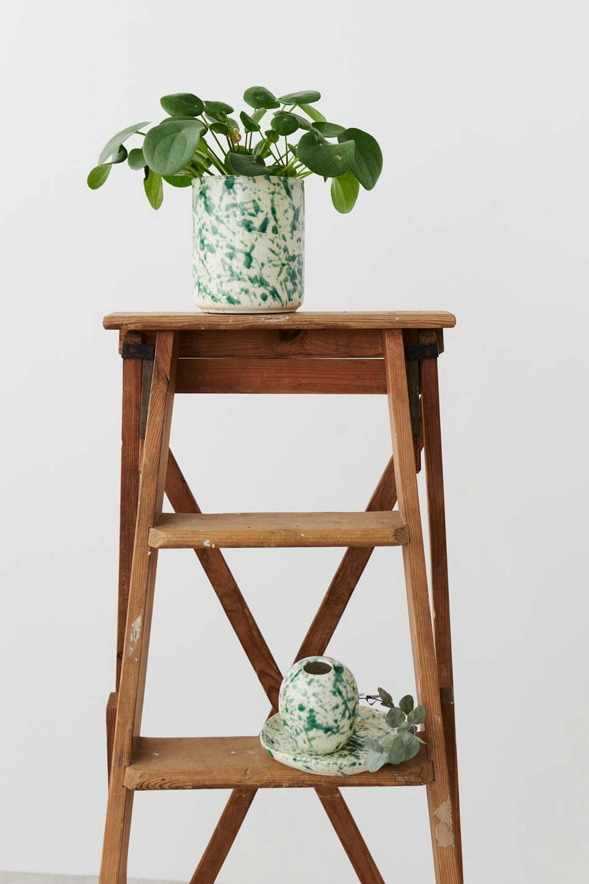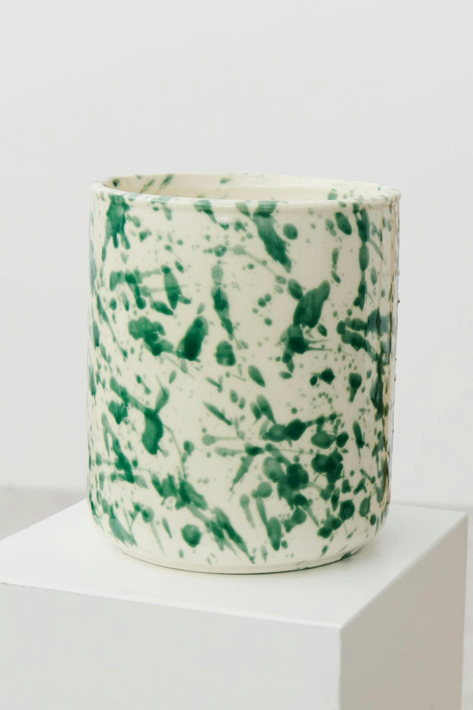 Plant pot in ceramic with a decorative pattern. The plant pot is green and round.