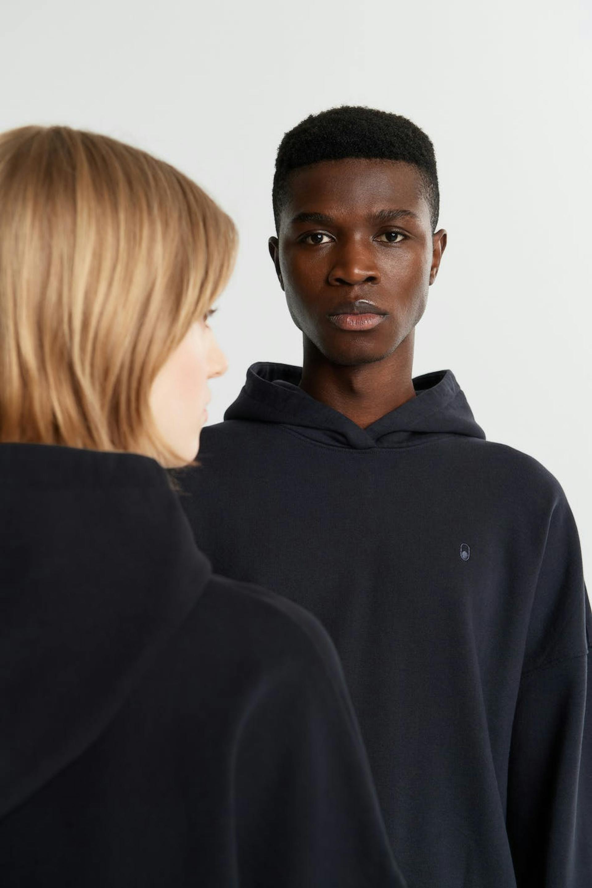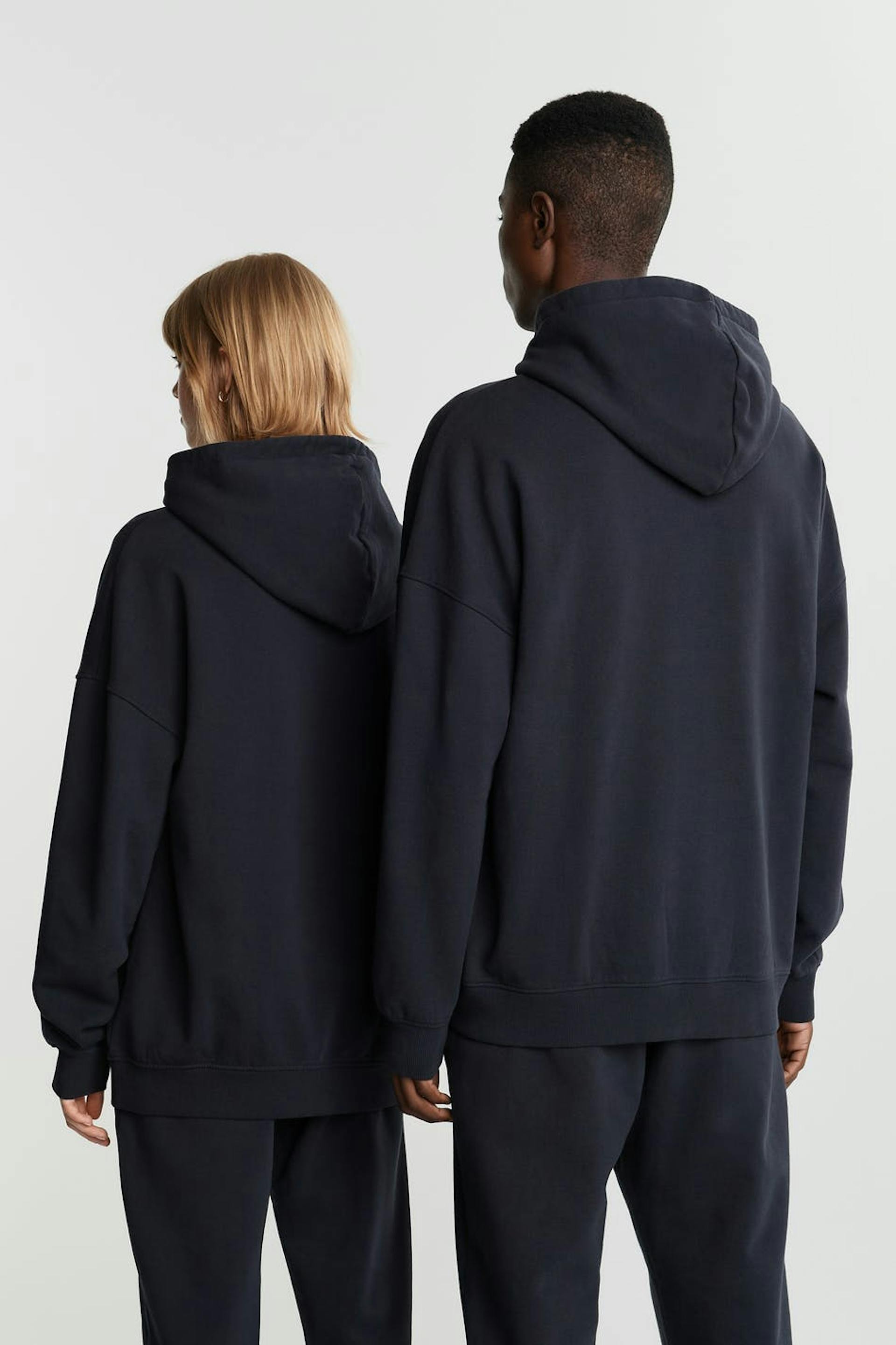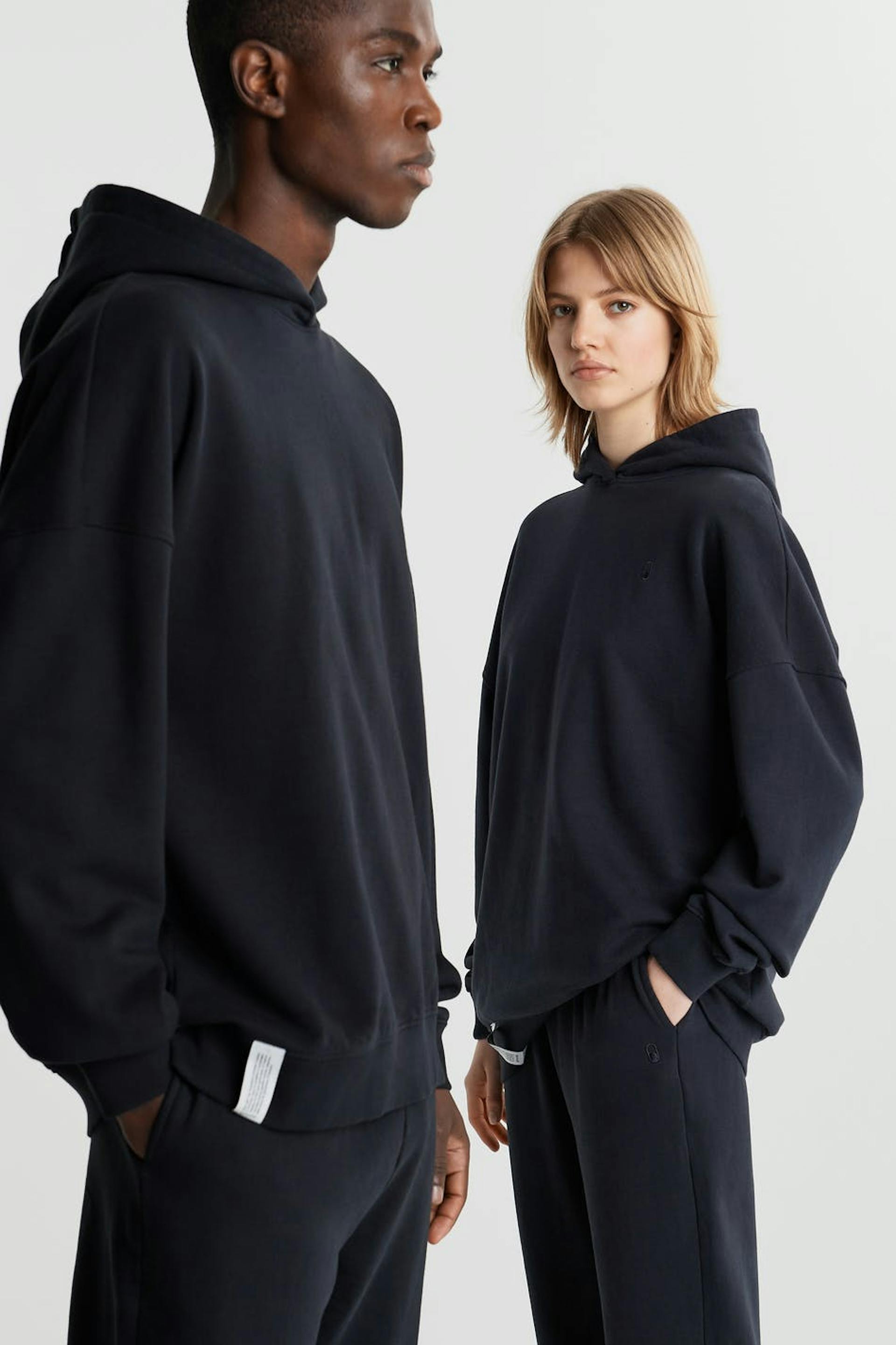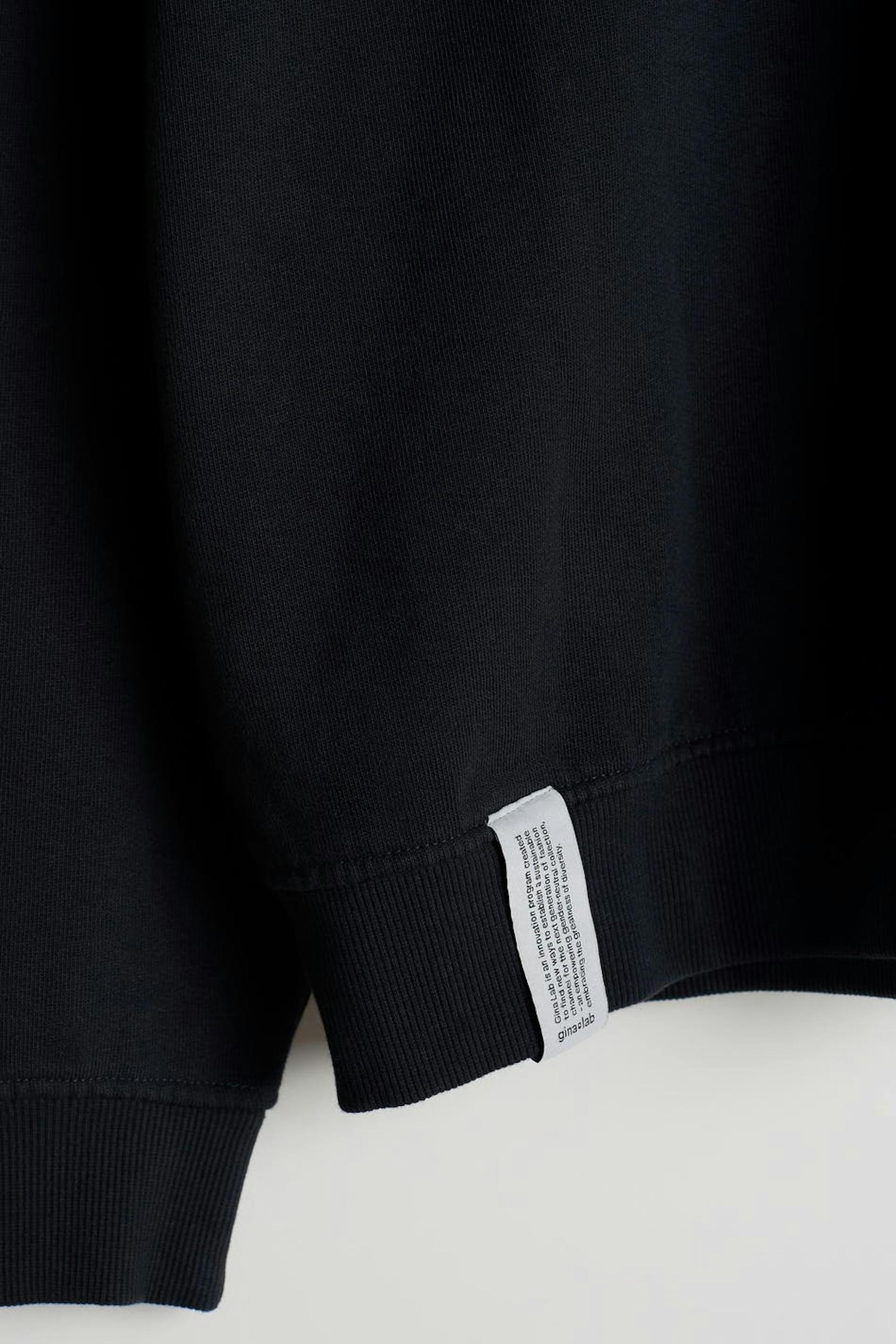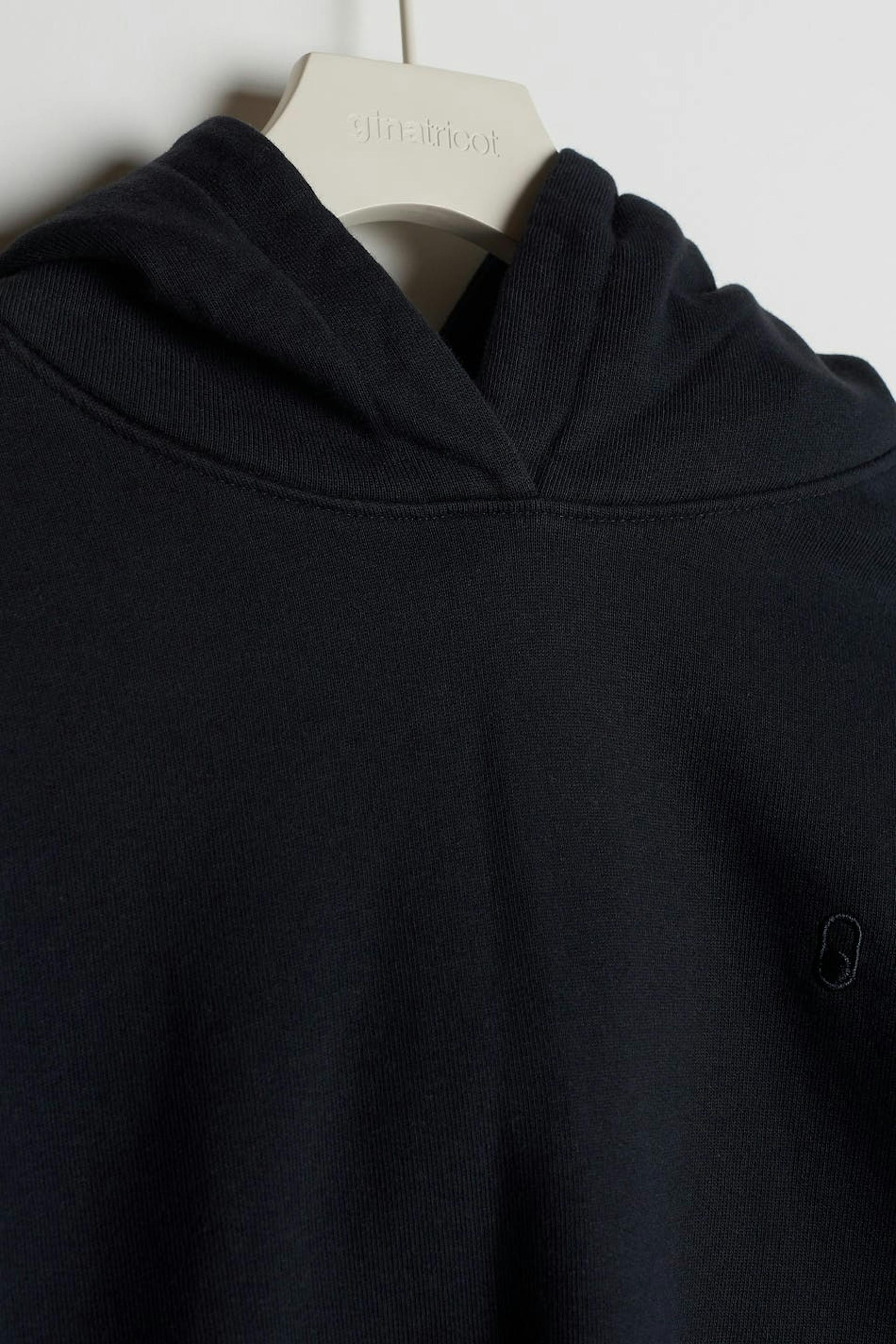 Unisex sweatshirt by Gina Lab with an oversize fit. Black, soft, timeless and gender-neutral. It has a hood, a ribbed cuff on the sleeve ends and at the hem and a small, embroidered logo on the chest.