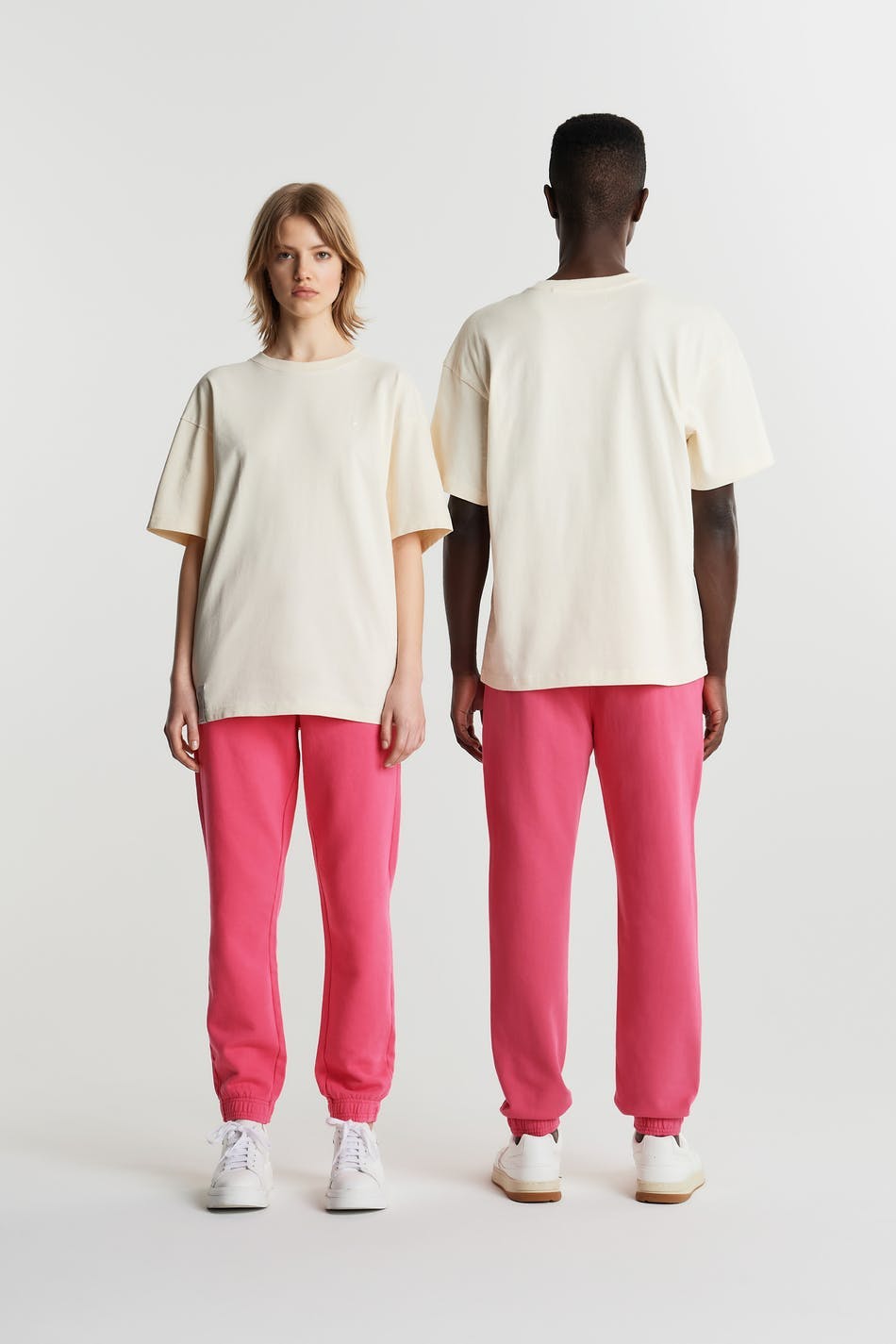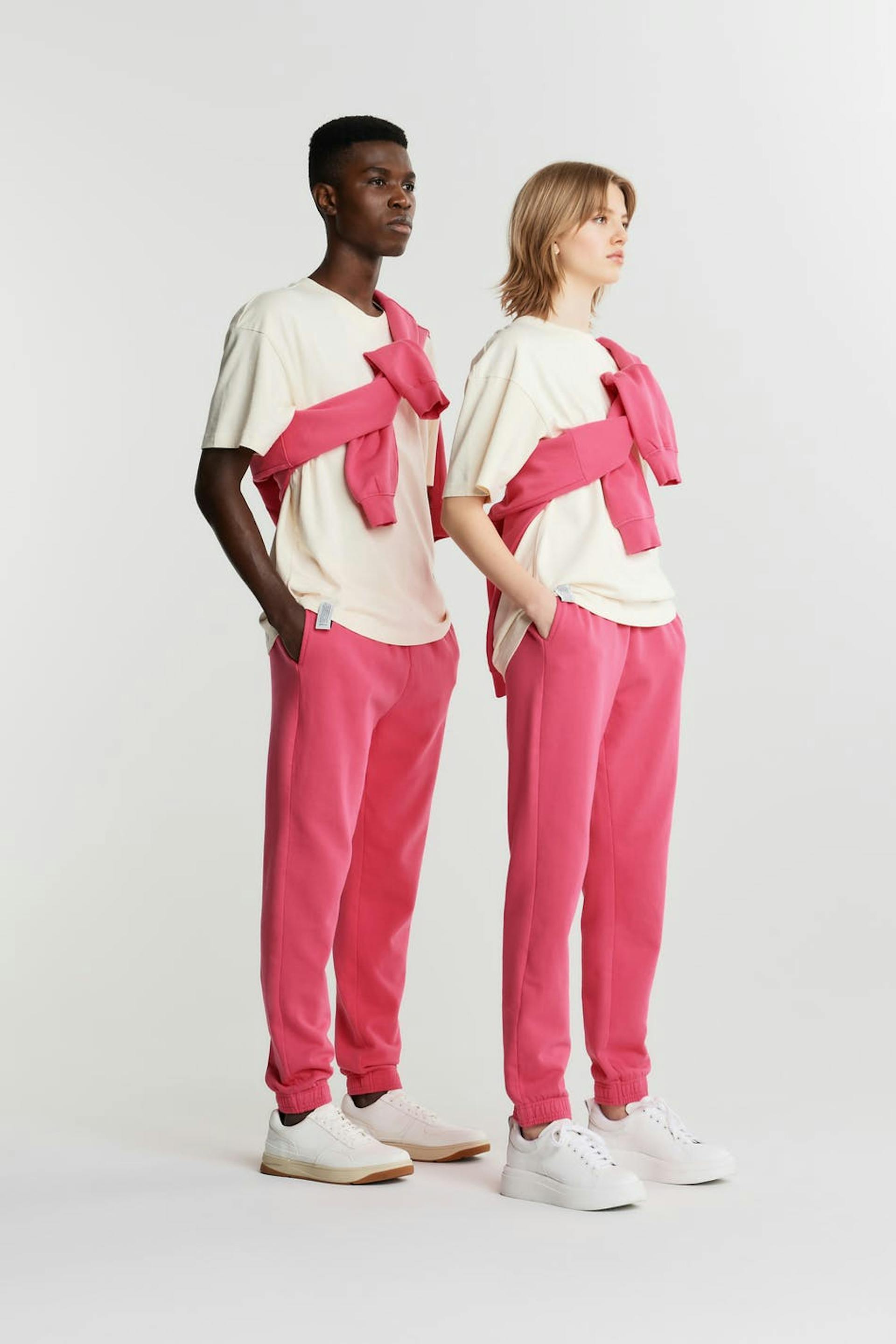 Unisex tracksuit trousers by Gina Lab with a waist with soft elastic and a drawstring. Pink, comfortable, timeless and gender-neutral. They have pockets on the sides and an elastic band at the end of the legs.