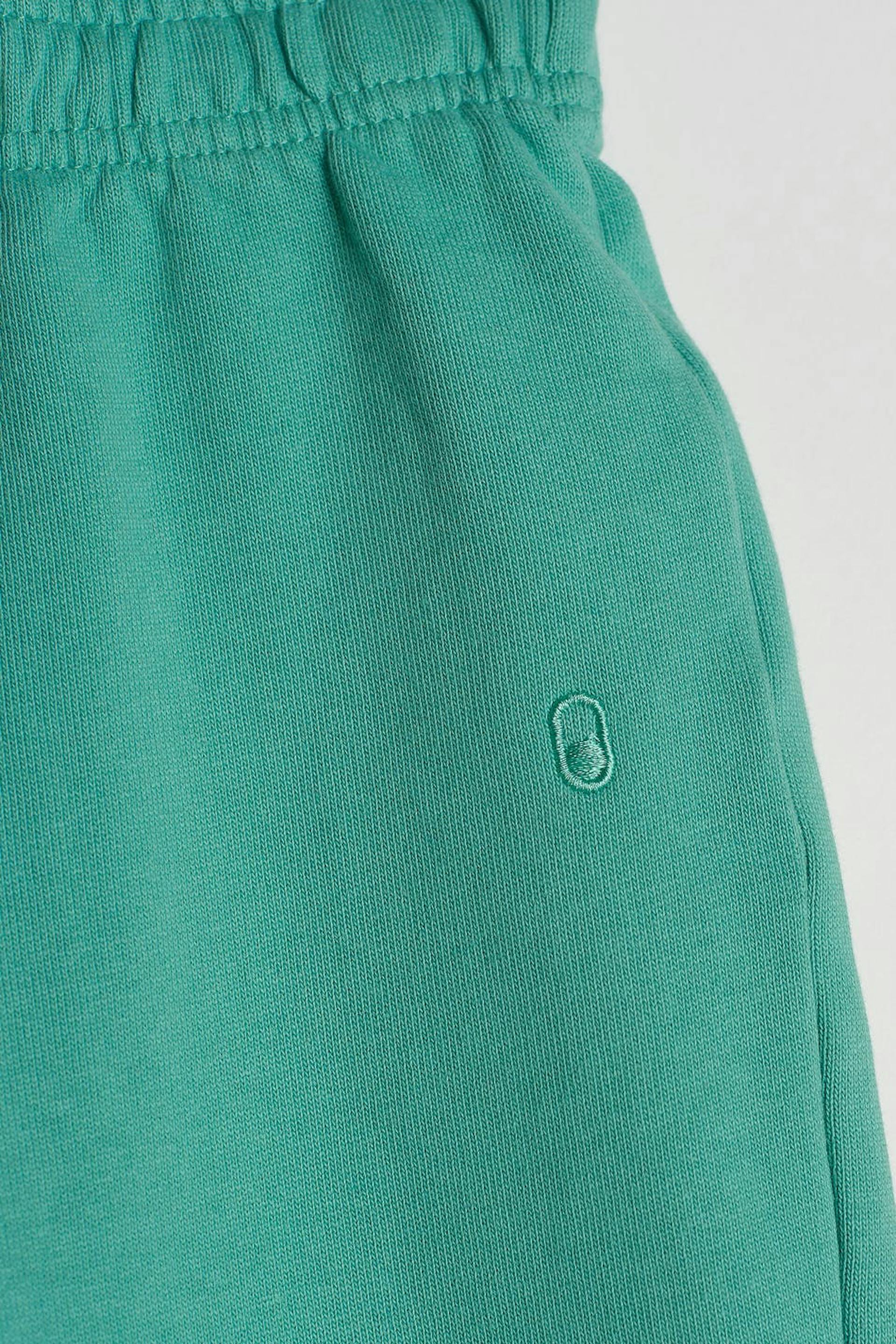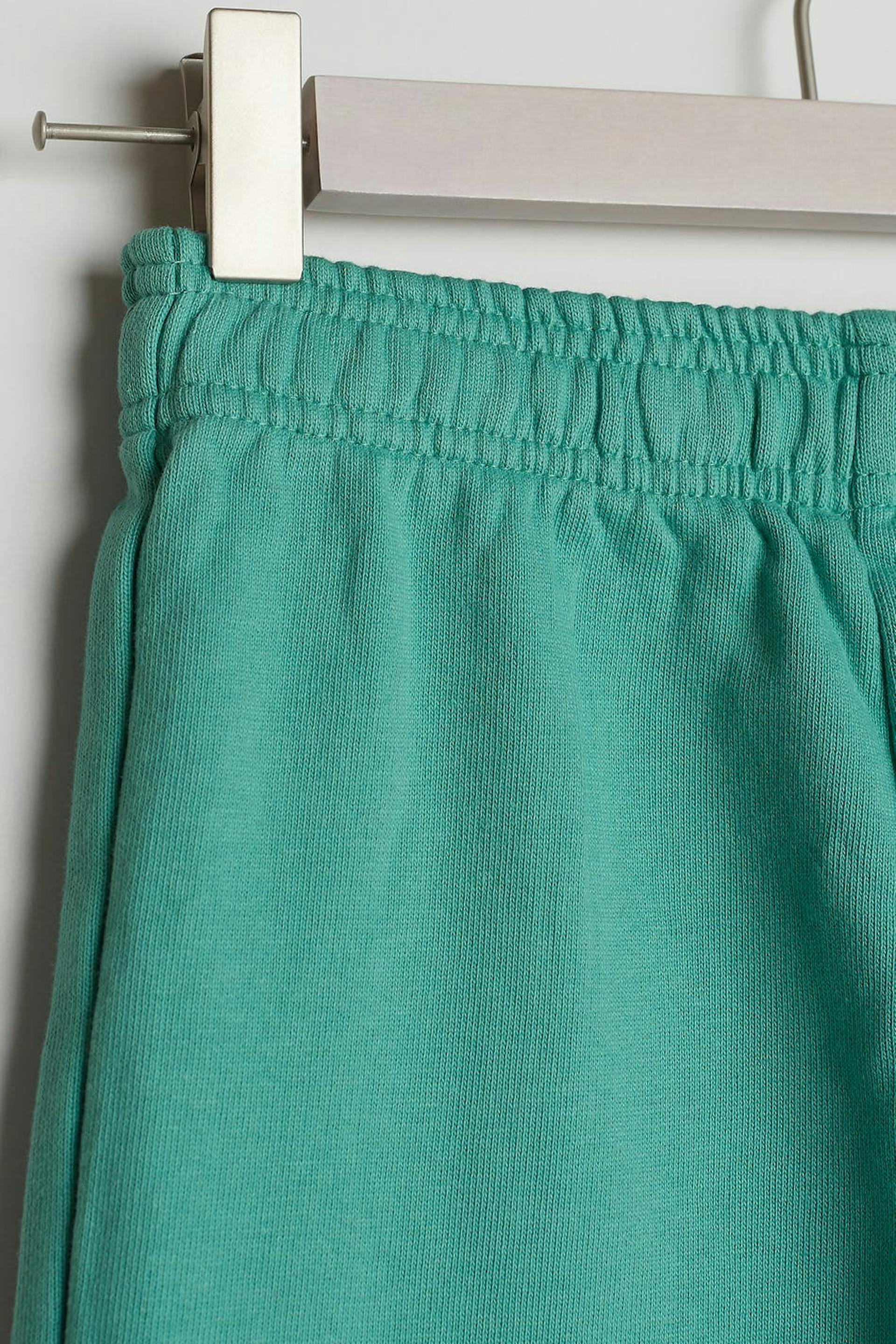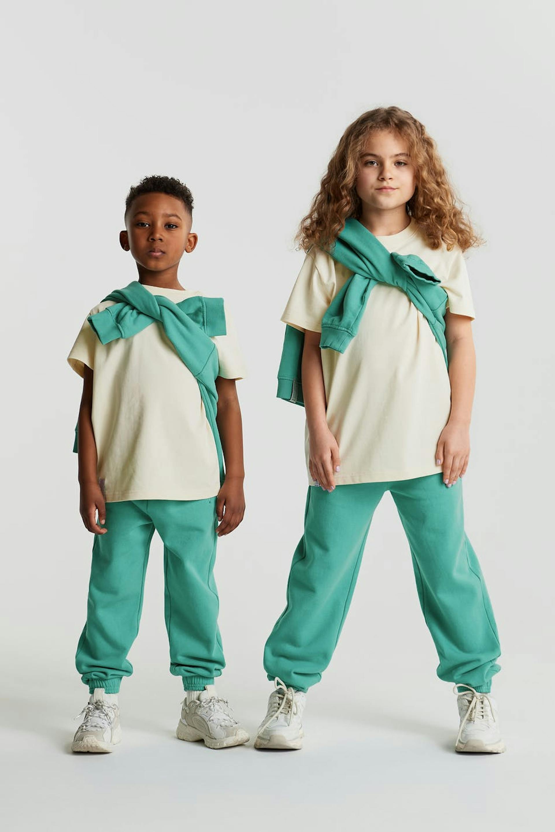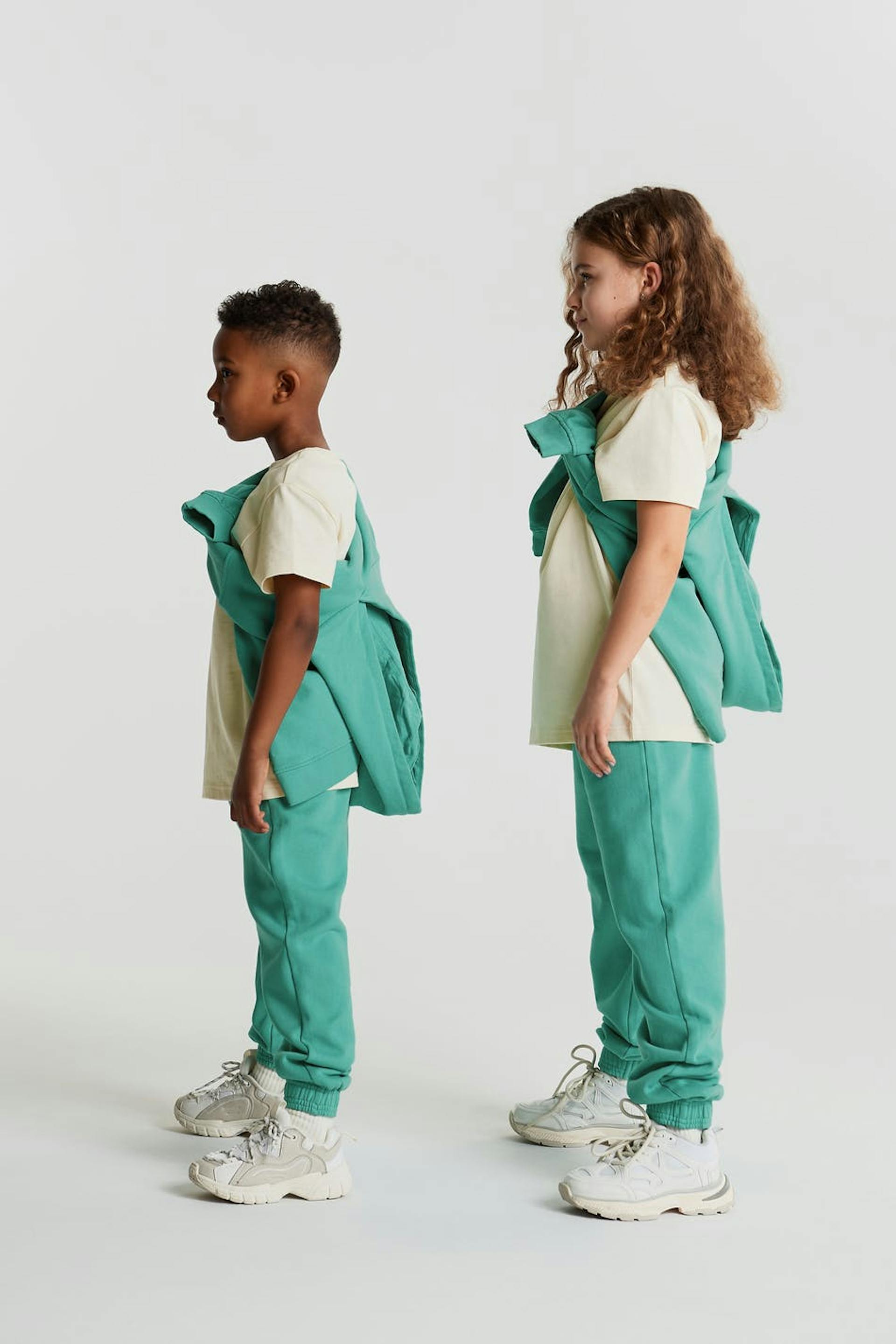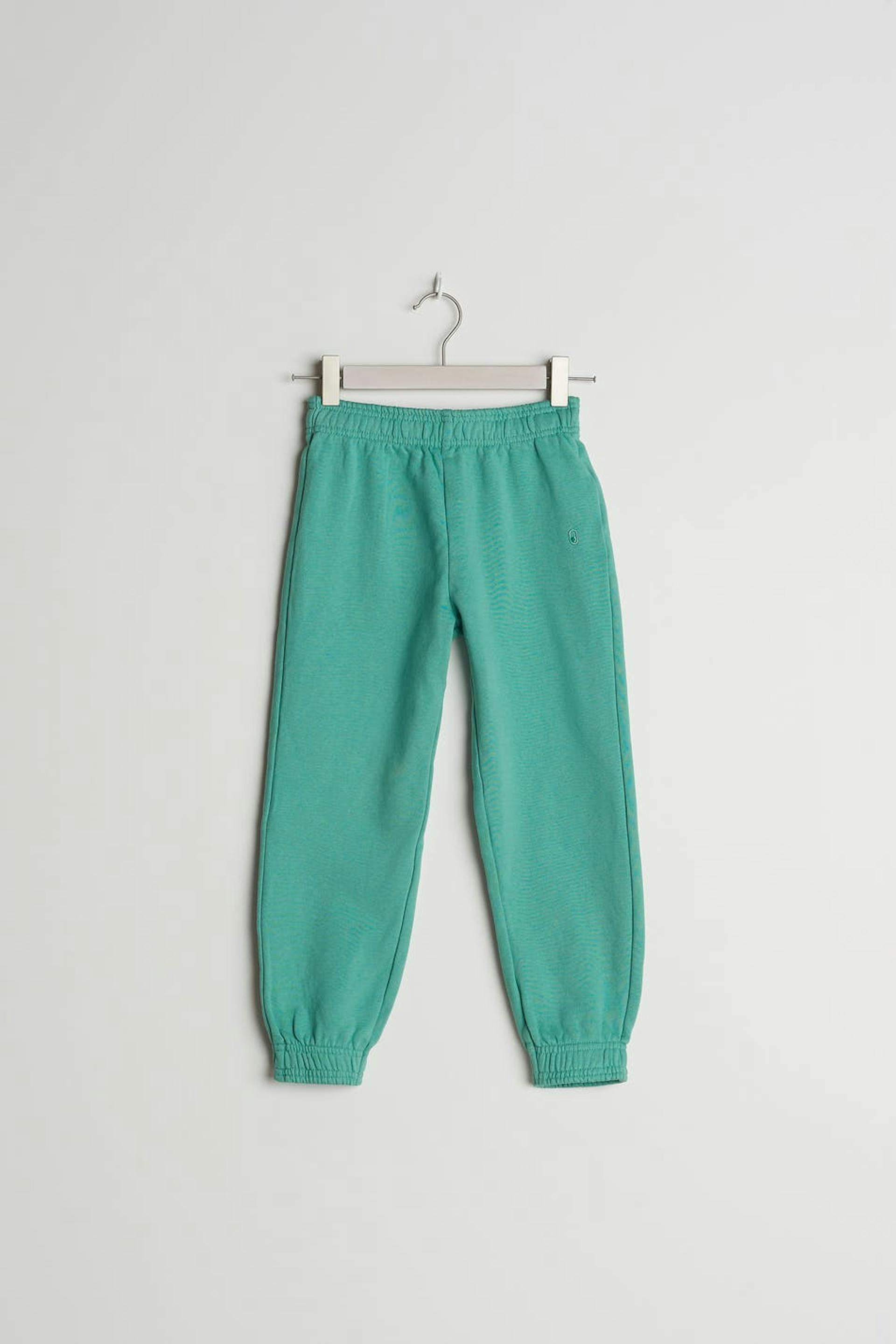 Unisex tracksuit trousers by Gina Lab for children with a regular fit. Green, gender-neutral, timeless and comfortable. They have an elastic band at the end of the legs and a waist in elastic with a drawstring.