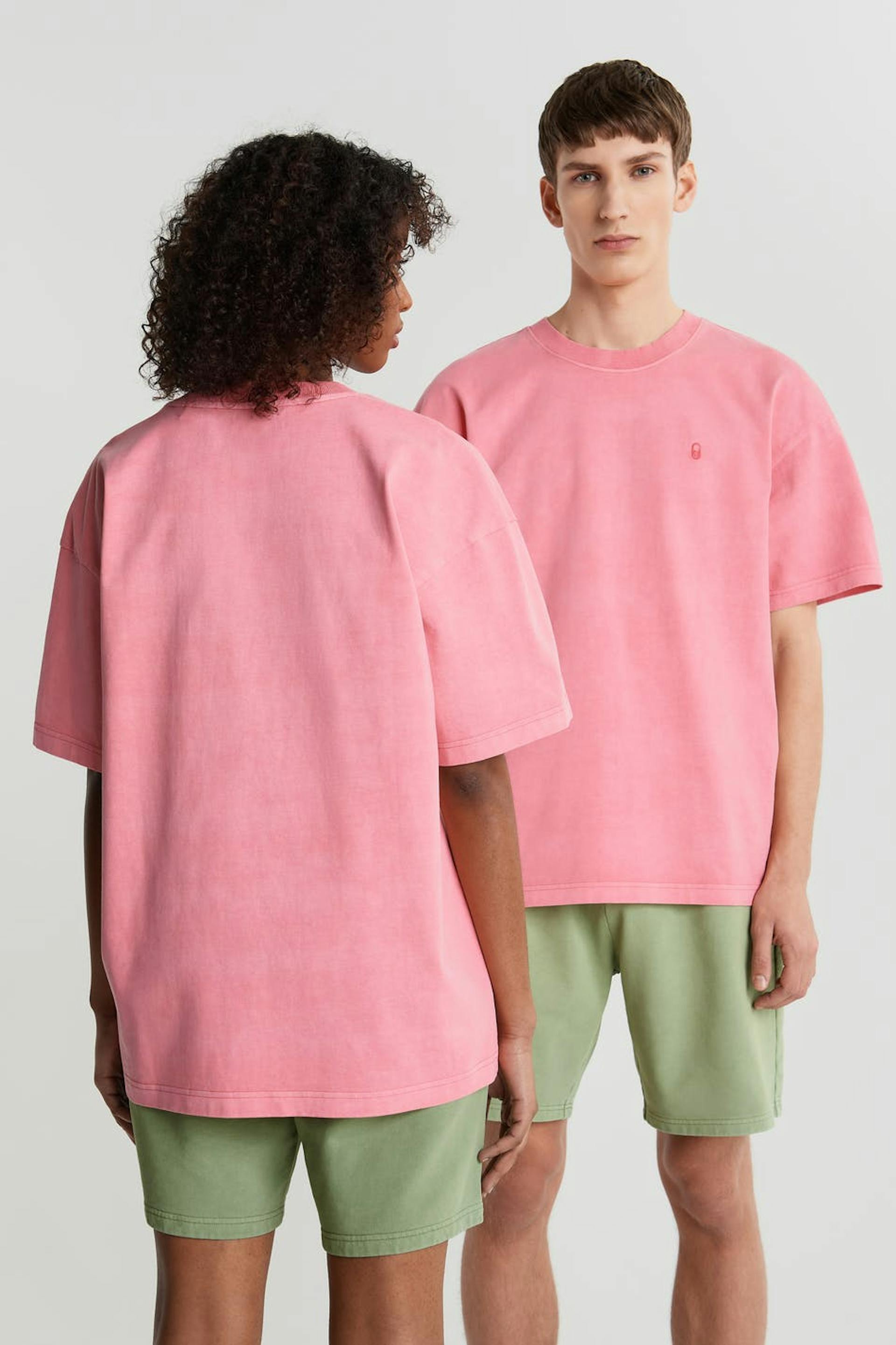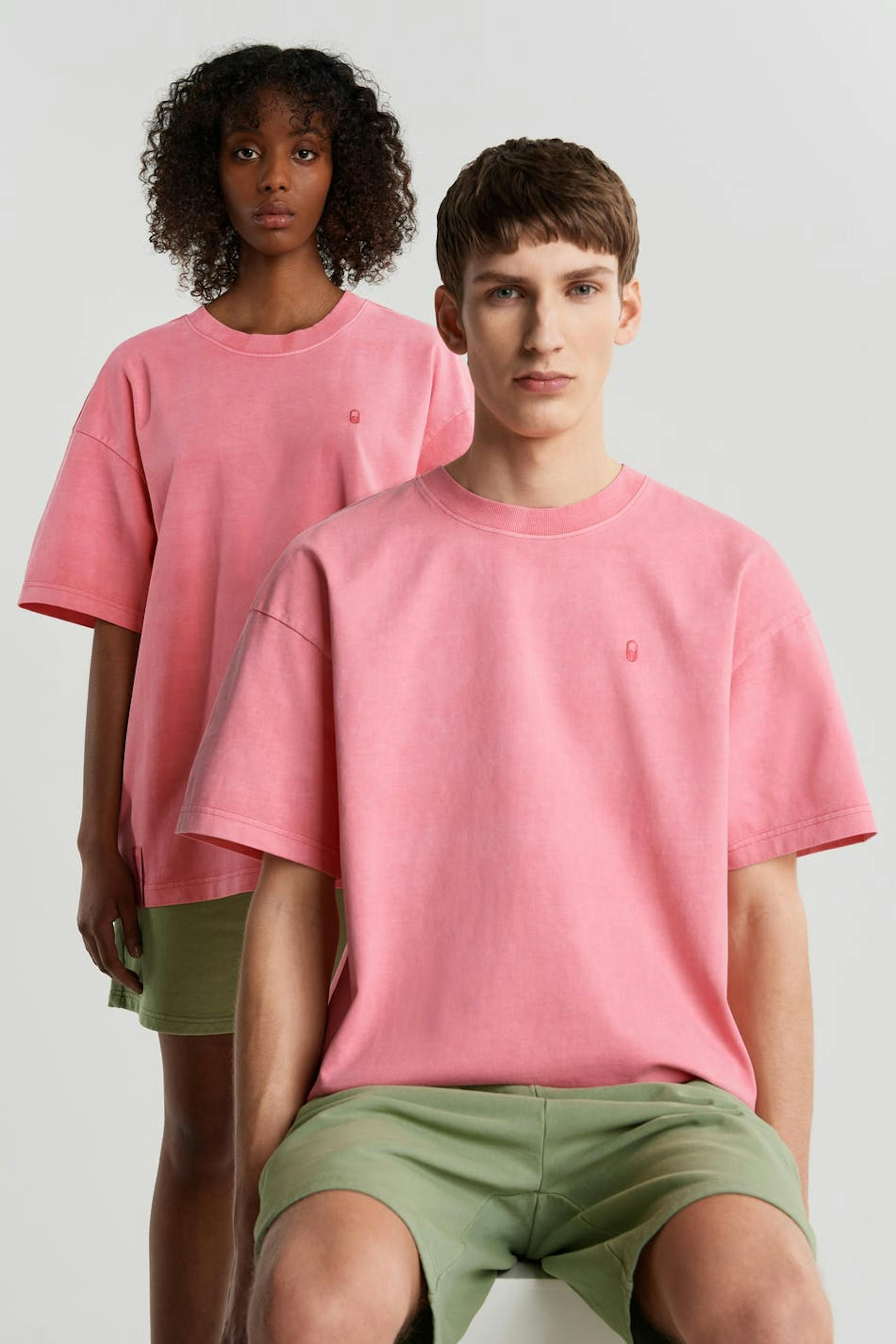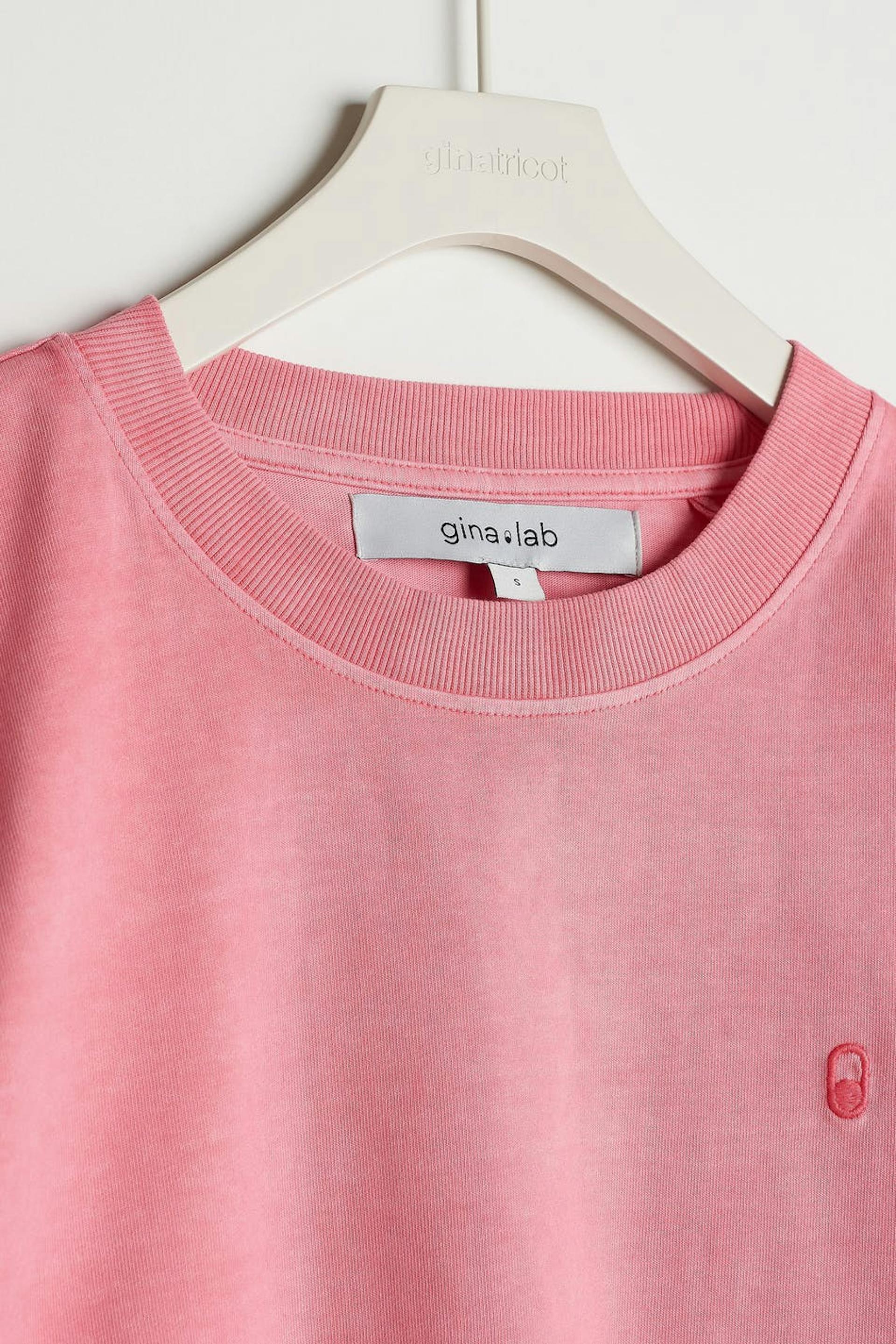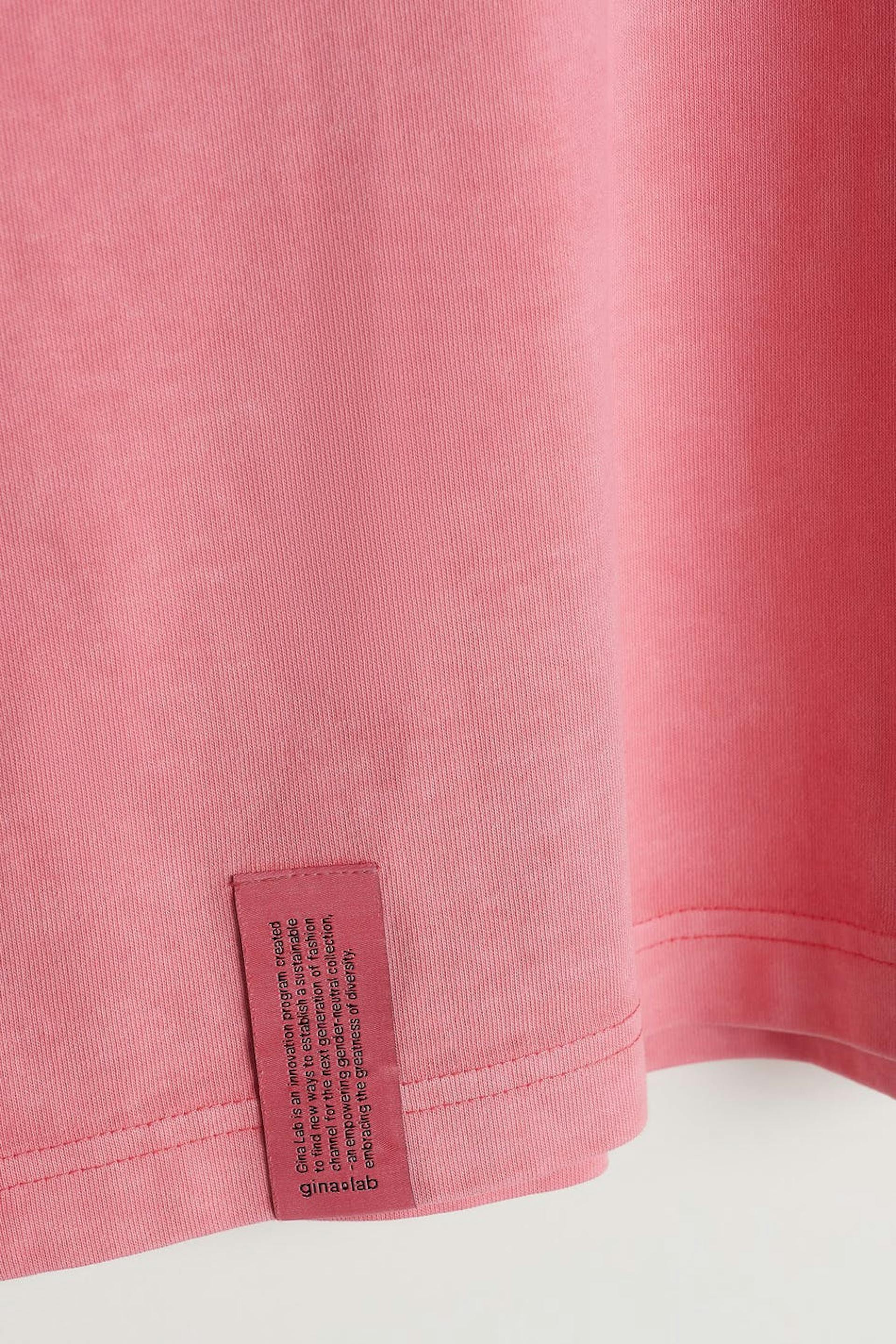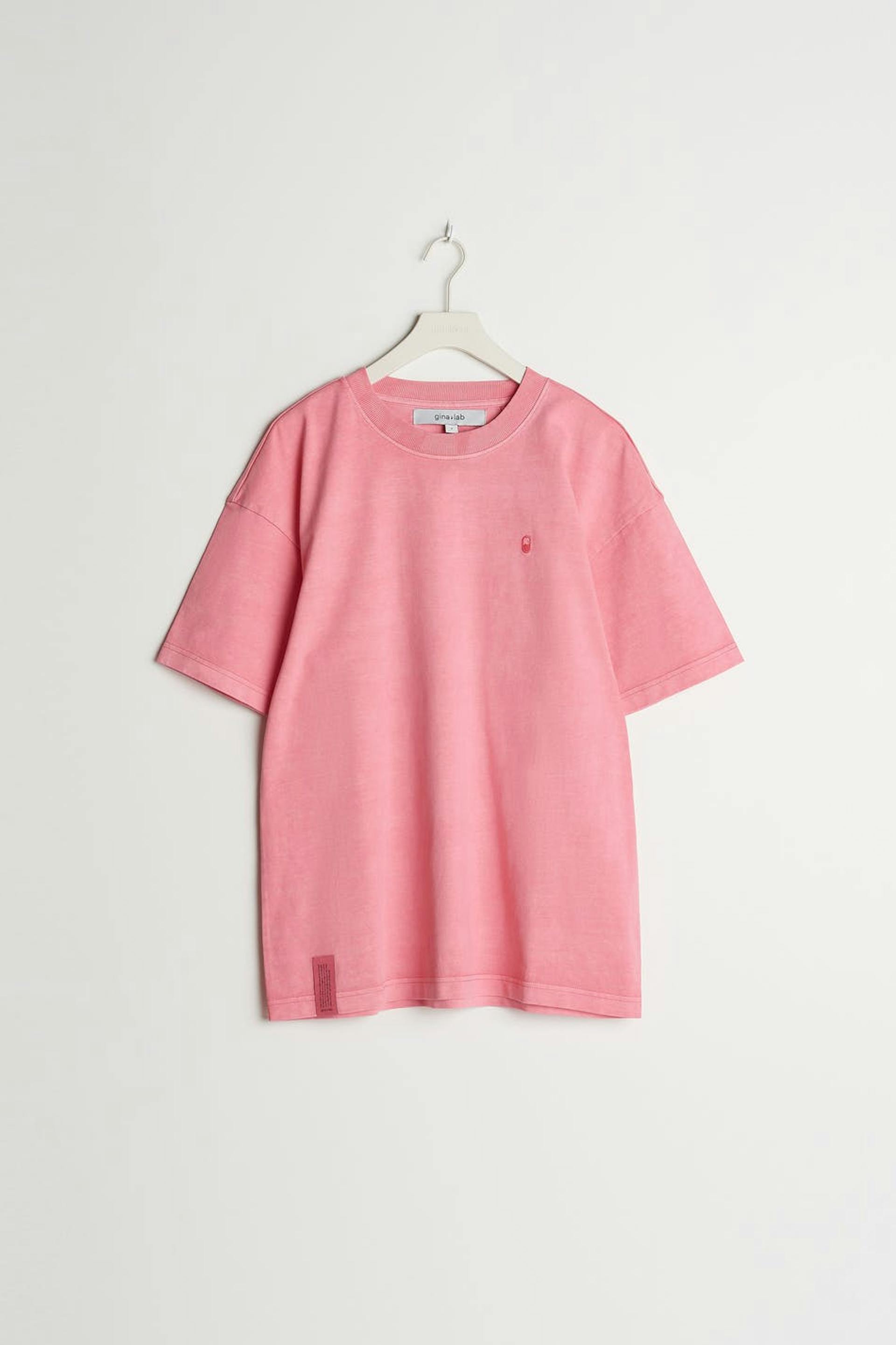 Unisex top with an oversize fit. The top is pink and gender-neutral and has an embroidered logo on the chest. GOTS certified, Mineral dye.