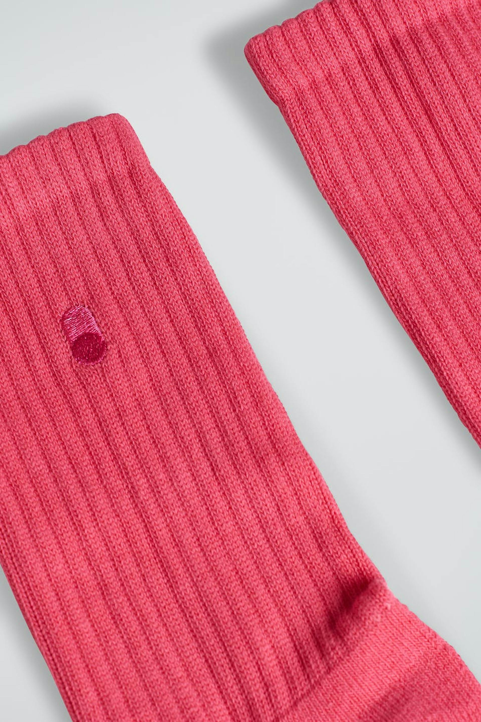 Socks by Gina Lab with an embroidered logo. The socks are pink.