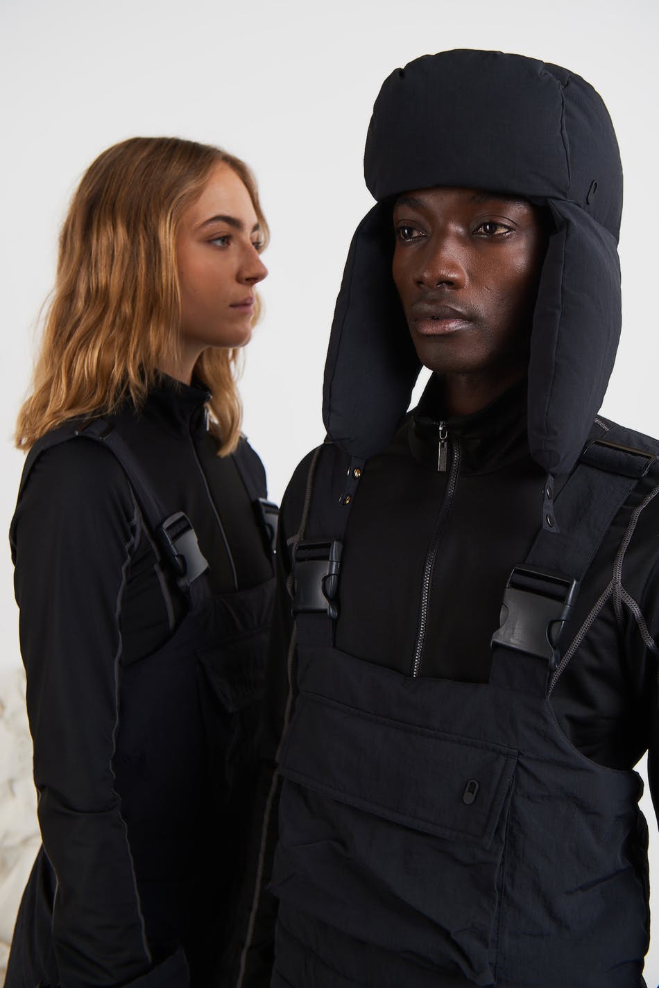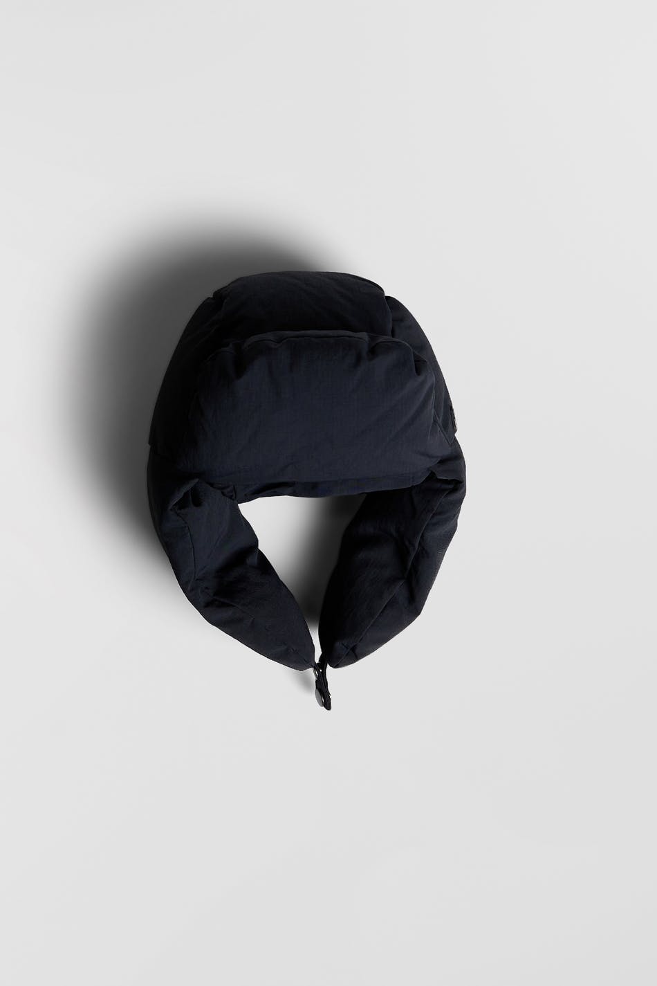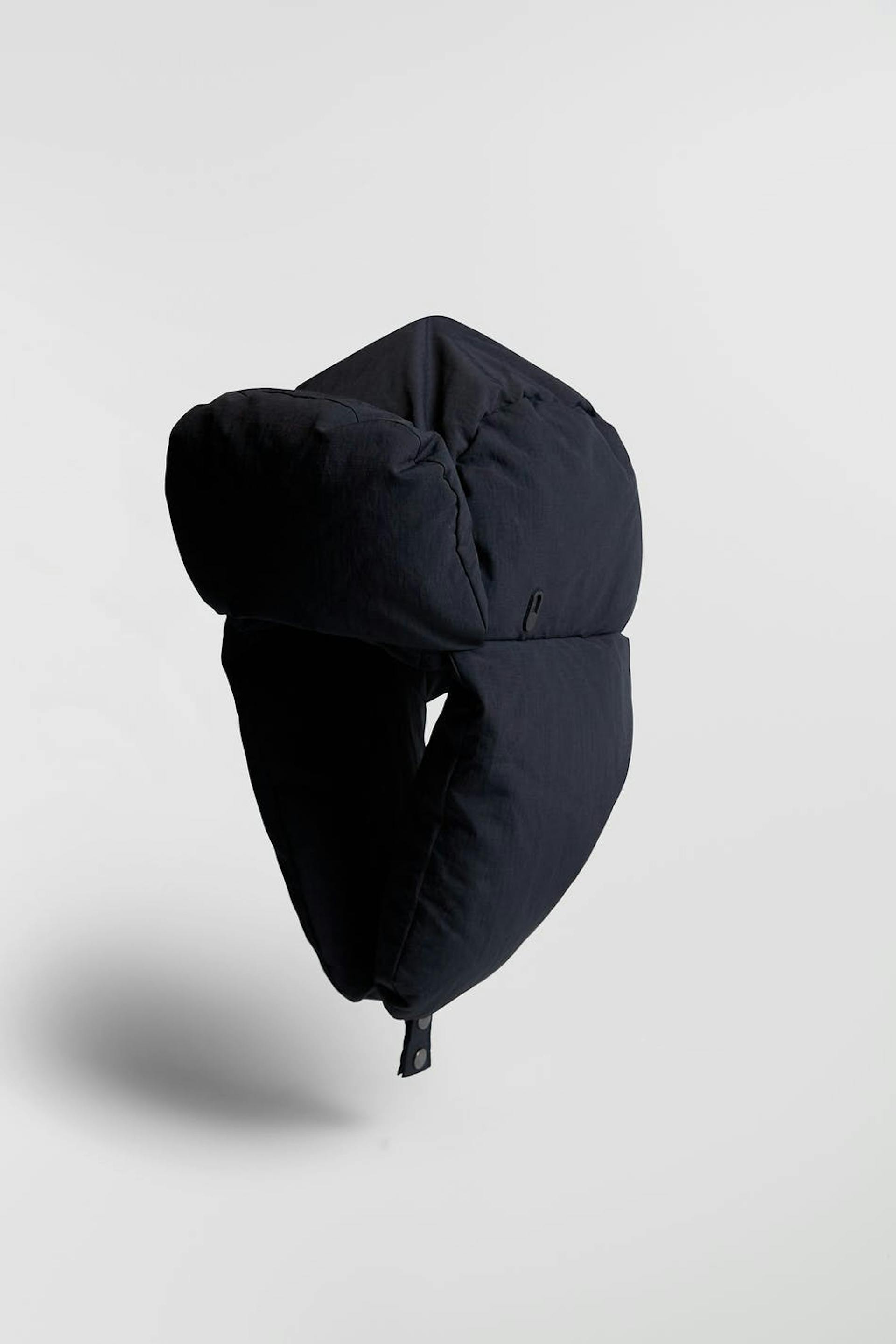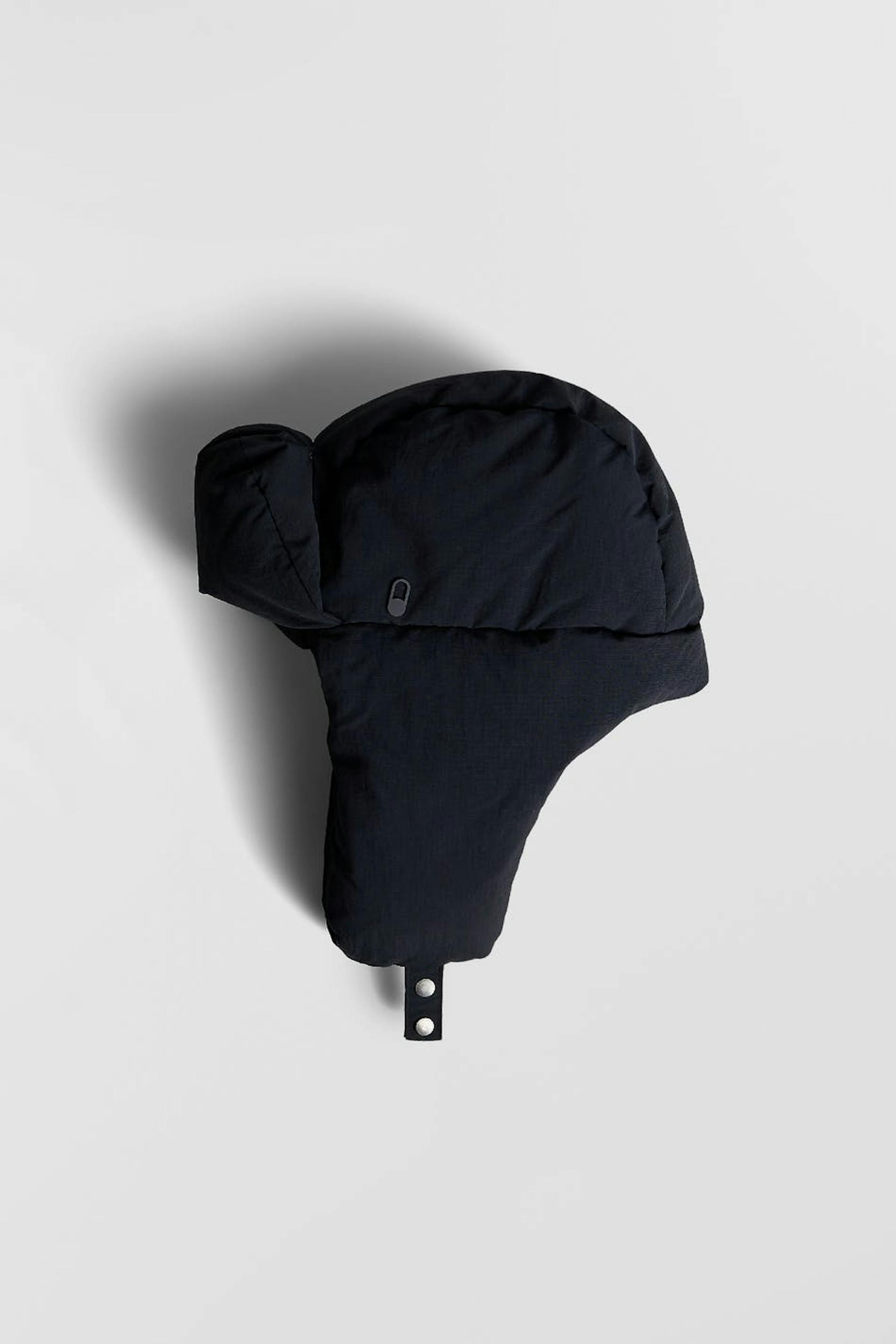 Padded beanie by Gina Lab with earflaps. The beanie is black and has a material in recycled polyamide. It has a button placket under the chin and filling in recycled down.