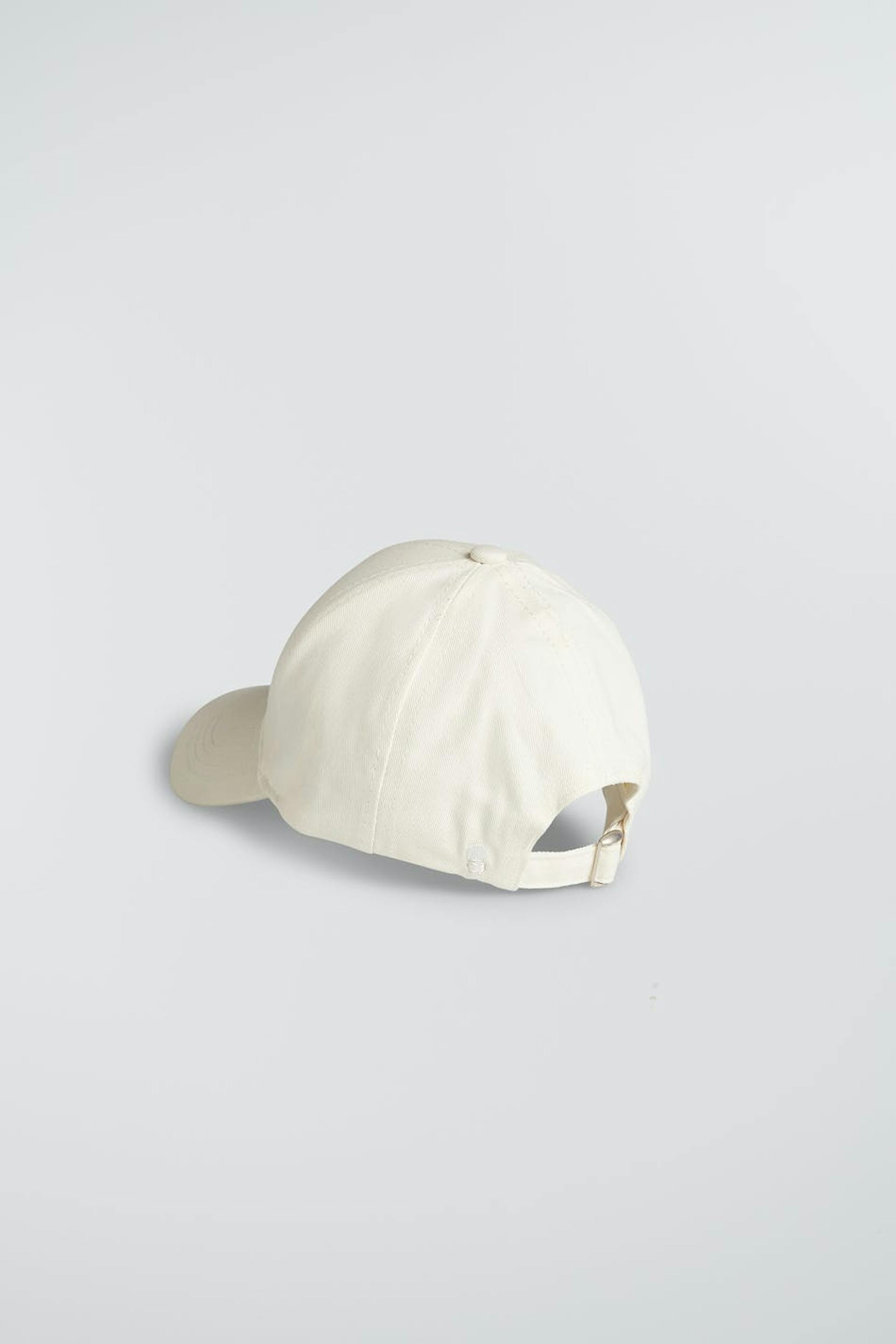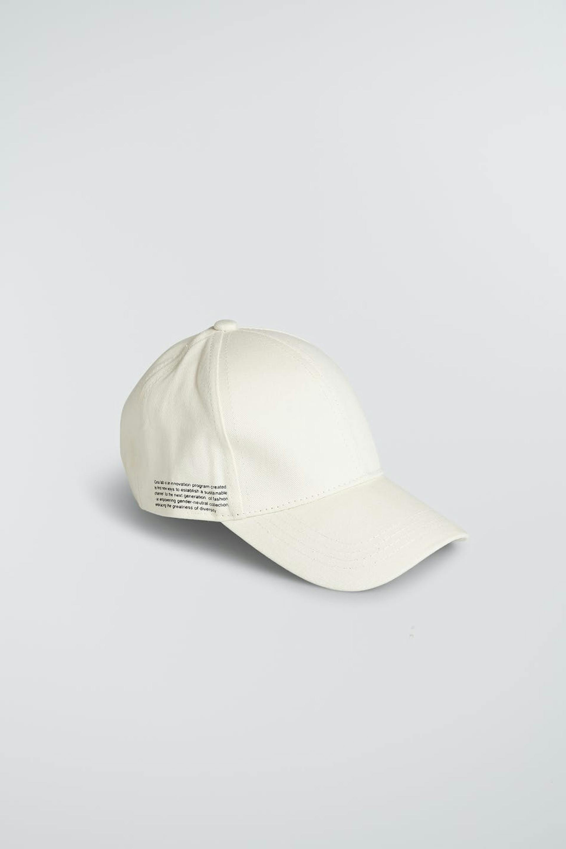 Cap by Gina Lab for children with adjustable sizes. The cap is light beige and has a small print with a text on one side.