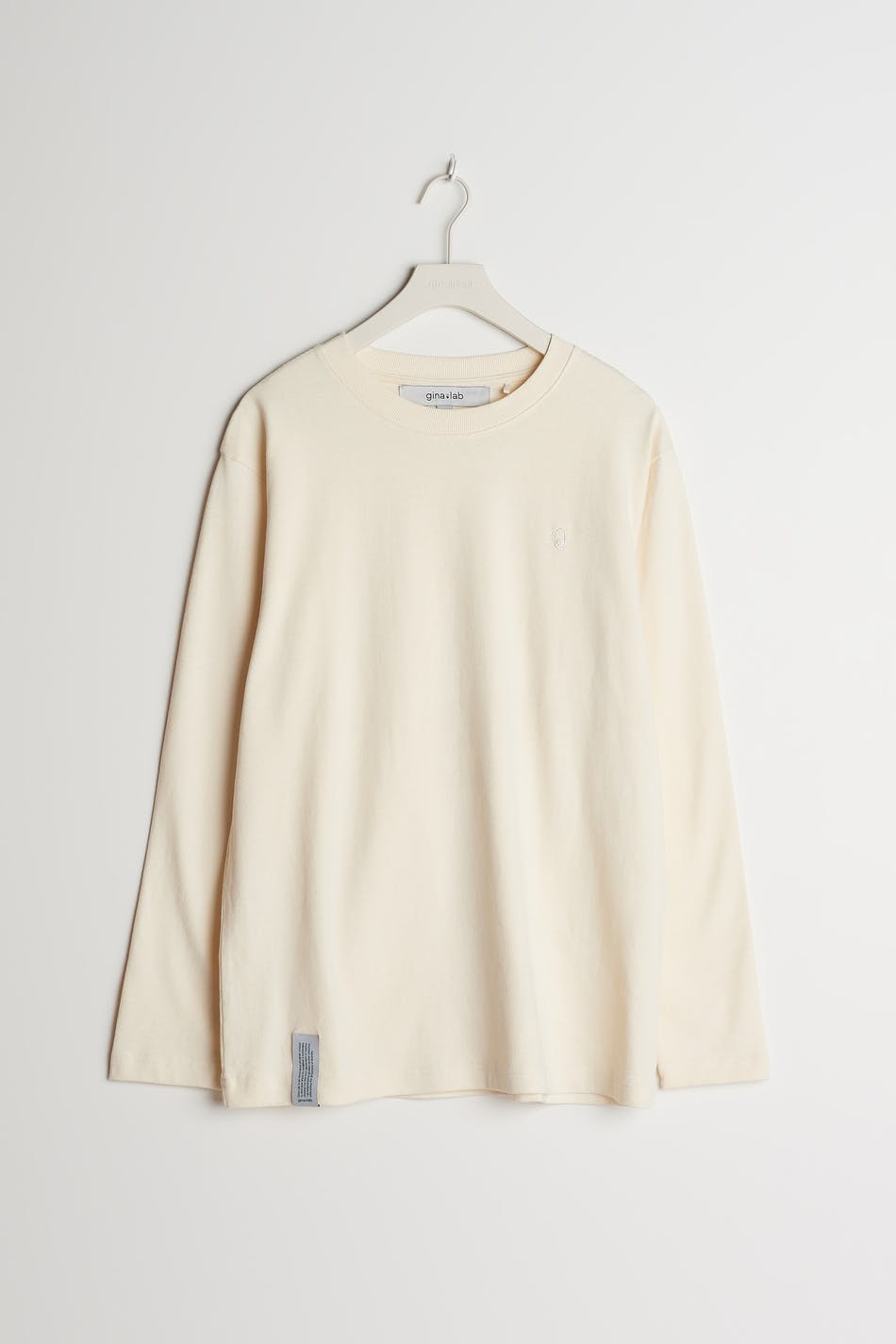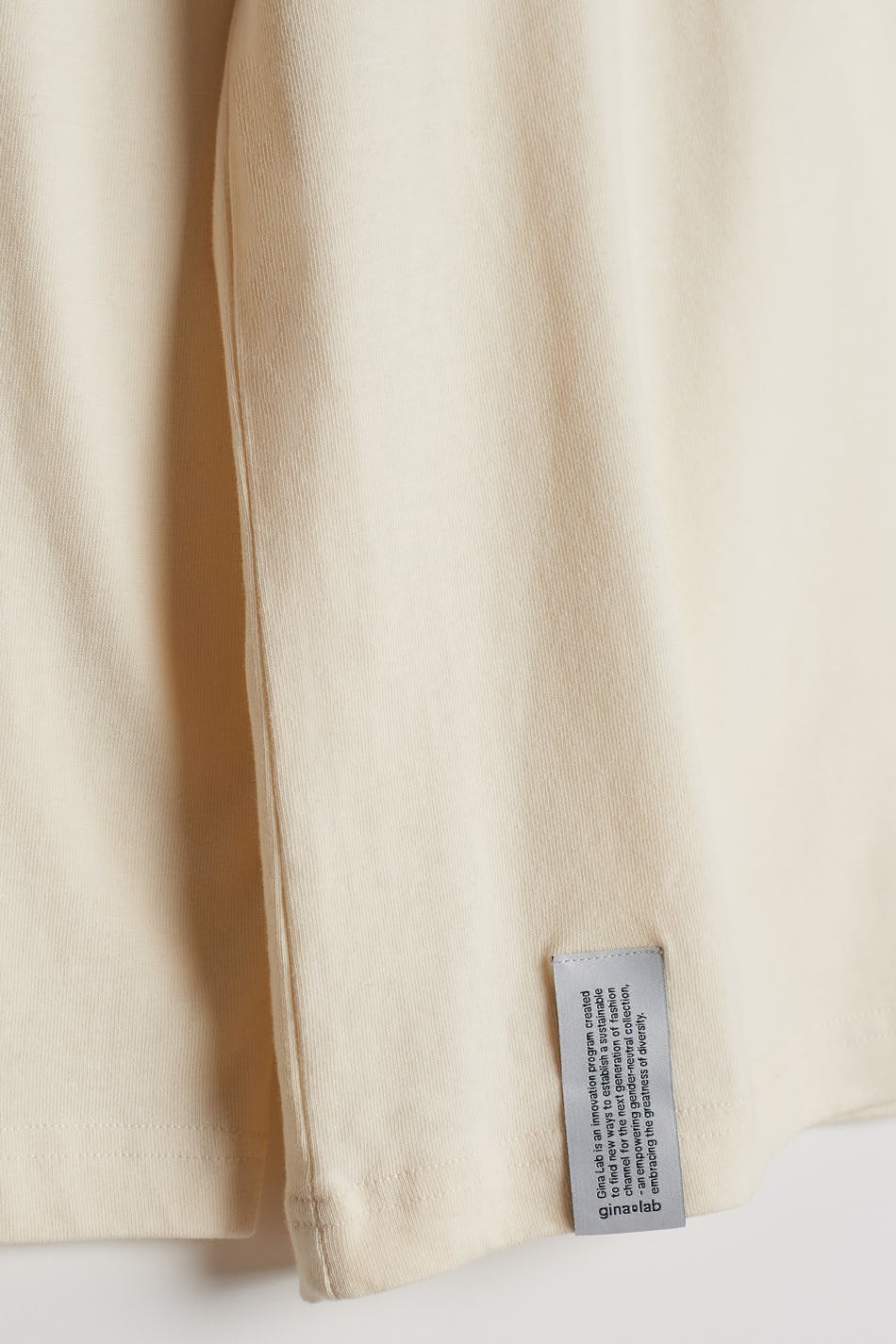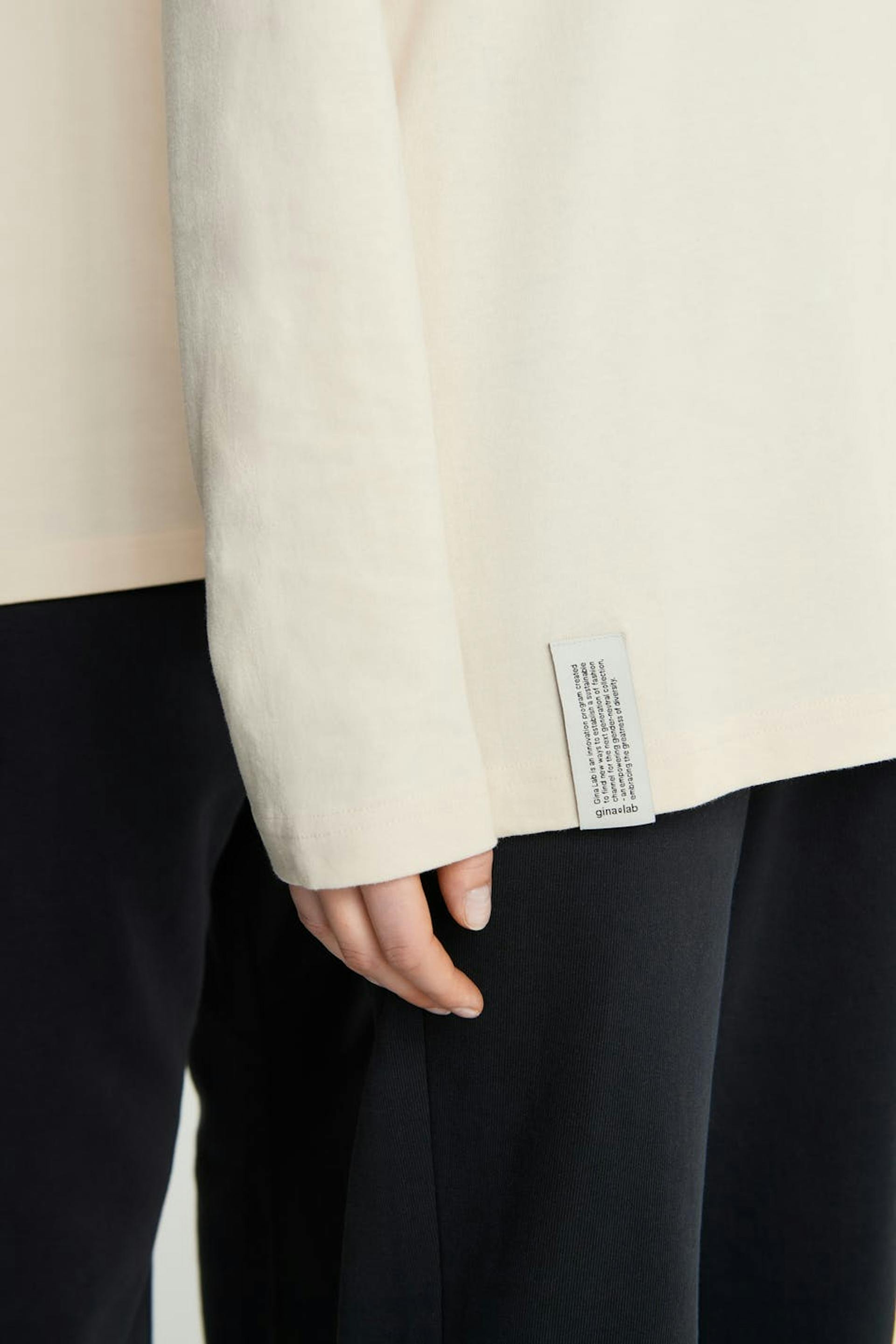 Long-sleeved top by Gina Lab with an oversize fit. Light beige, unisex, gender-neutral and timeless. It has a ribbed cuff on the neckline and a small, embroidered logo on the chest.