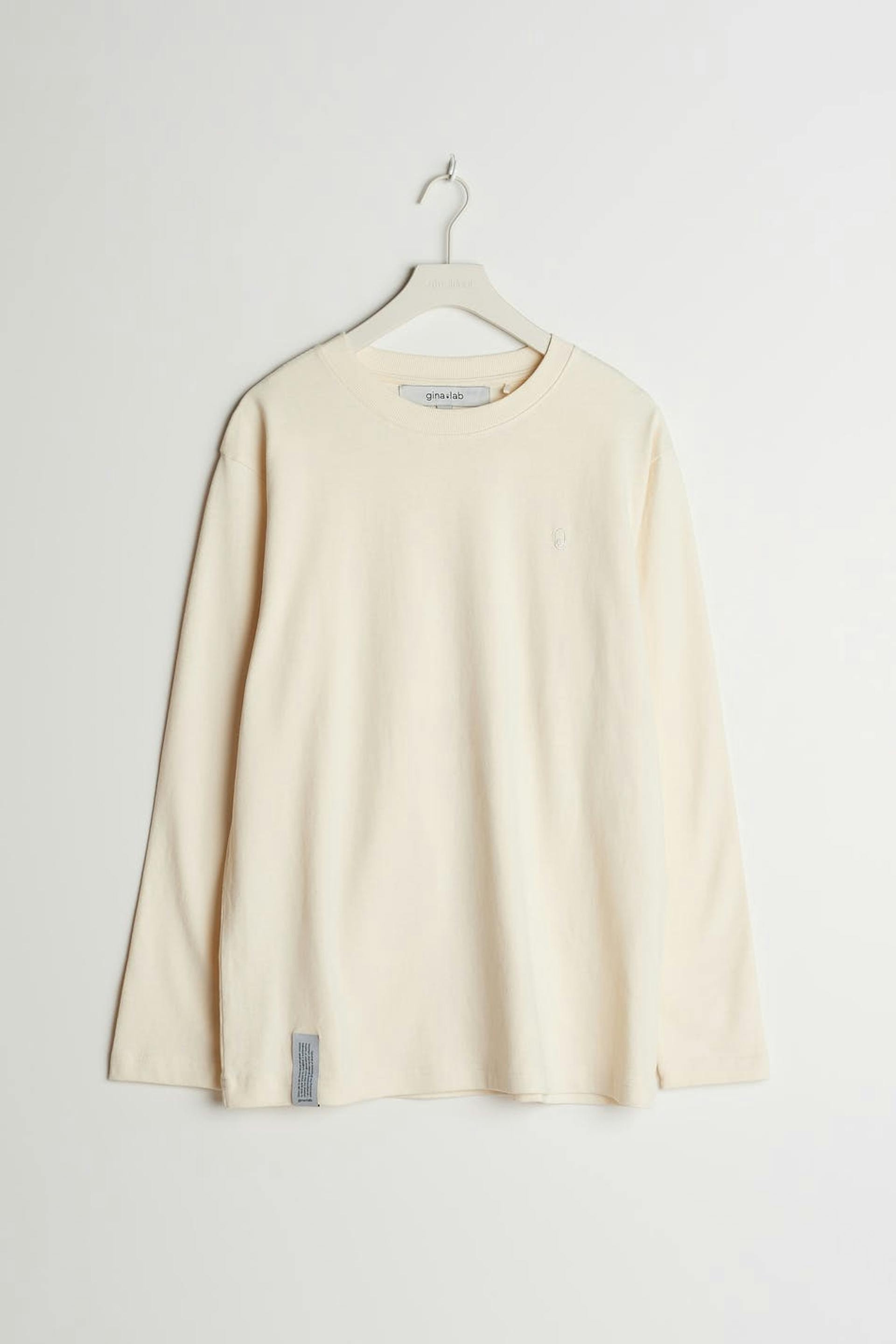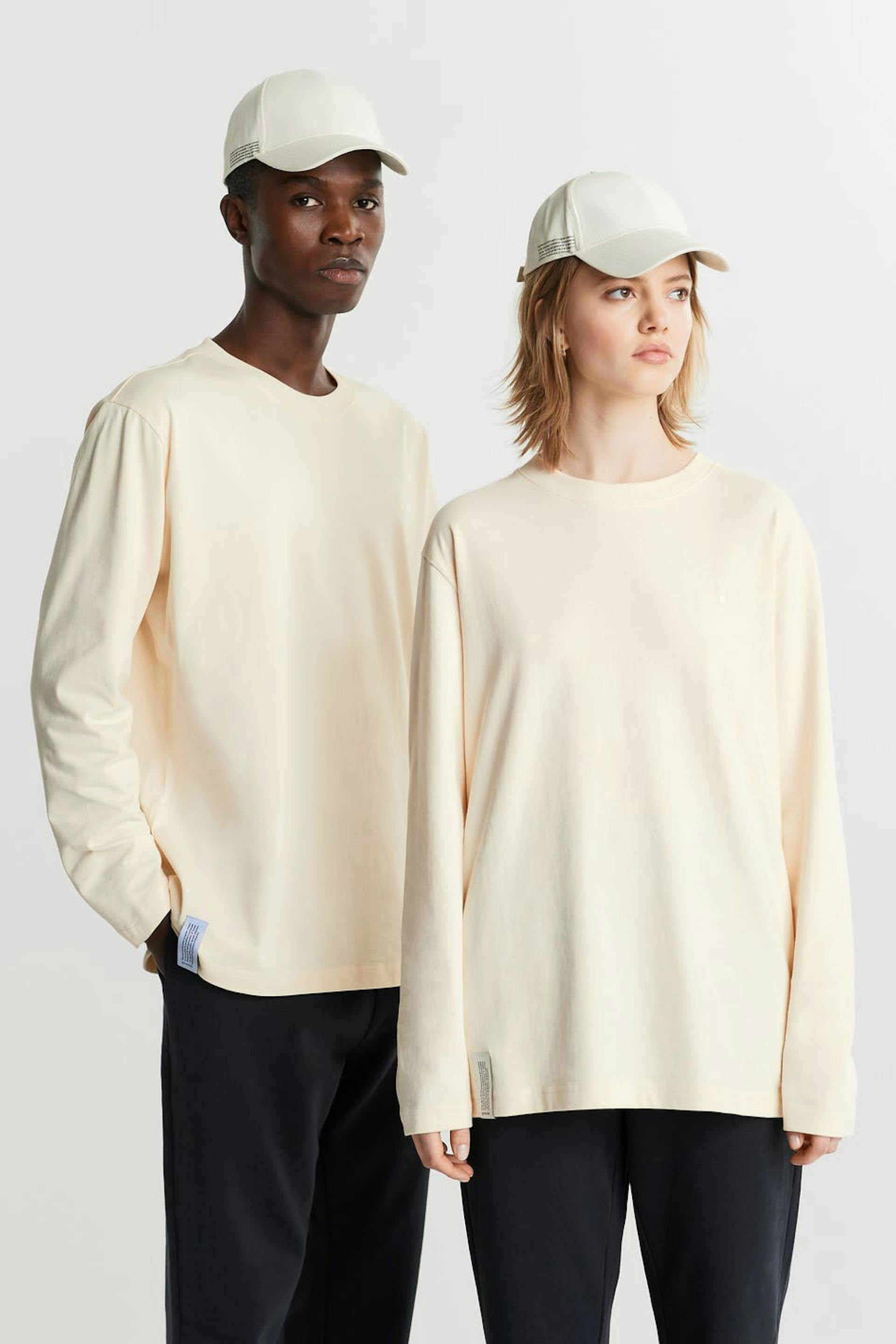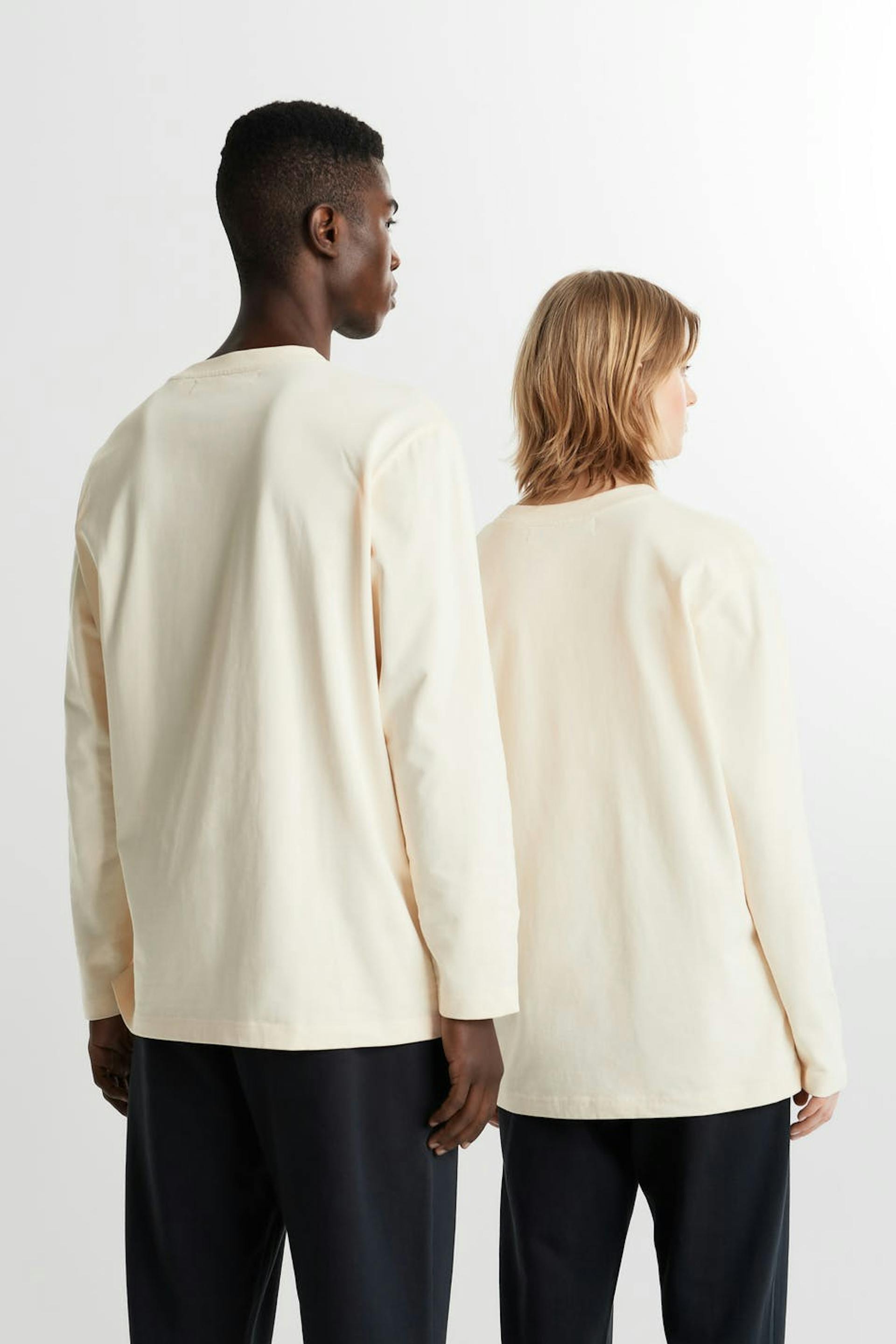 Long-sleeved top by Gina Lab with an oversize fit. Light beige, unisex, gender-neutral and timeless. It has a ribbed cuff on the neckline and a small, embroidered logo on the chest.