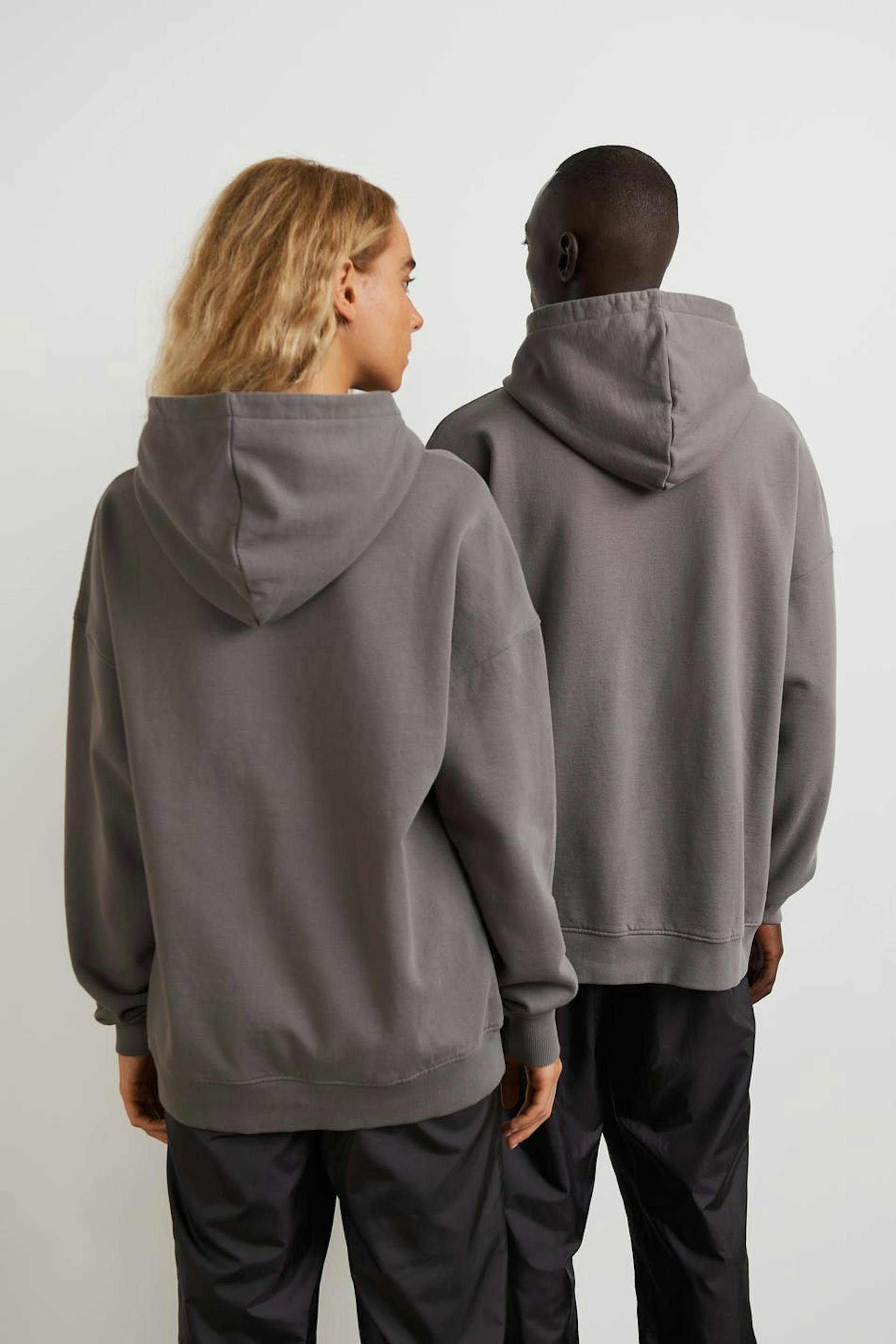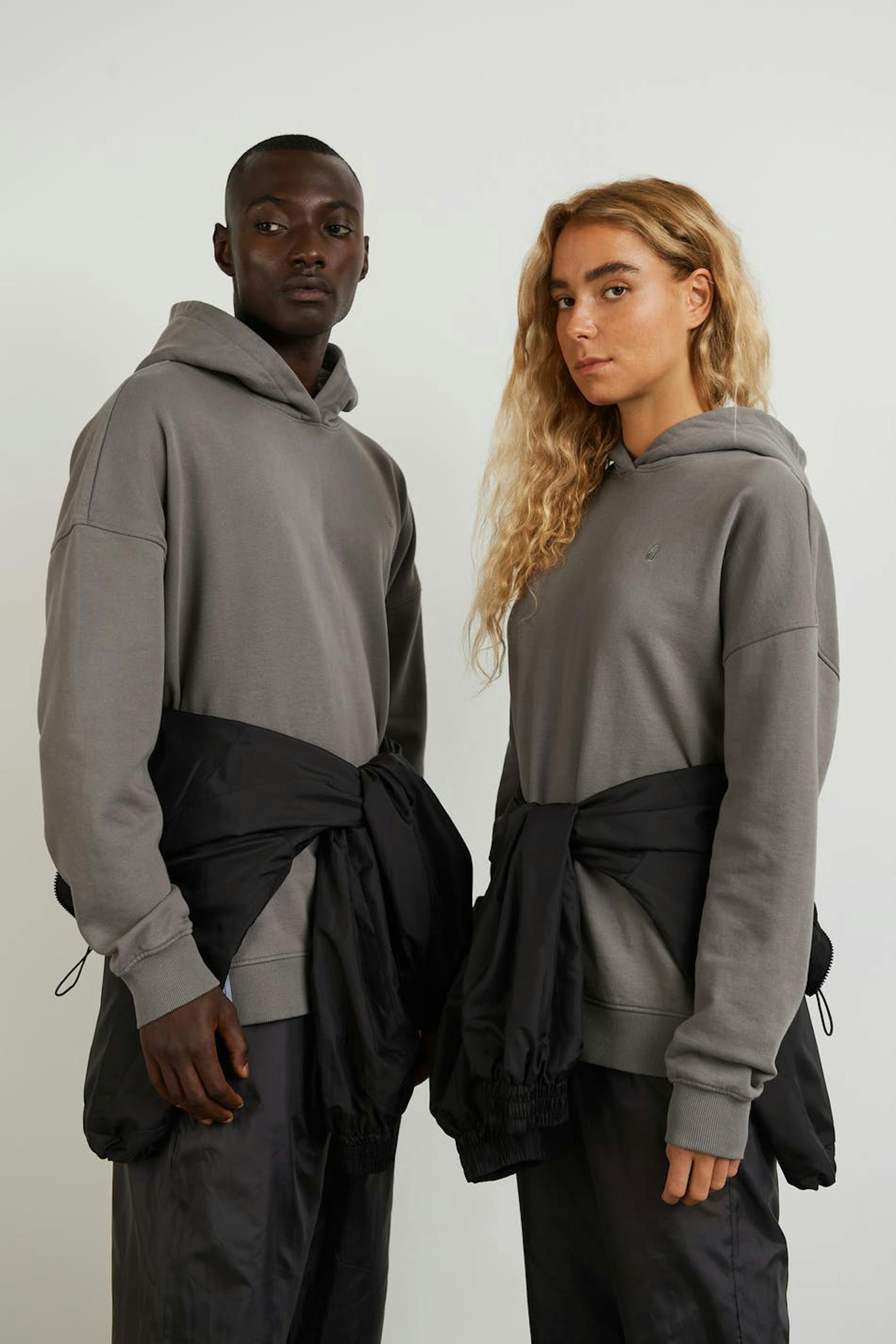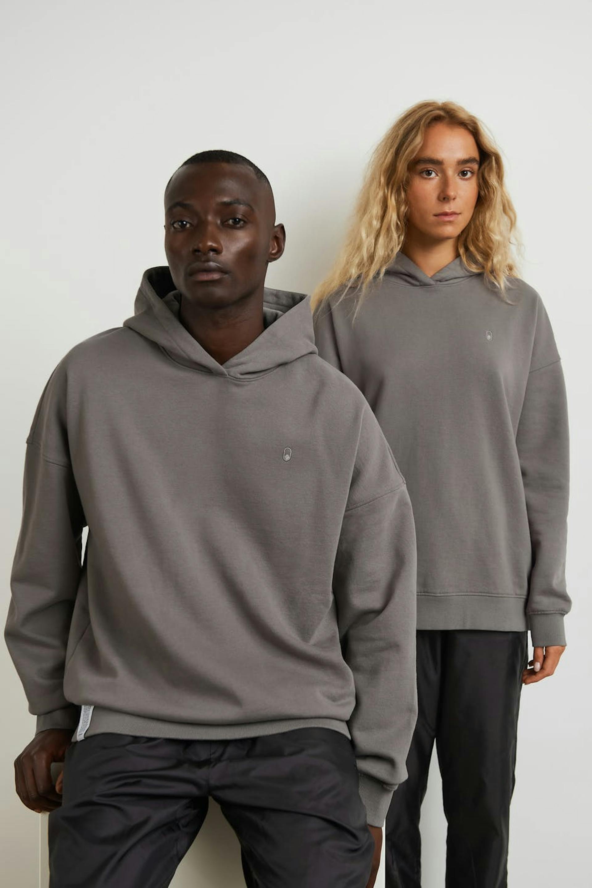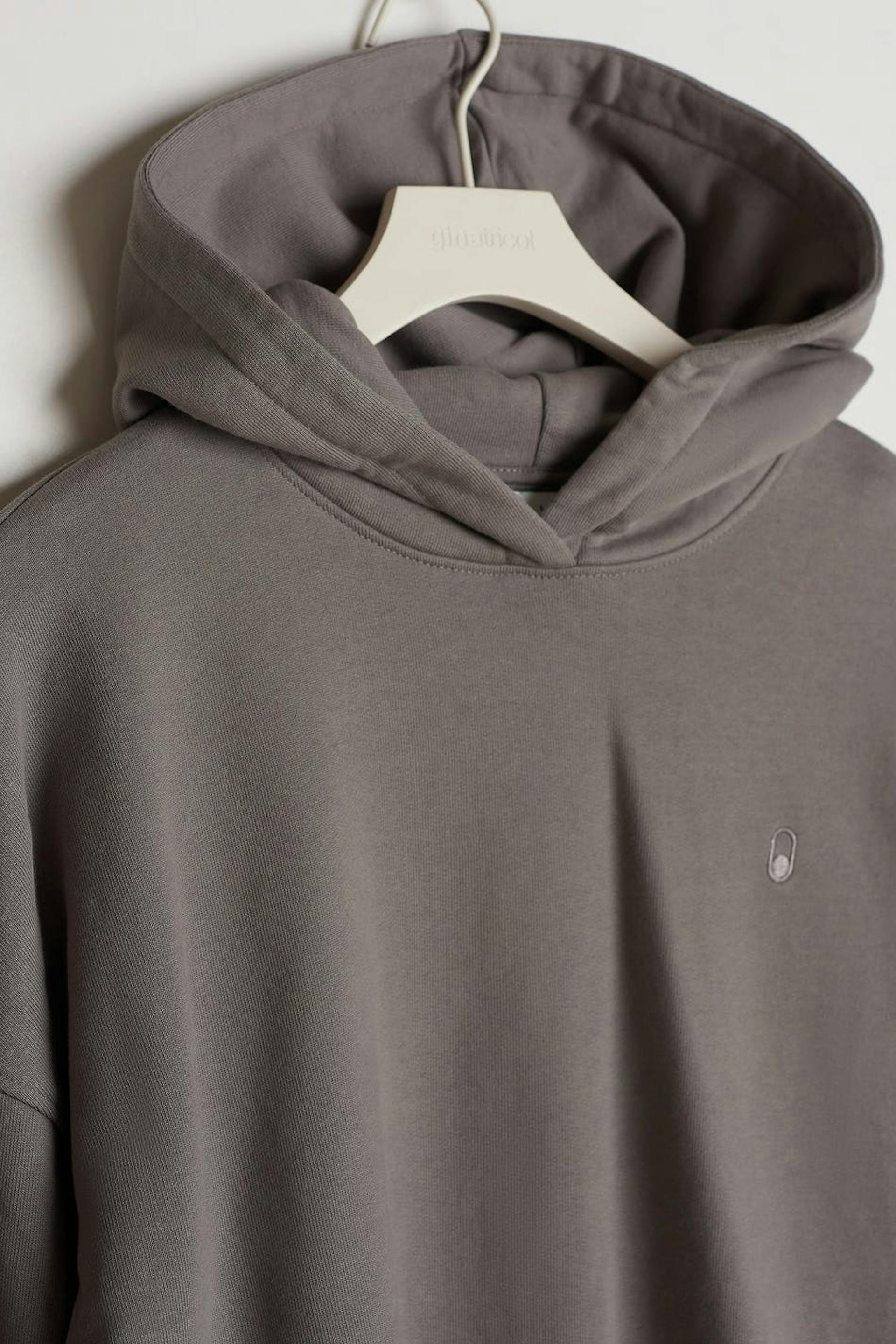 Unisex sweatshirt by Gina Lab with an oversize fit. The sweatshirt is grey, soft and timeless. It has a hood, a ribbed cuff on the sleeve ends and at the hem and a small, embroidered logo on the chest.