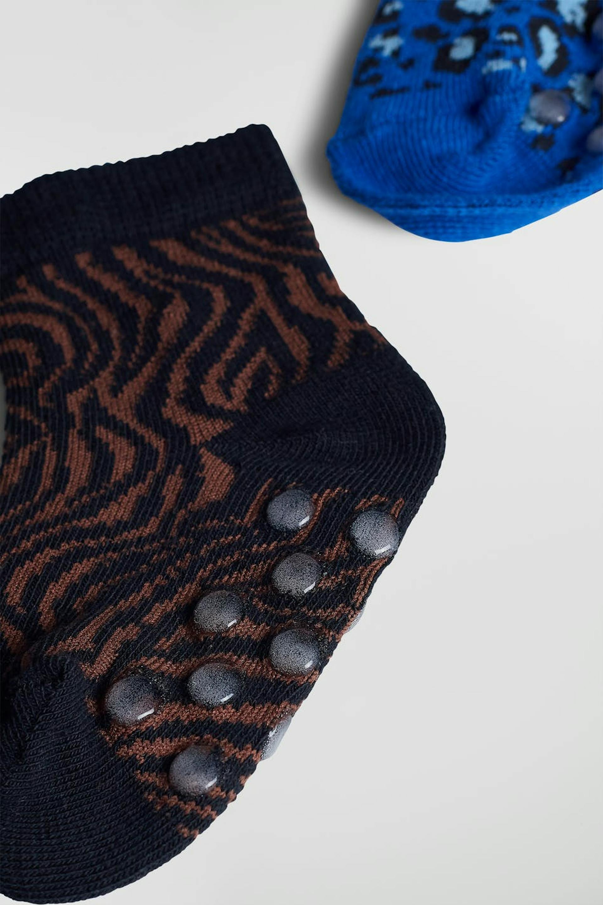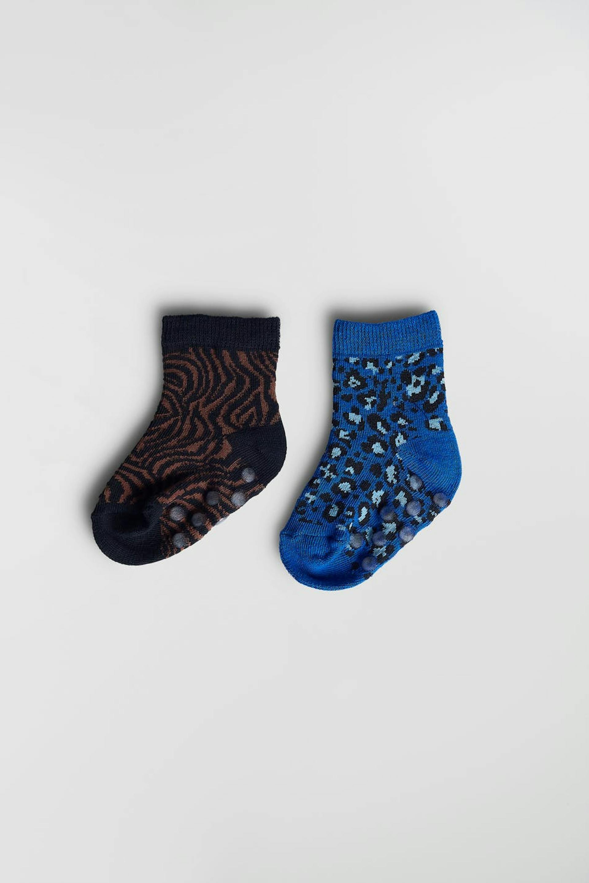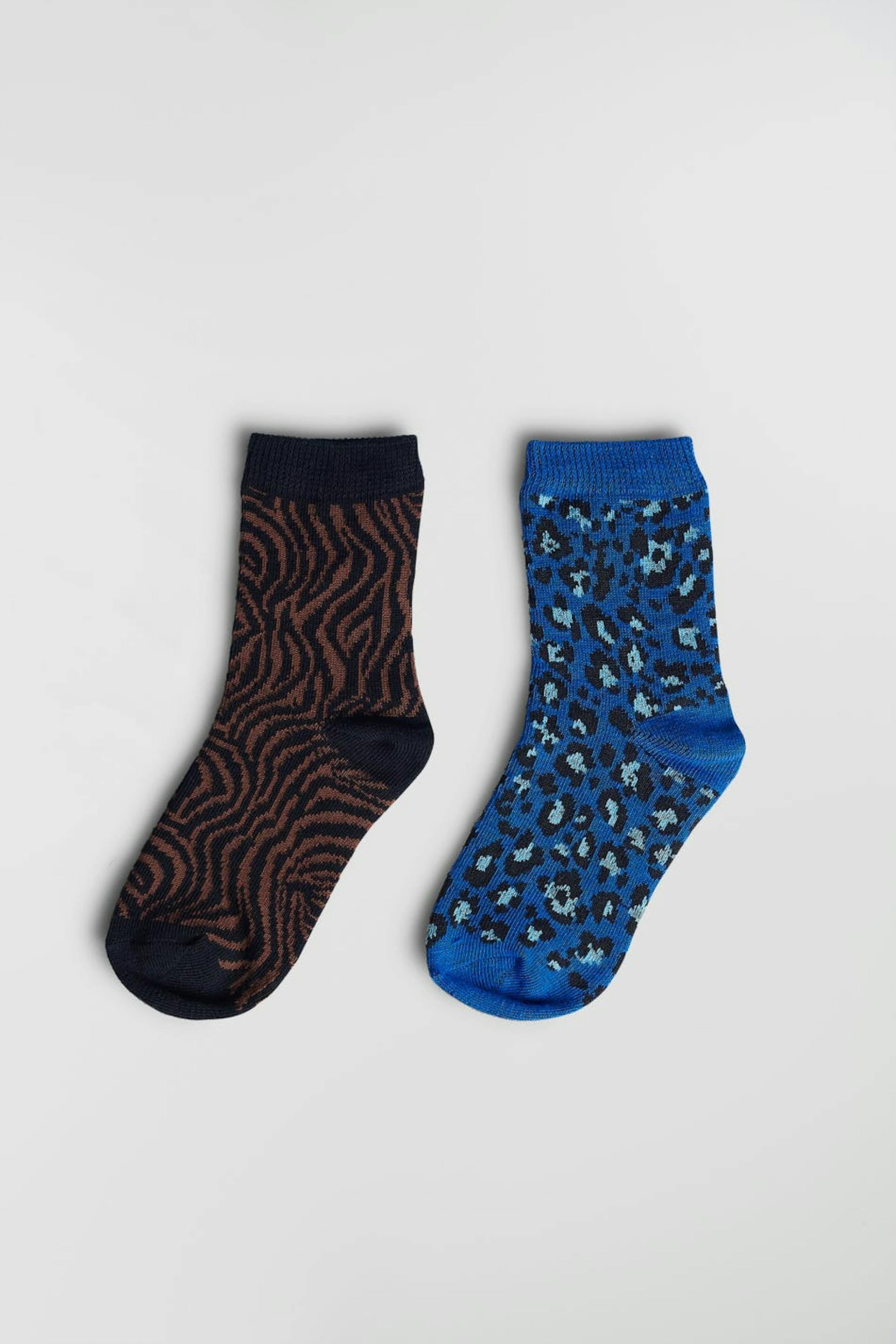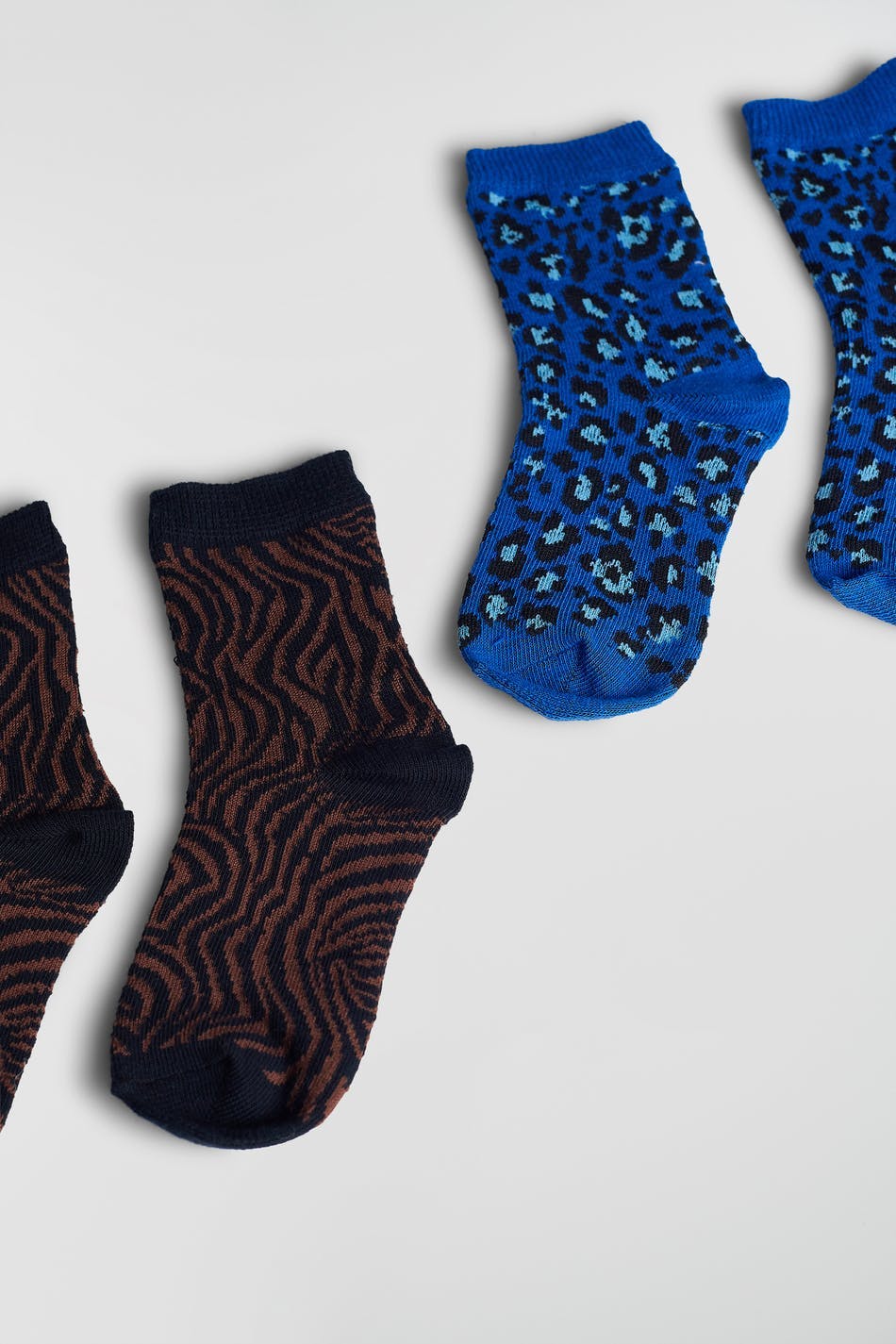 Socks for children with a leopard pattern. Blue, brown, black and zebra patterned.