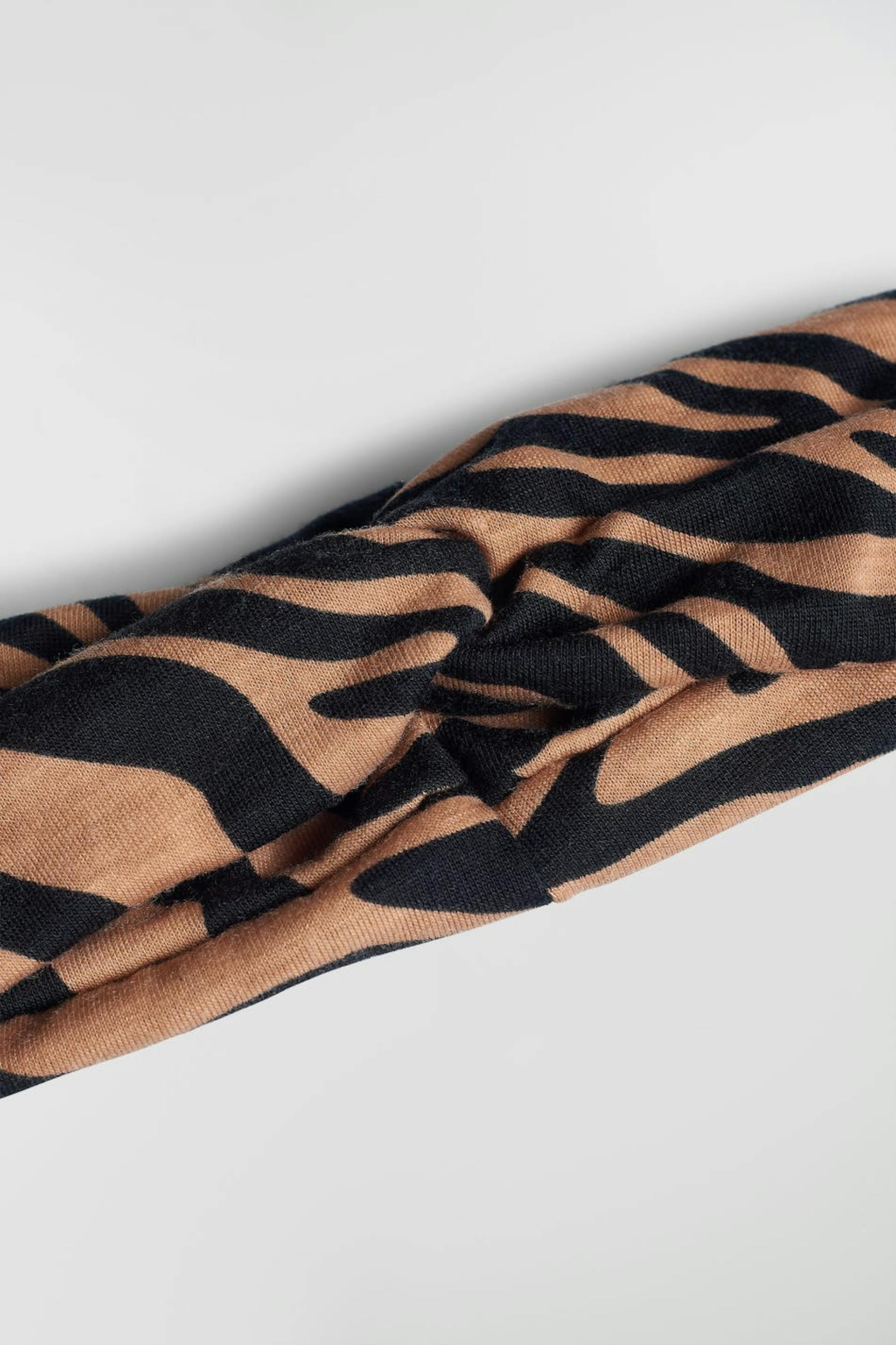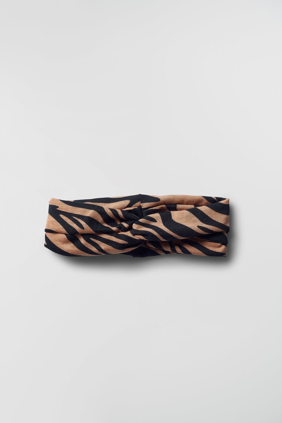 Zebra patterned hairband for children with a twisted detail. The accessory is brown and black.