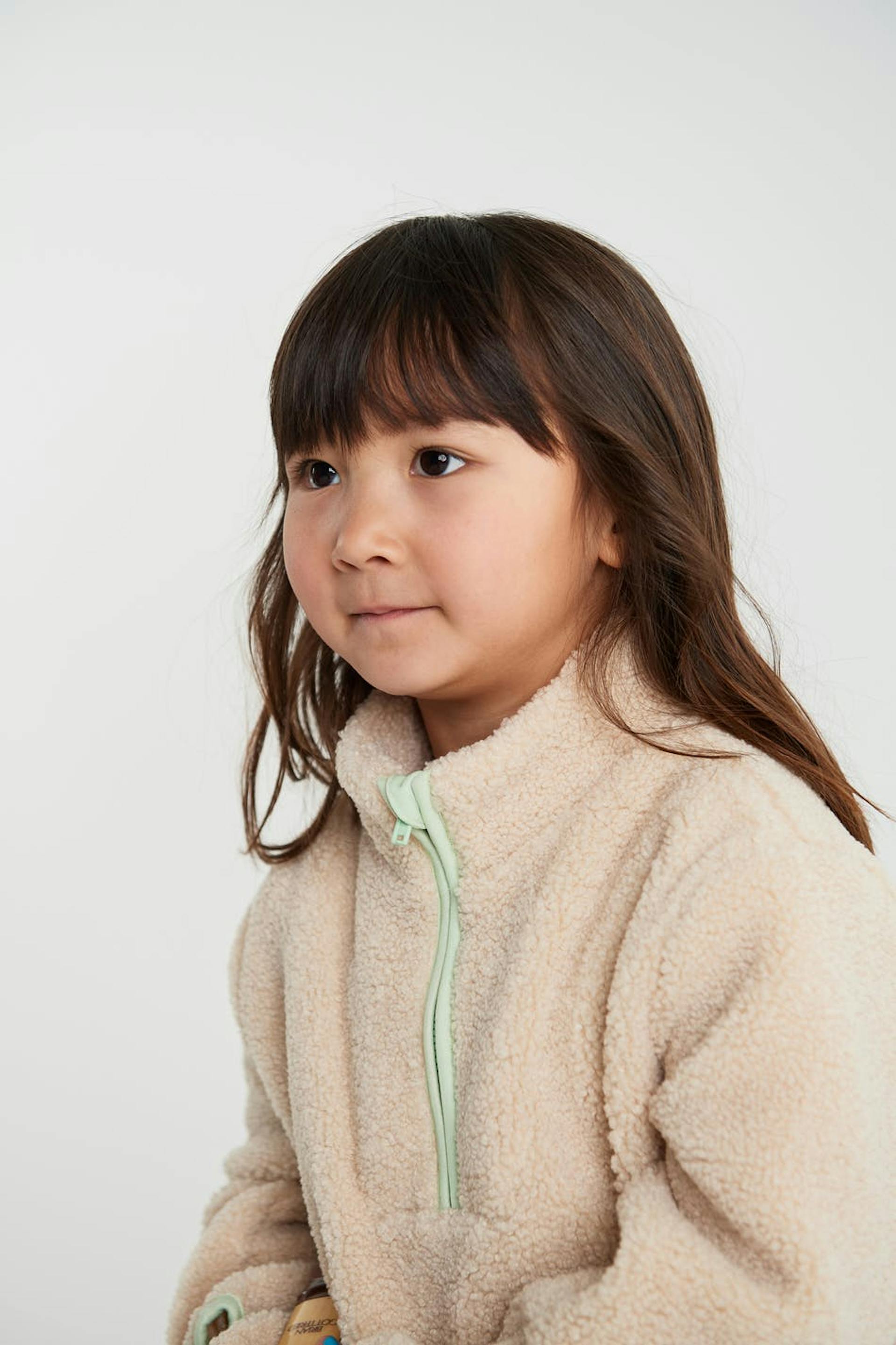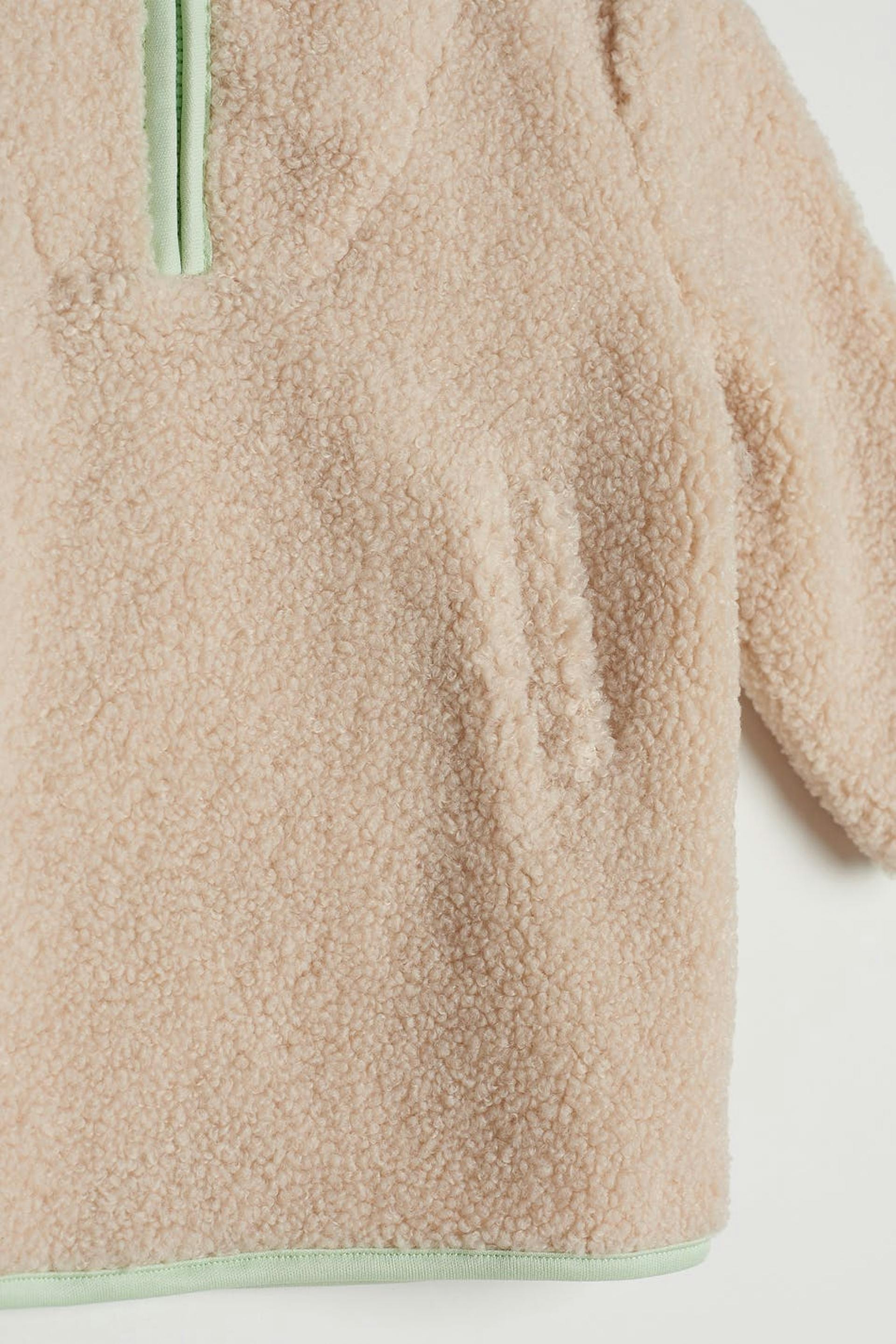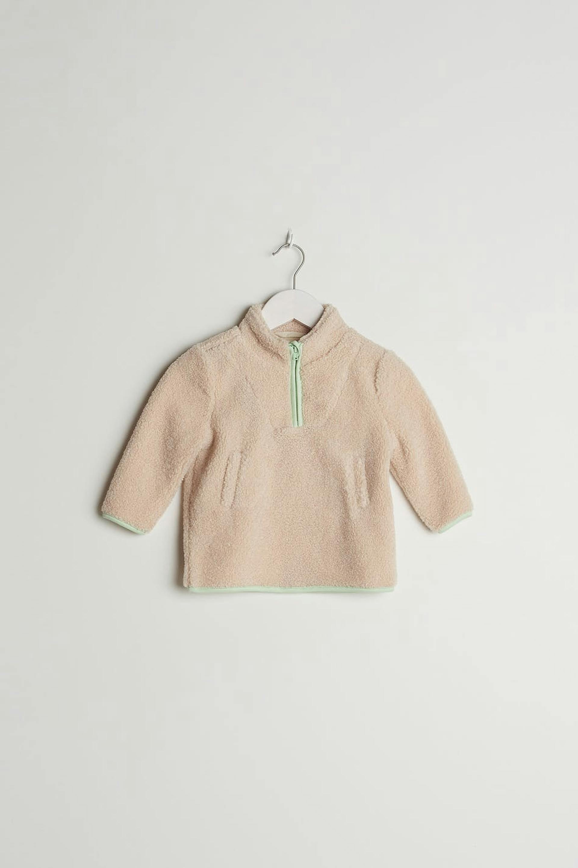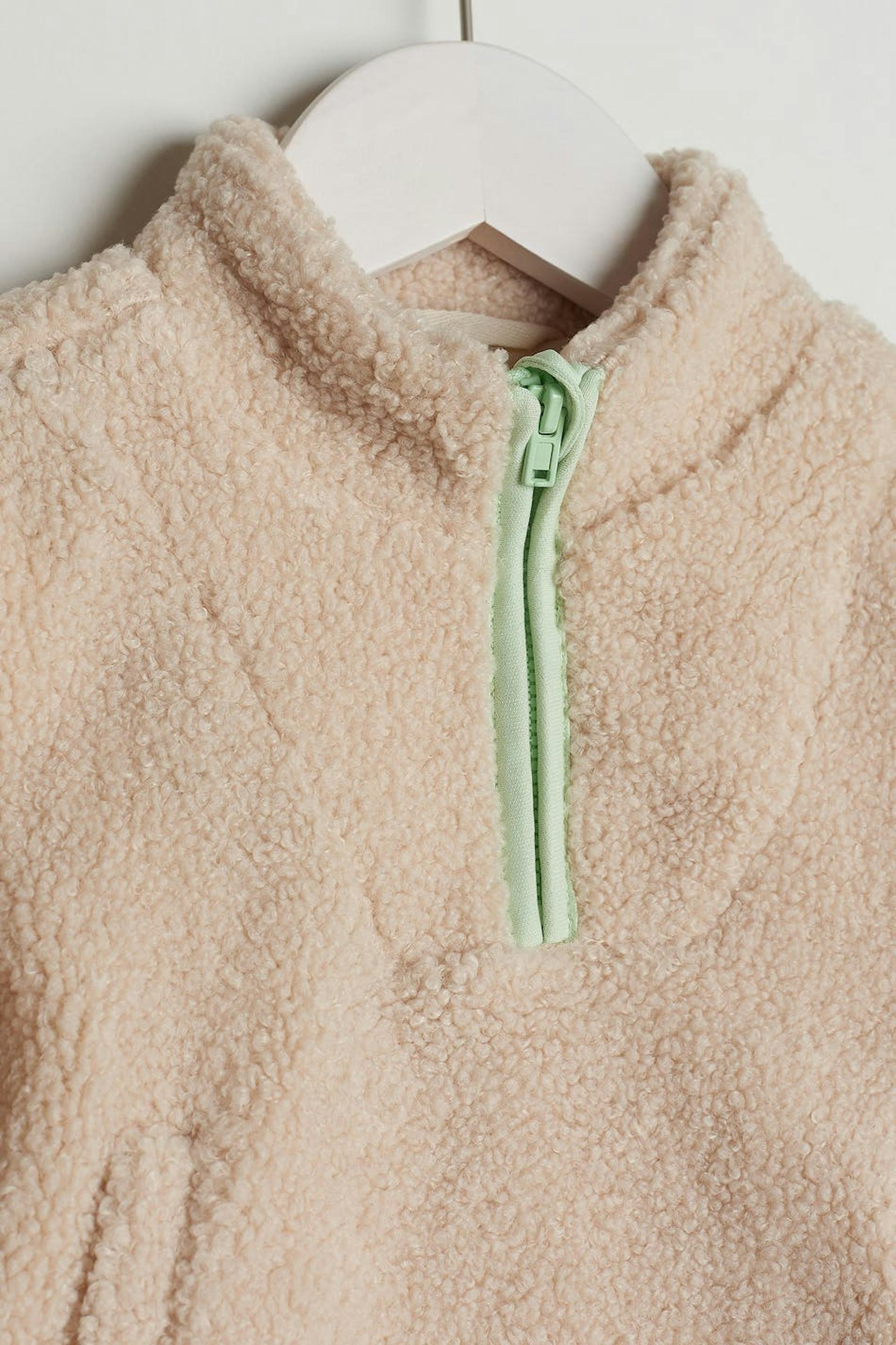 Unisex jacket for babies with an oversize fit. The jacket is beige and has a teddy material. It has a high neckline with a zip to the neck and pockets at the front.