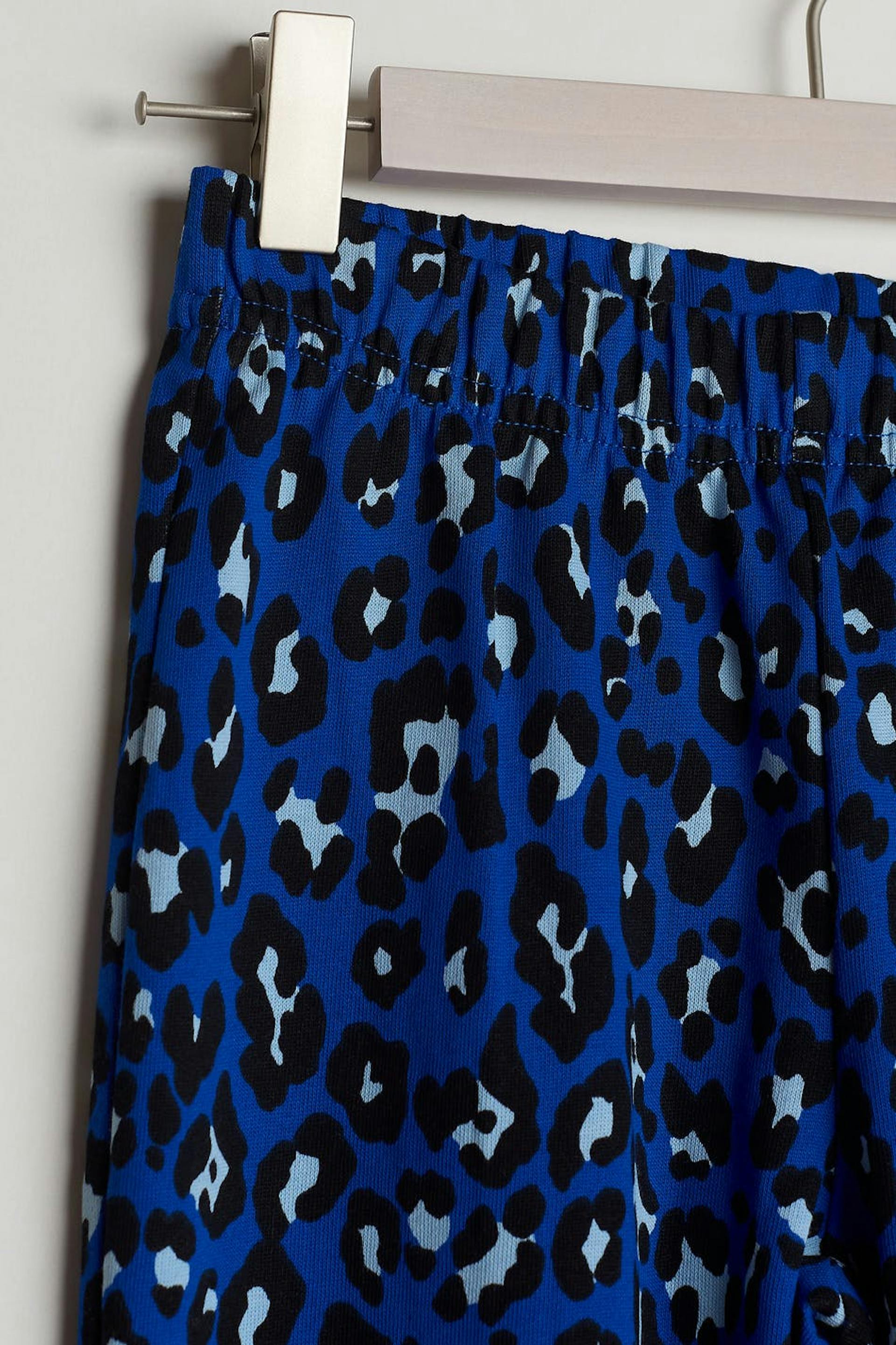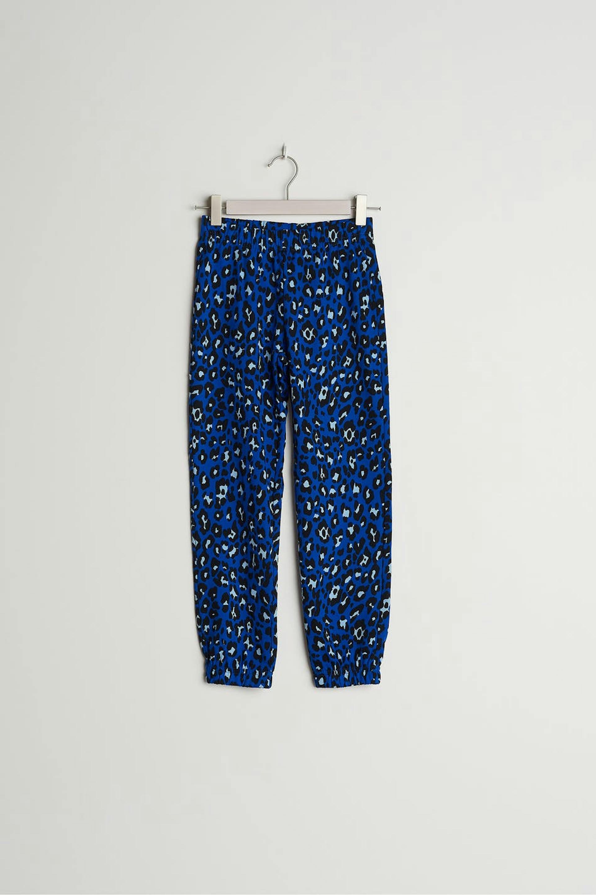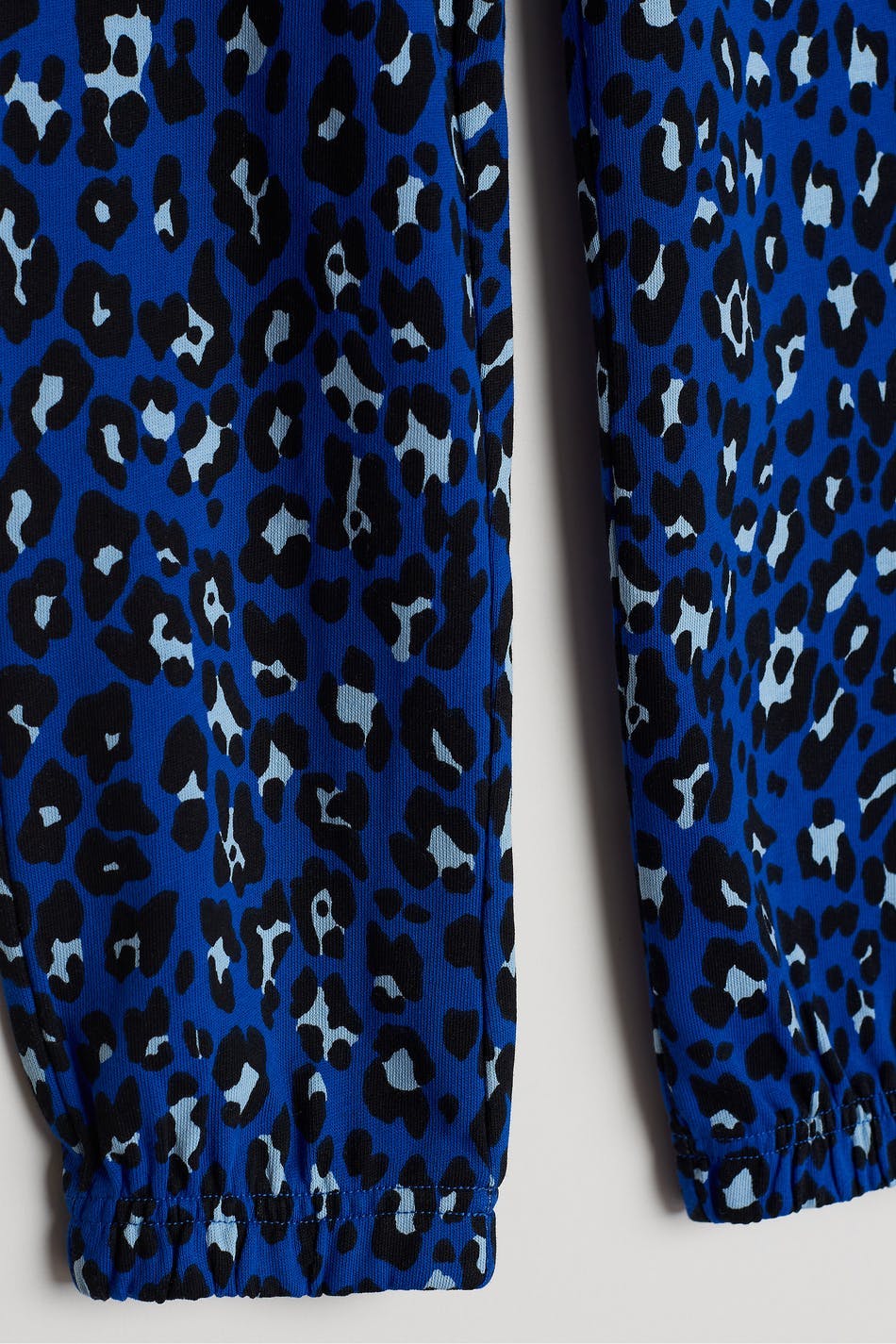 Unisex tracksuit trousers for children with a regular fit. The trousers are blue and leopard and have a soft elastic at the waist and at the end of the legs.