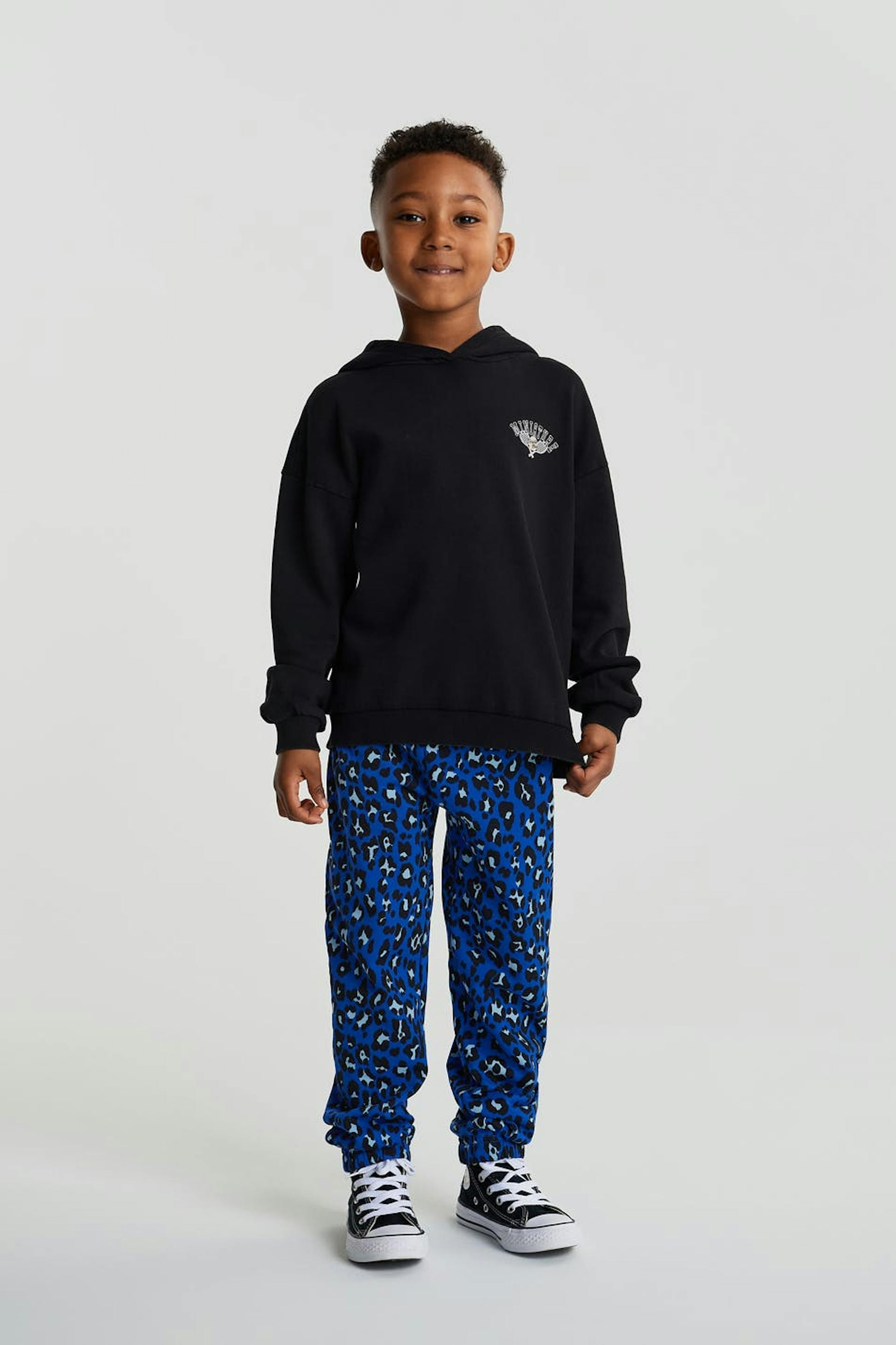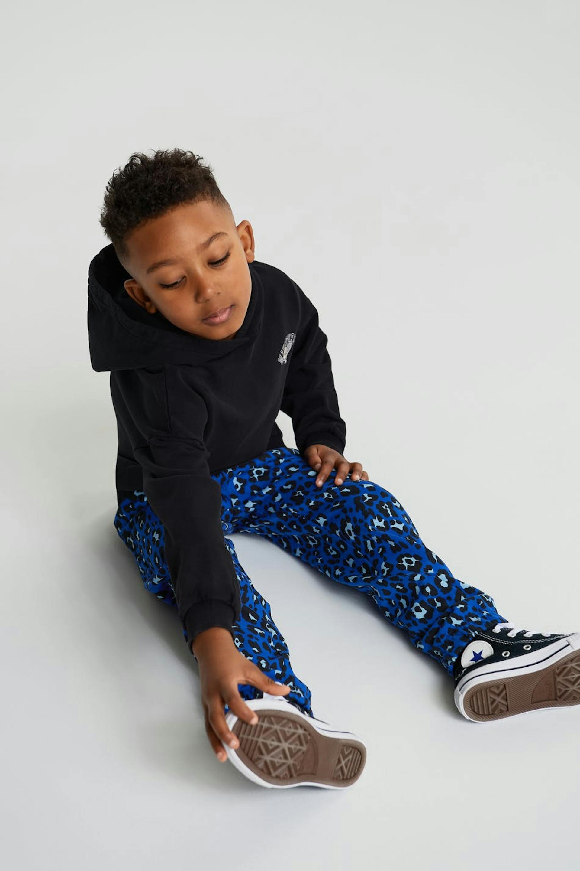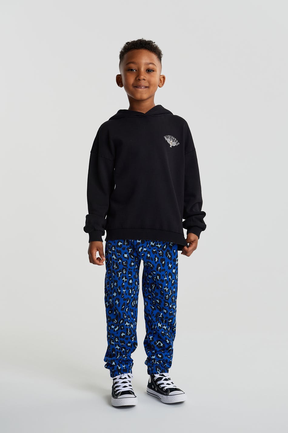 Unisex tracksuit trousers for children with a regular fit. The trousers are blue and leopard and have a soft elastic at the waist and at the end of the legs.
