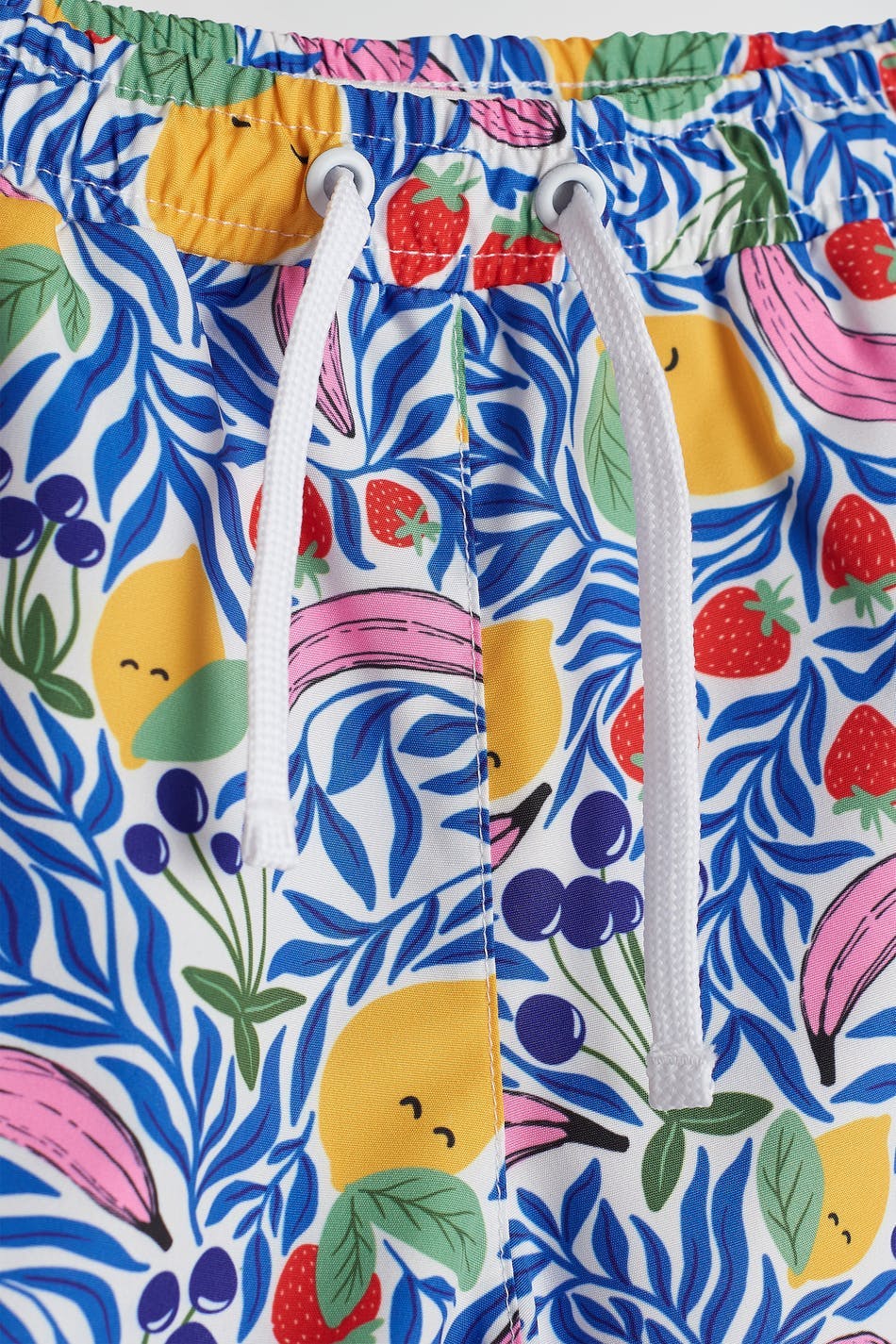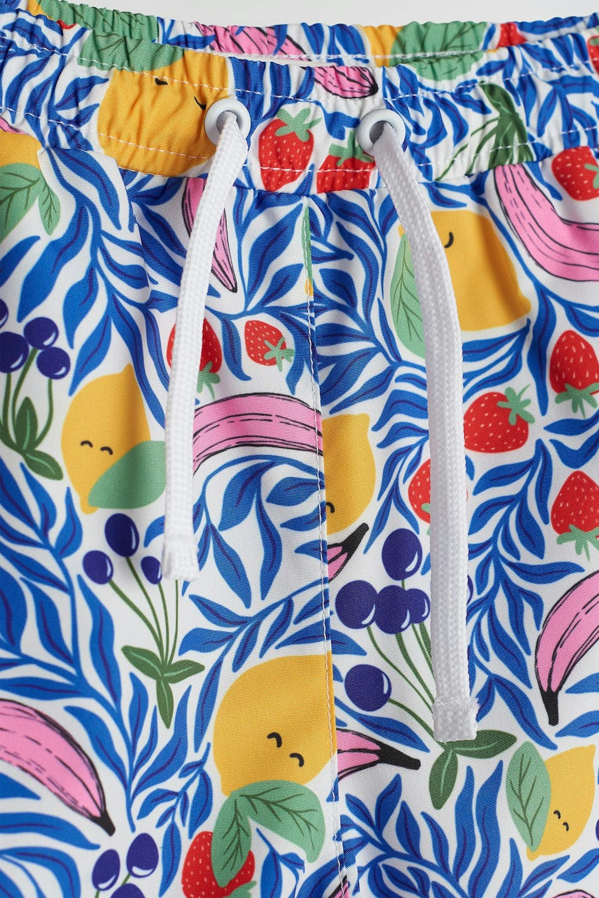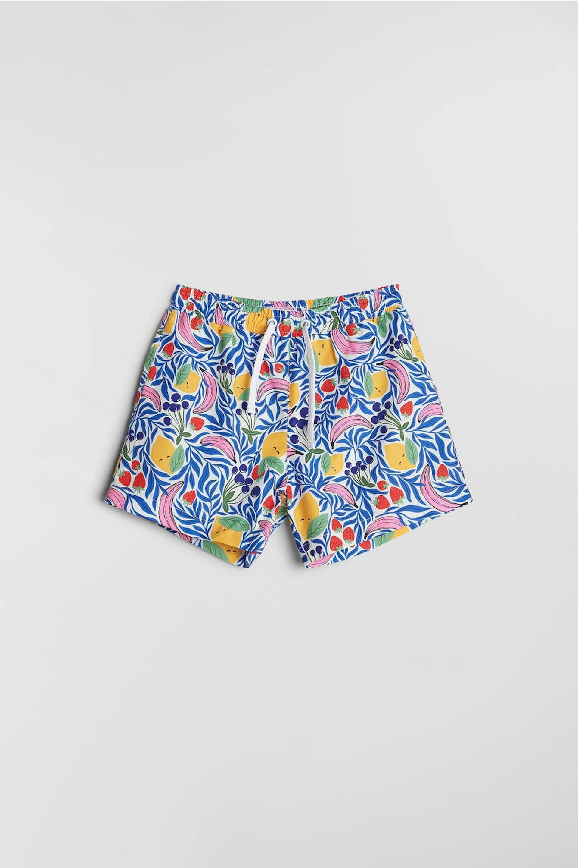 Bathing shorts for children with a pattern. The bathing shorts are blue and have a waist in elastic with a tie strap.