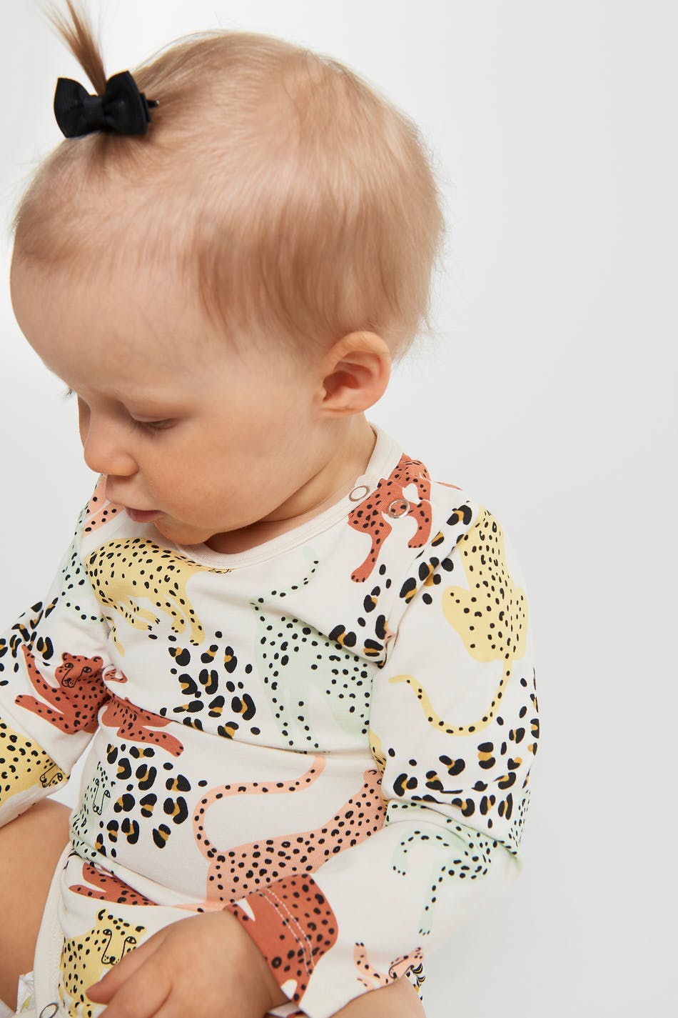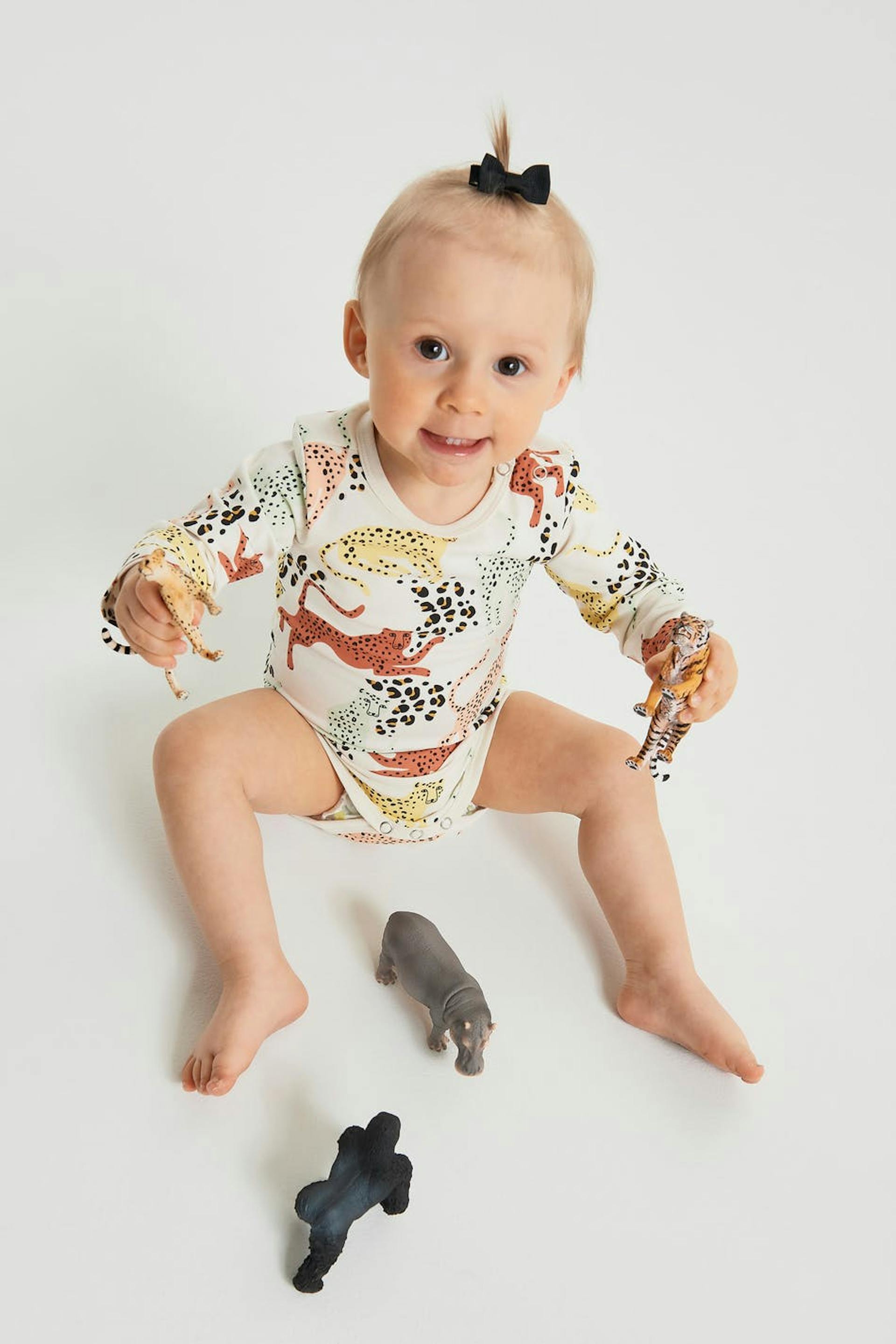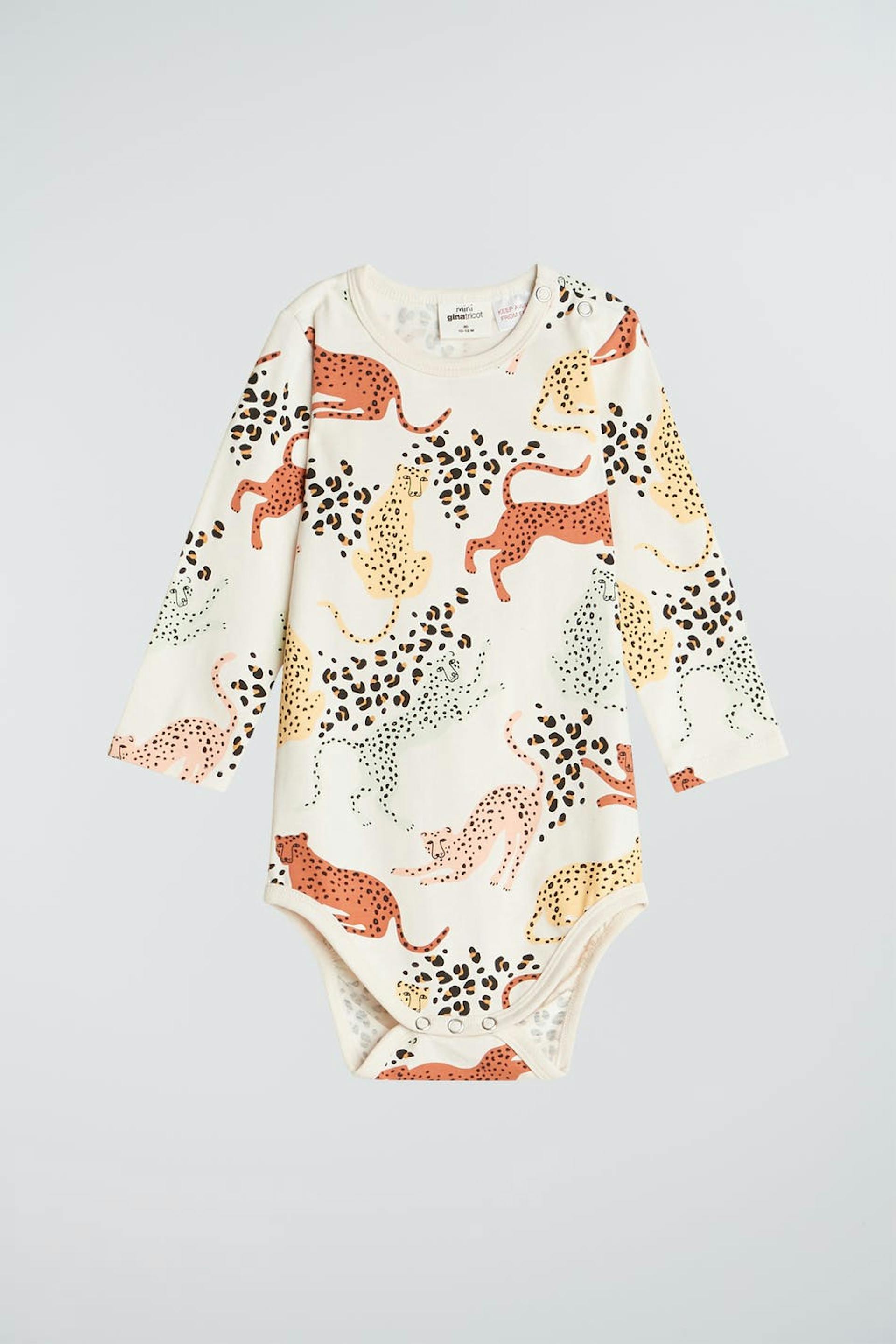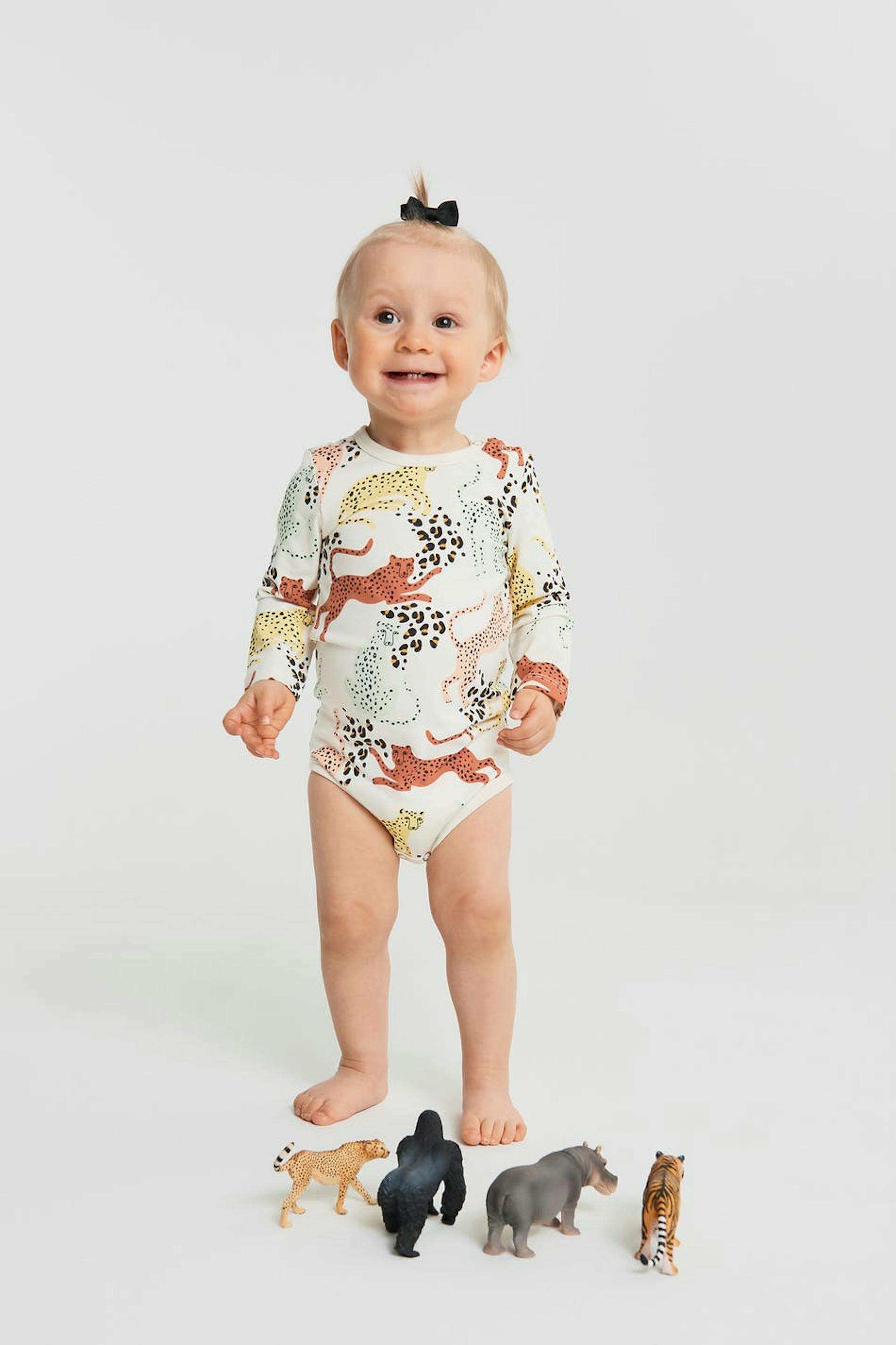 Long-sleeved body for babies with snap buttons on one shoulder and at the crotch. The body is white and patterned. It is made of jersey.