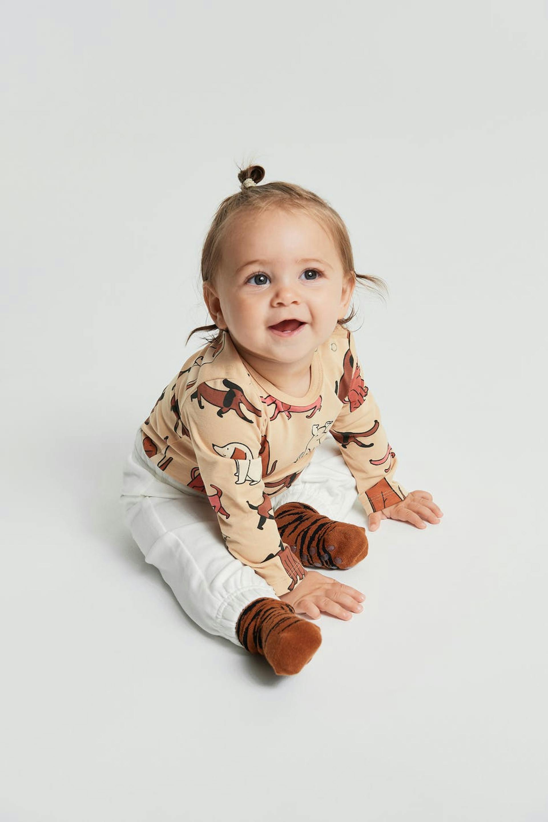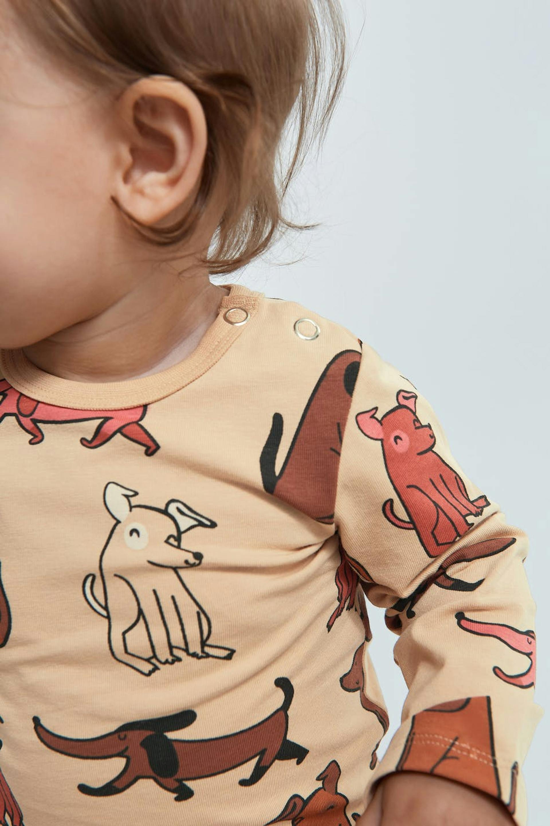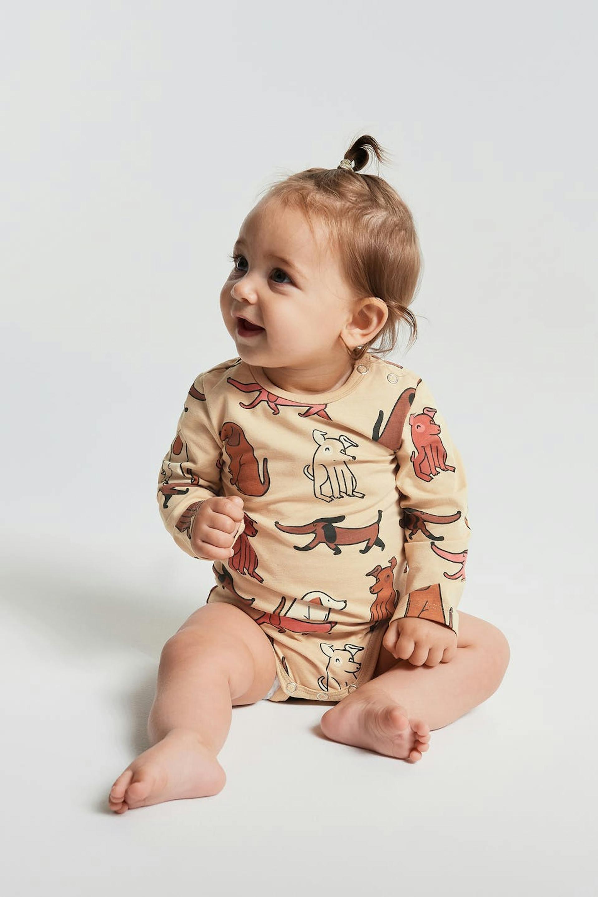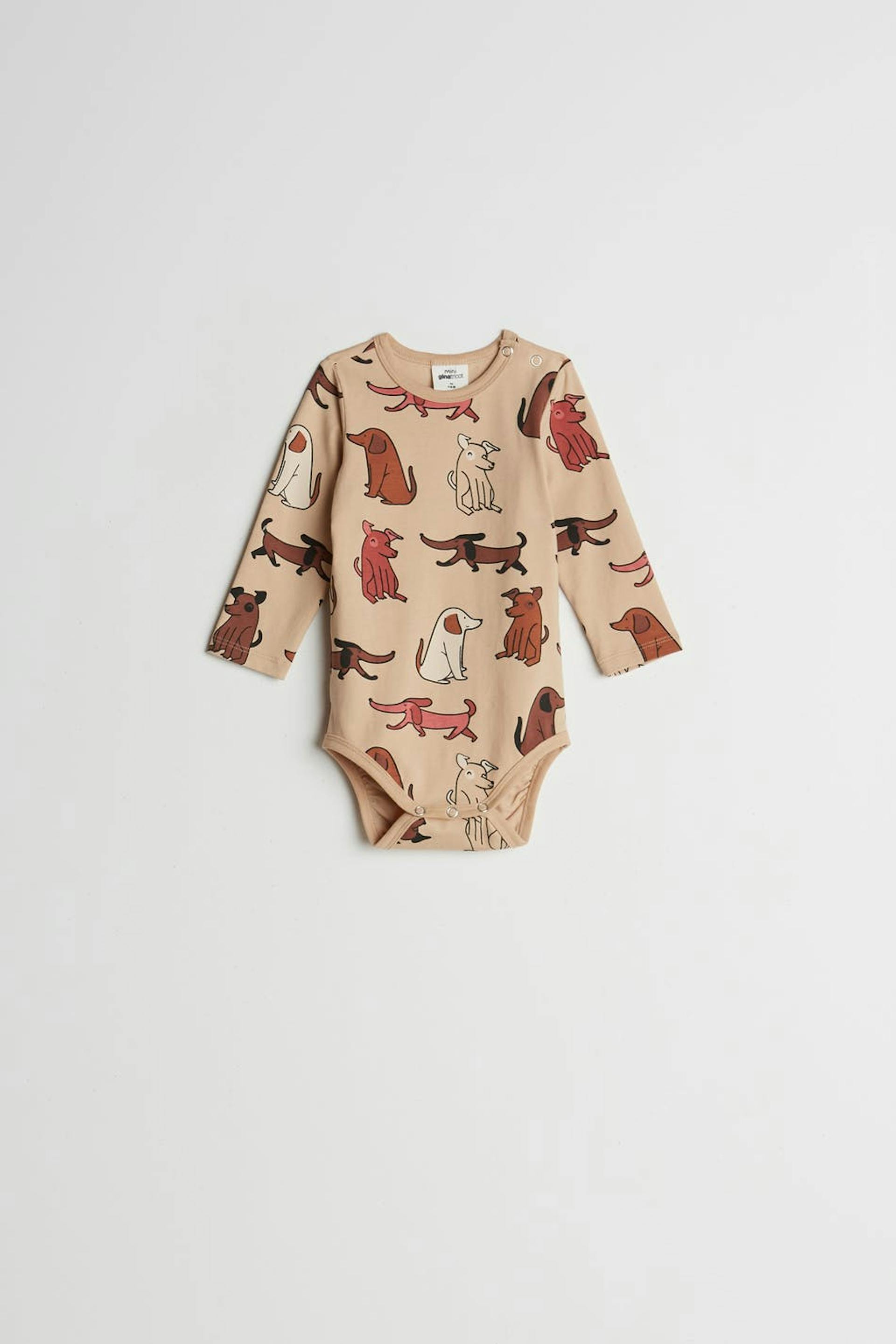 Long-sleeved body for babies with animal print all over. The body is beige and has snap buttons on one shoulder and at the crotch. It is made of jersey.
