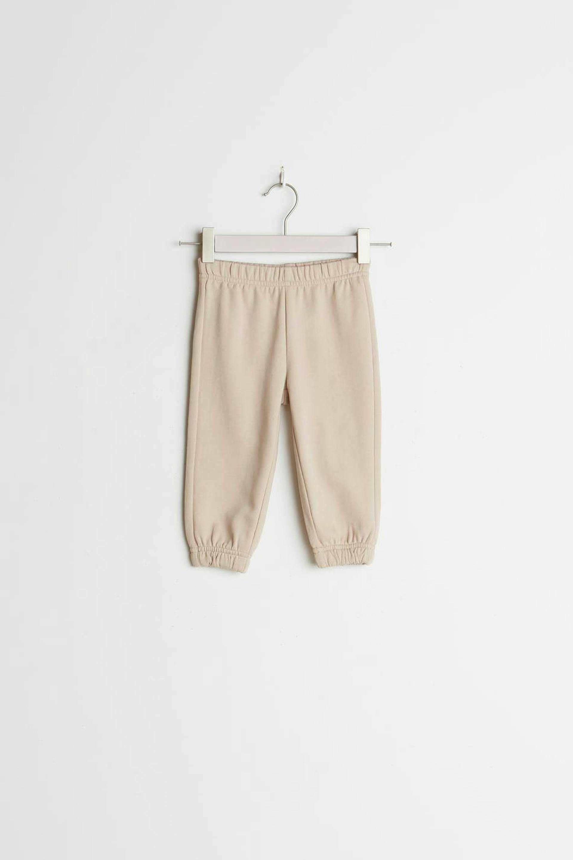 Tracksuit trousers for babies with an elastic band at the waist. The trousers are beige. They are made of tricot.
