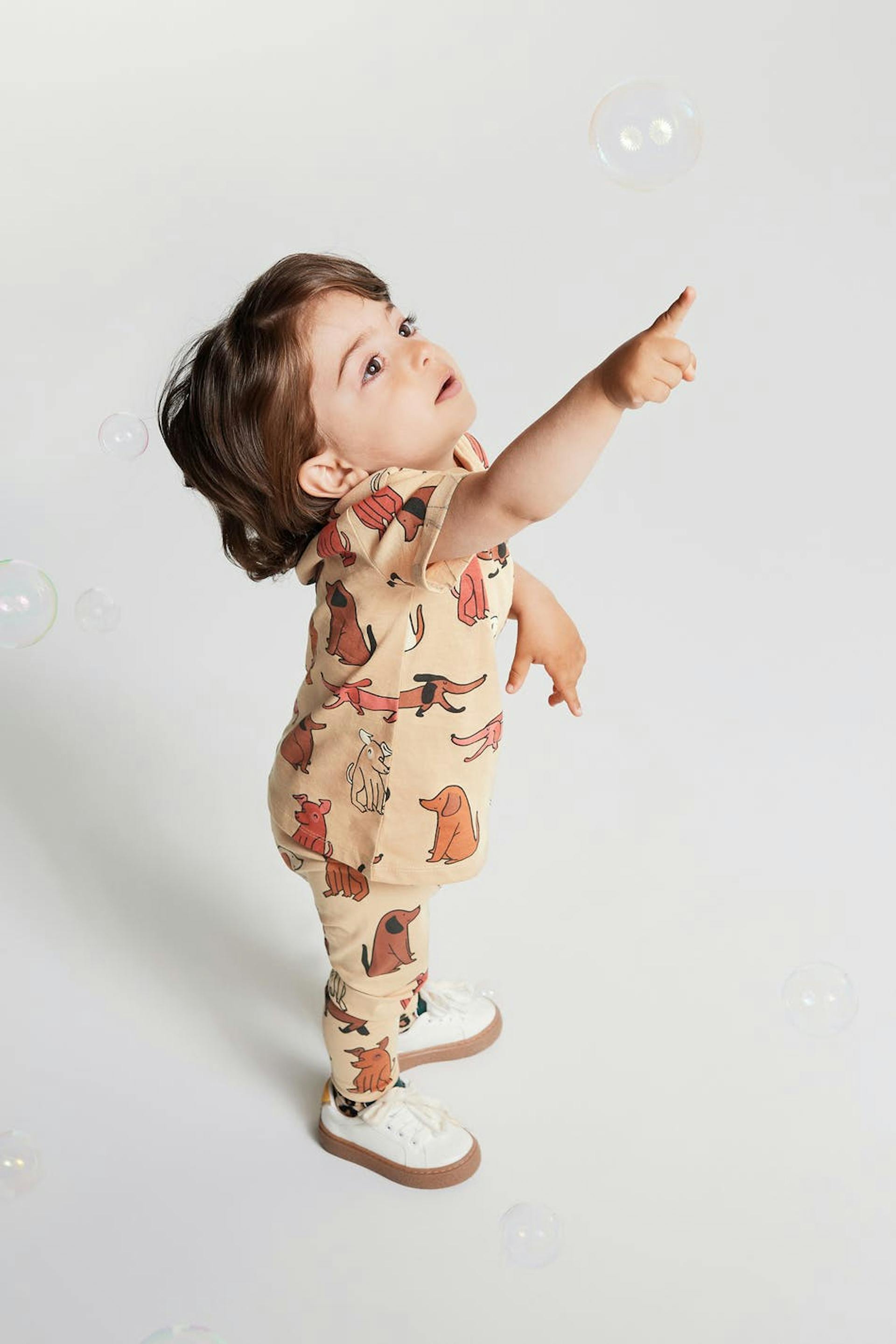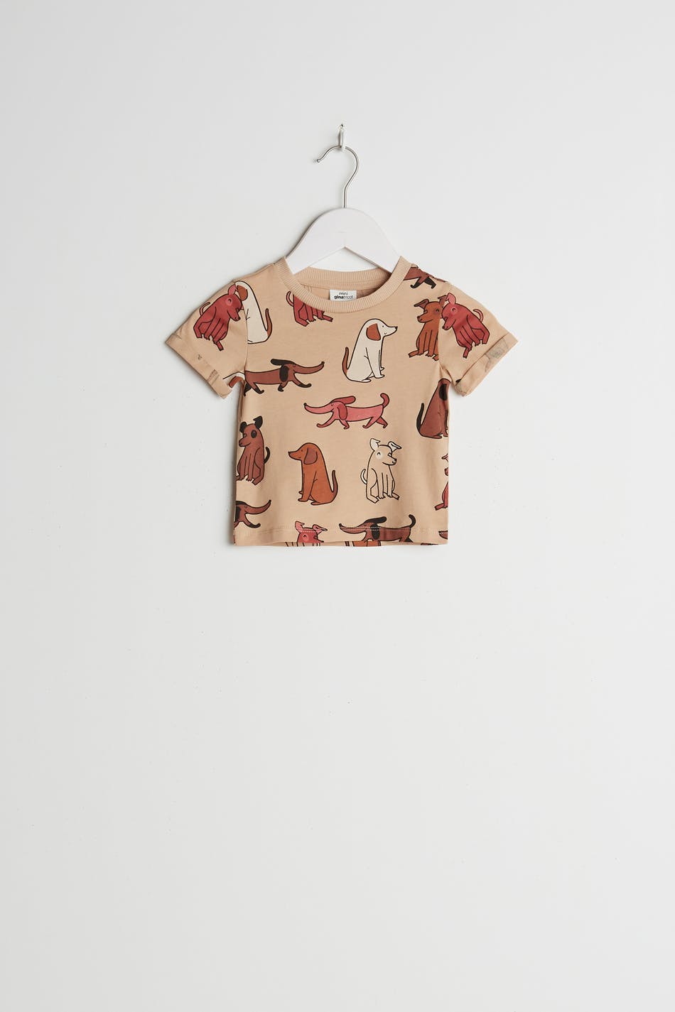 Short-sleeved t-shirt for babies with a normal fit. The t-shirt is beige and has an animal print all over.